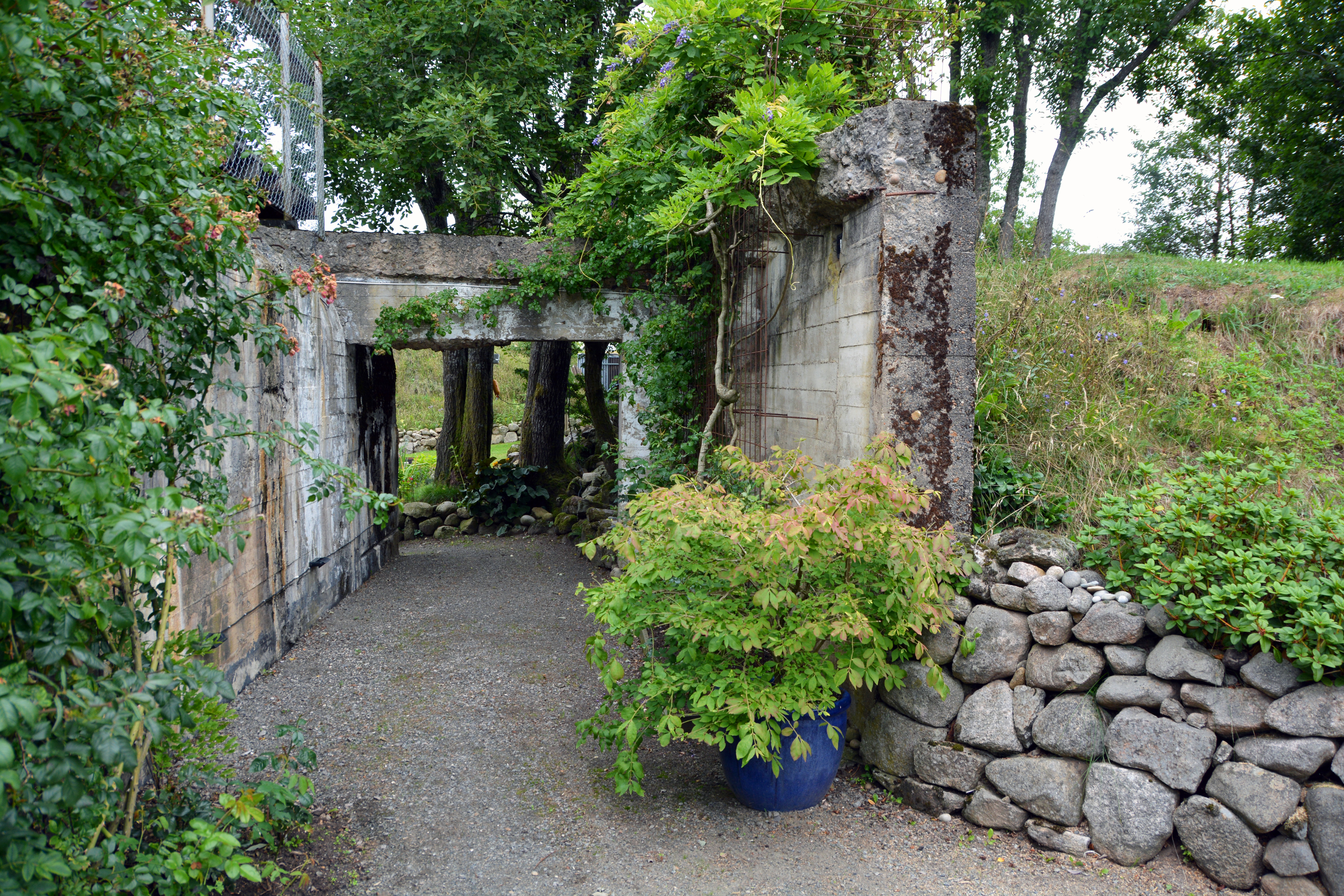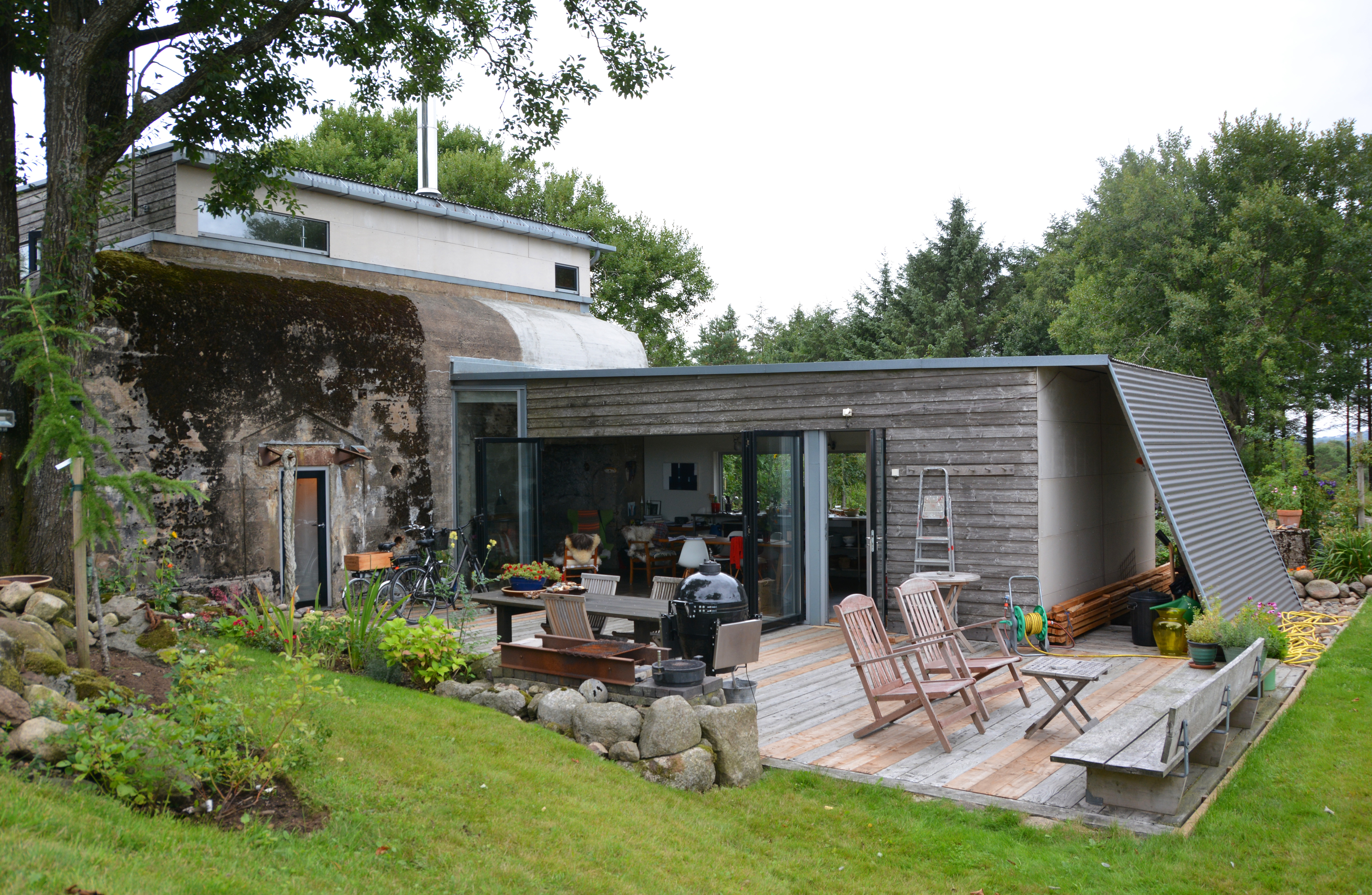 Det var ingen liten oppgave de gikk løs på den sommeren i 2000. Vi har flyttet oss fra inngangspartiet, og står foran påbygget, et allrom med store glassflater, i sterk kontrast til den lukkede bunkeren. Randi blar meg igjennom en liten fotosamling, her er hele prosessen trinn for trinn. Det første bildet viser en mer eller mindre overgrodd betongklump med en liten løe på toppen, slik det så ut første gang de kom hit til denne plassen og så potensialet.