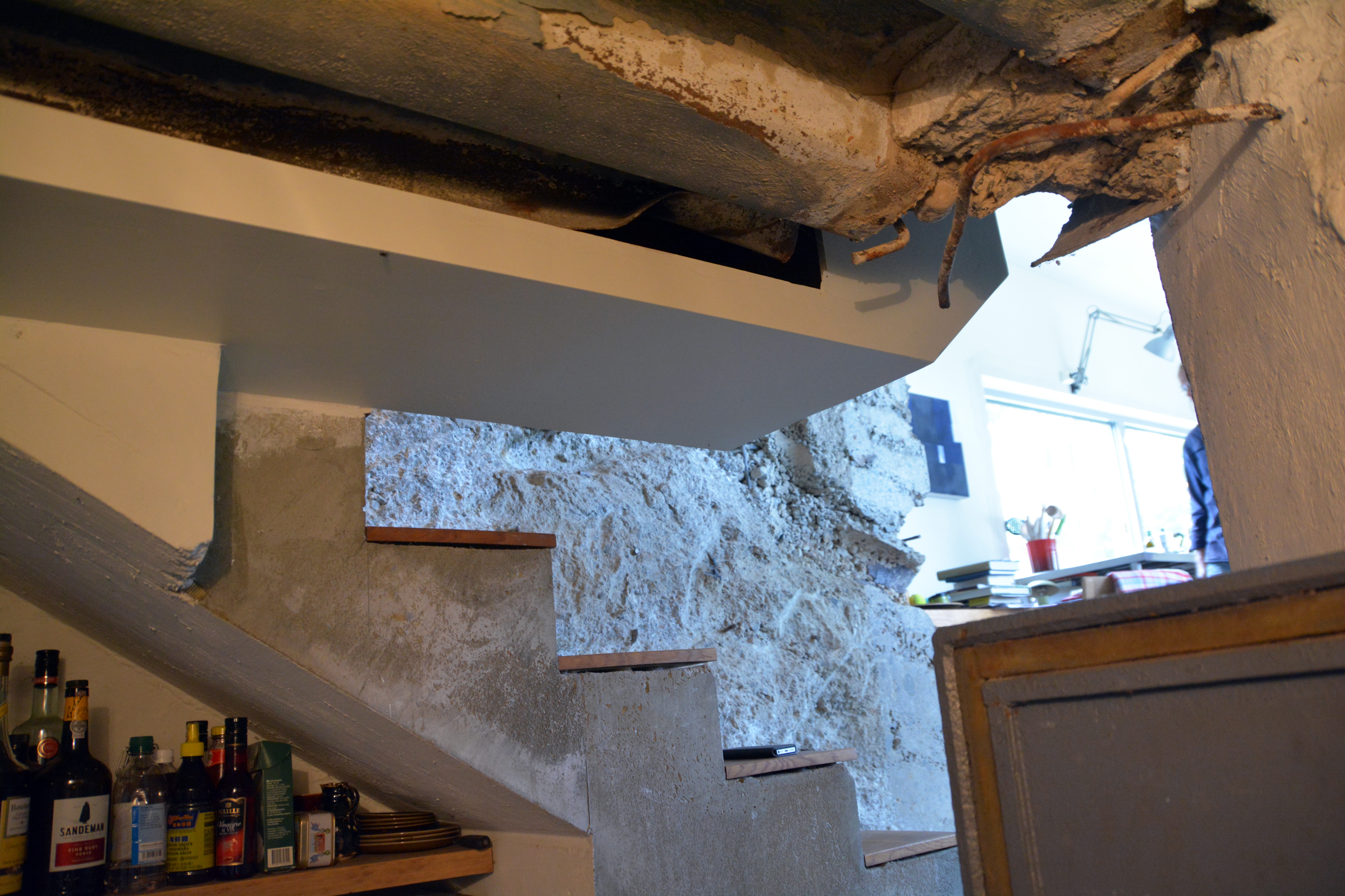 Bunkeren hadde sine to opprinnelige innganger, men det var ikke nok. Det trengtes en større åpning for å binde sammen bunkeren og det store påbygget som skulle romme kjøkken, bad, peis og forbindelse til trappeløpet opp i det som skulle bli andre etasje. To uker tok det et firma å slå seg gjennom og fjerne nok armert betong til å skape den åpningen som trengtes. Den siste biten valgte firmaet å fjerne med dynamitt, noe som skulle skape bygningsskader de lever med den dag i dag.