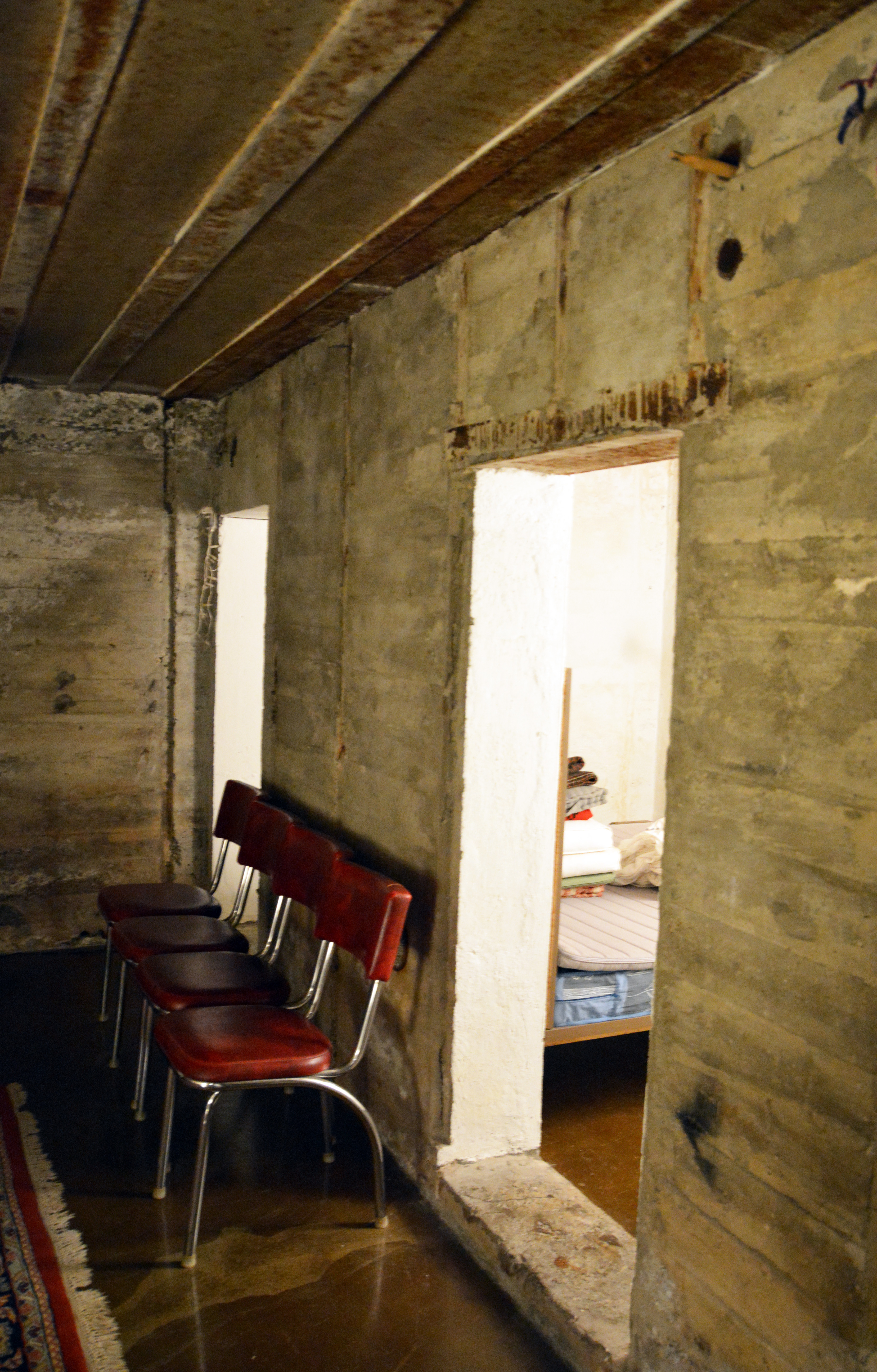 Hva hadde jeg så forventet meg av en arkitektmodifisert tysk bunker fra 1943? Hvitkalket minimalisme? Malte trepaneler? Eller tepper på veggene, for hyggens skyld? Ja, alt det kunne jeg forestilt meg, men kanskje ikke akkurat det som faktisk møter meg: Mer betong, ubehandlet og brutal, biter av rør, armeringsjern som stikker ut. Her er nye, pussede flater som møter ru, dryssende betong. Men midt i alt dette noe forunderlig levende og kunstferdig: Den allestedsnærværende betongen er full av sjatteringer, her kan en se spillet i ulike typer sand som er brukt i støpingen, sand hentet fra ulike steder lokalt. Her er spor av salt som gjennom årene har sivet ut gjennom betongen med fuktigheten. Veggene er fulle av liv, som kunstverk enkelte steder.