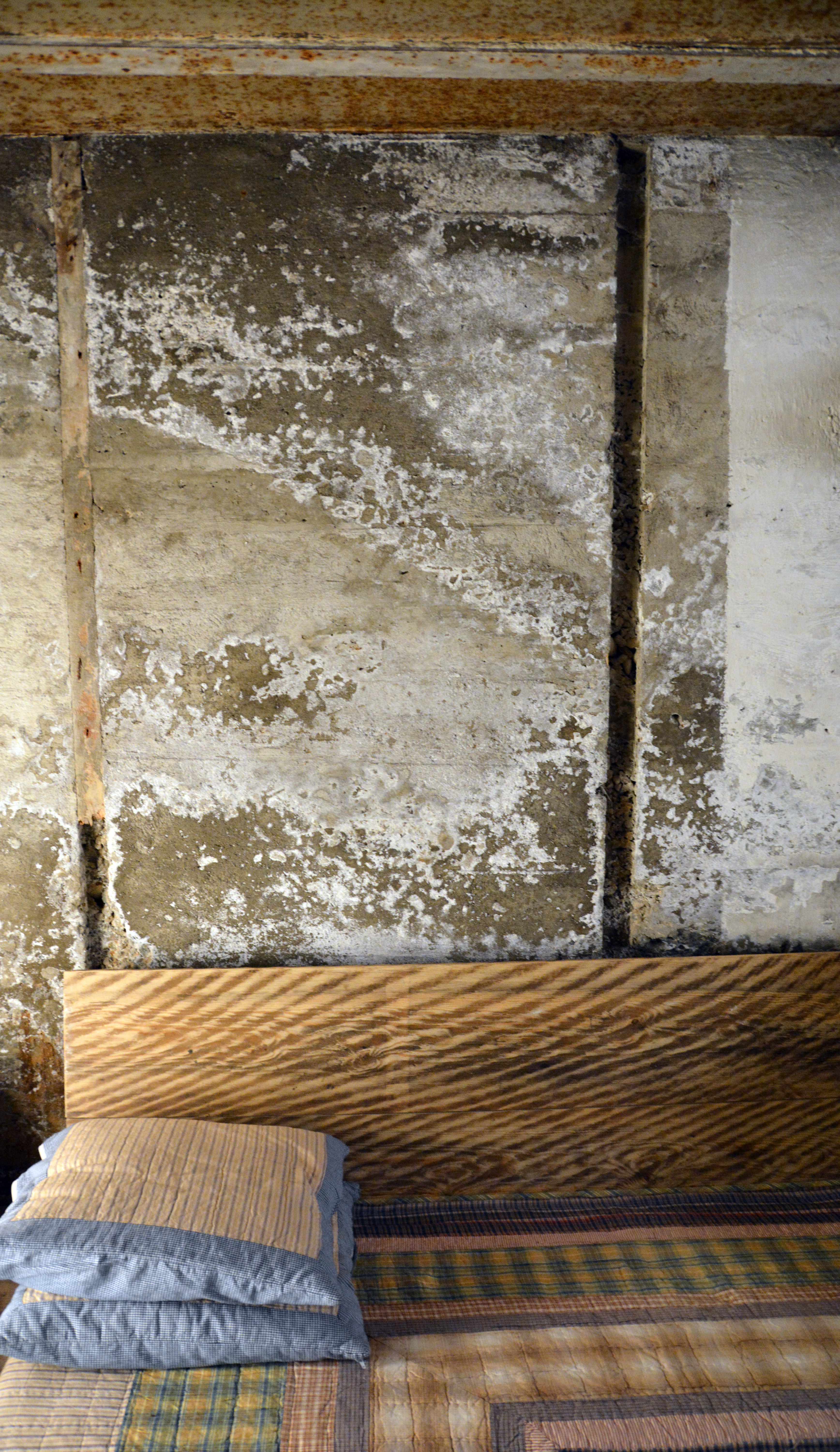 Spor som den tunge blå døren i 50 mm panserstål – enhver kan jo få et snev av klaustrofobi innelåst bak den – betongveggene i seg selv, armeringsjernet, alt dette vitner om et bygg som er reist som et forsvar, med voldelige hensikter, uten spor av menneskelighet. Men ut over det er det ingenting som åpenbart forteller noe om krigen. Selv synet av de massive ytterveggene, når betraktet fra den frodige hagen med blomster, grønnsaksbed og matestasjoner for fuglene, får i alt sitt forvitrende, mosegrodde velde en egen estetikk. De sporene som finnes må tolkes, eller man må kjenne deres opphav og bakgrunn. Som noen beskjedne kvadrater av treverk i betongen oppe i andre etasje, den ene rundt 40x40 centimeter, de to mindre 10x10 cm. Jeg lar umiddelbart hånden gli over dem, det myke materialet skiller seg ut fra all den harde betongen, og jeg ser spørrende på dem begge.