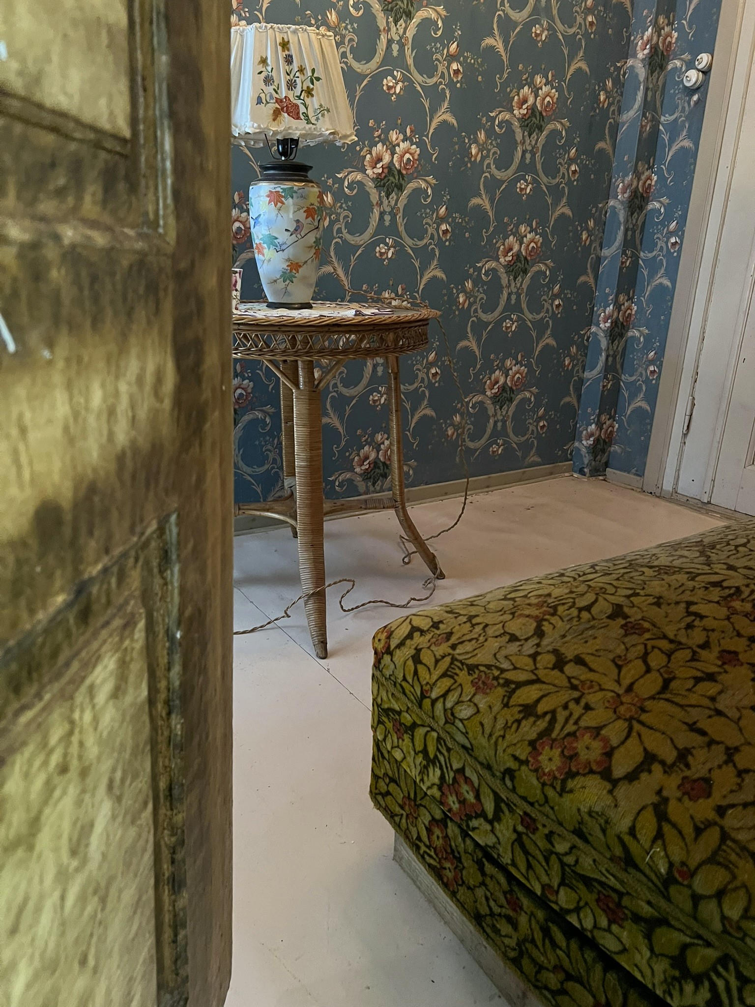 – Se bare på fargene, det er et system her. Blomstrete linoleum, blomstrete tapet. Gul linoleum, gul vegg. Rommene snakker til hverandre. Det kan jo være bestemoren min som bestemte noe, men det er en helhet her som jeg mistenker er resultat av et dyktig malerblikk.