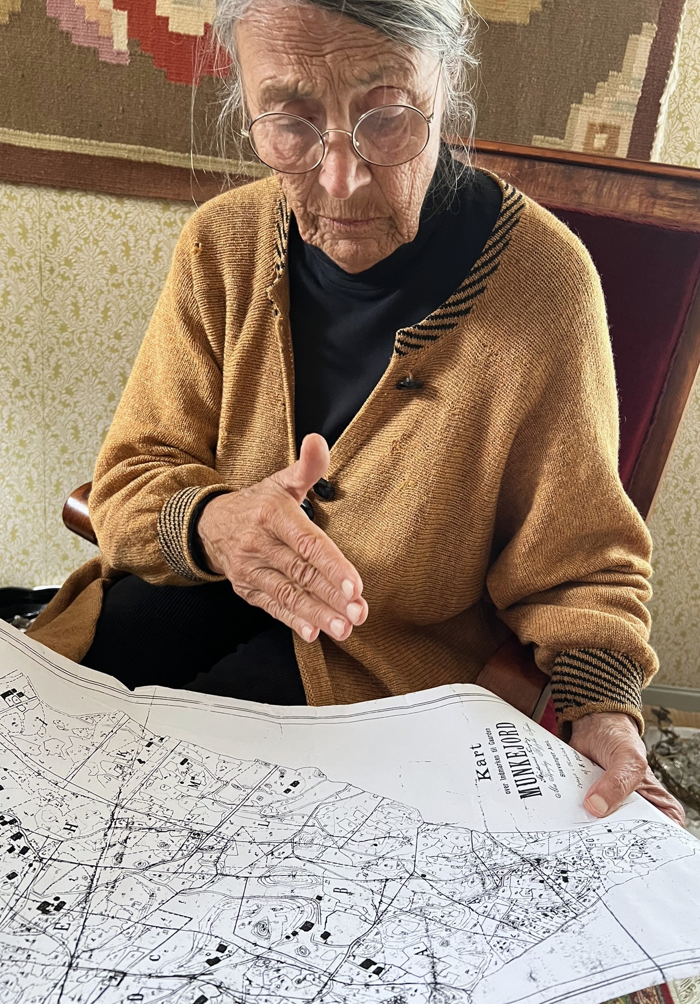 Connie Didriksen sirkler området med pekefingeren på kartet på bordet foran seg, et kart hun kjenner hver kvadratcentimeter av, av gårdene i Munkejord i 1897. Vi sitter i stuekroken, eller salongen må vi vel kalle det nå, i burgunder plysjstoler under en vakker lysekrone som bare har rukket å henge der en knapp halvtime.