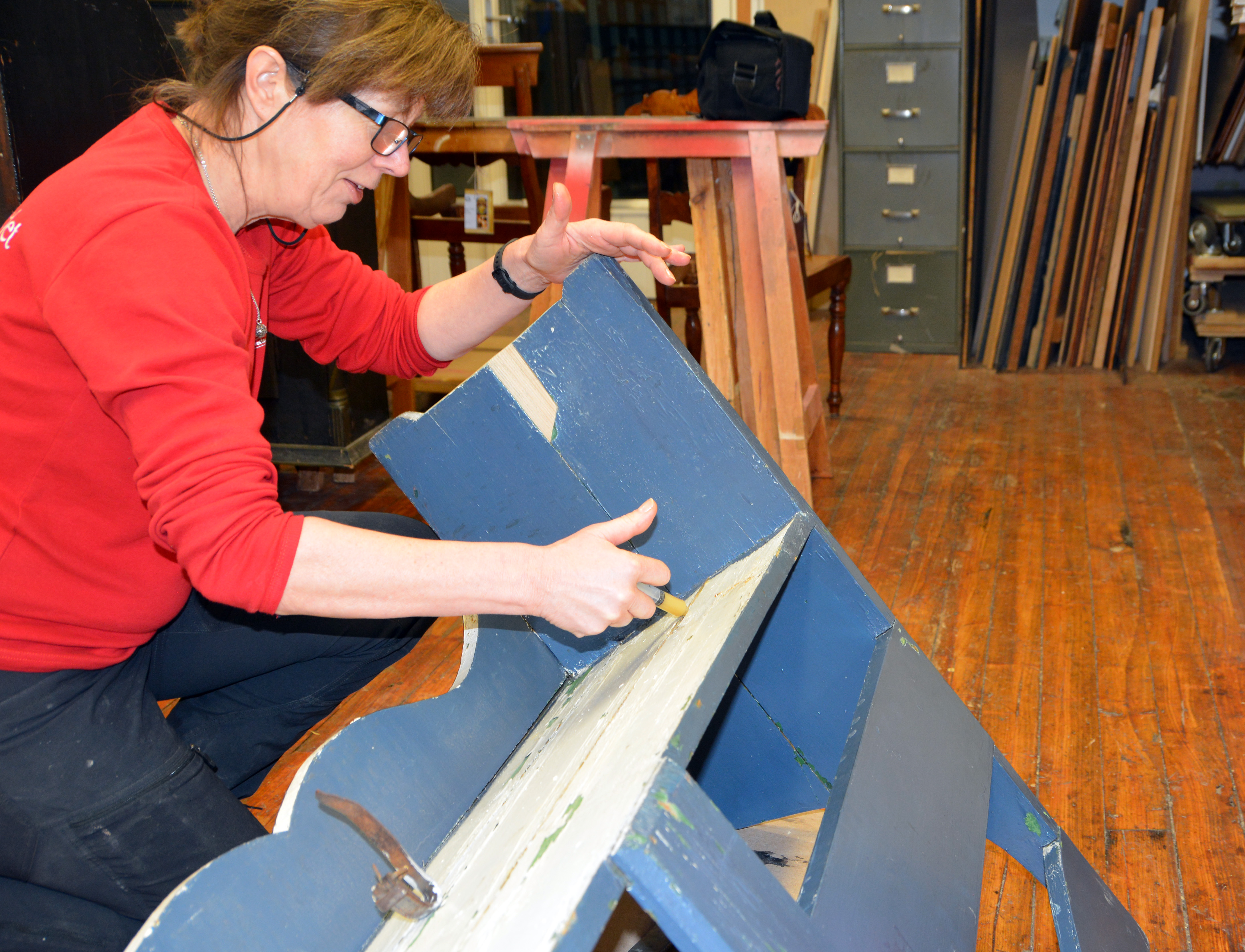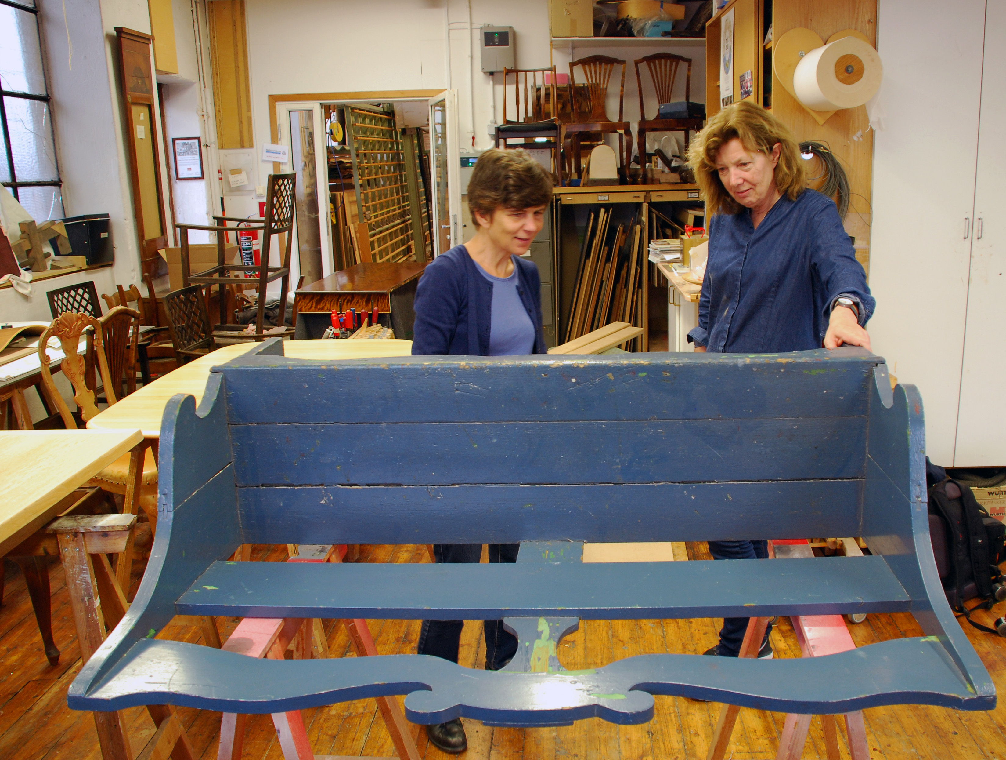 Vi er i Møbelverkstedet Restaurering på Grünerløkka. Her har det vært ulik verkstedsdrift siden 1890-tallet, og Hanne har holdt til her de siste 25 årene. Firmaet har flust med oppdrag, og har gjort arbeid for Slottet, Eidsvollsbygningen, museer og privatpersoner. Noen meter unna står en praktfull sofa med skinnende isgrønt trekk, et møbel som vanligvis pryder et værelse i et av landets gods. Kontrasten til vår blåmalte benk kunne knapt vært større.