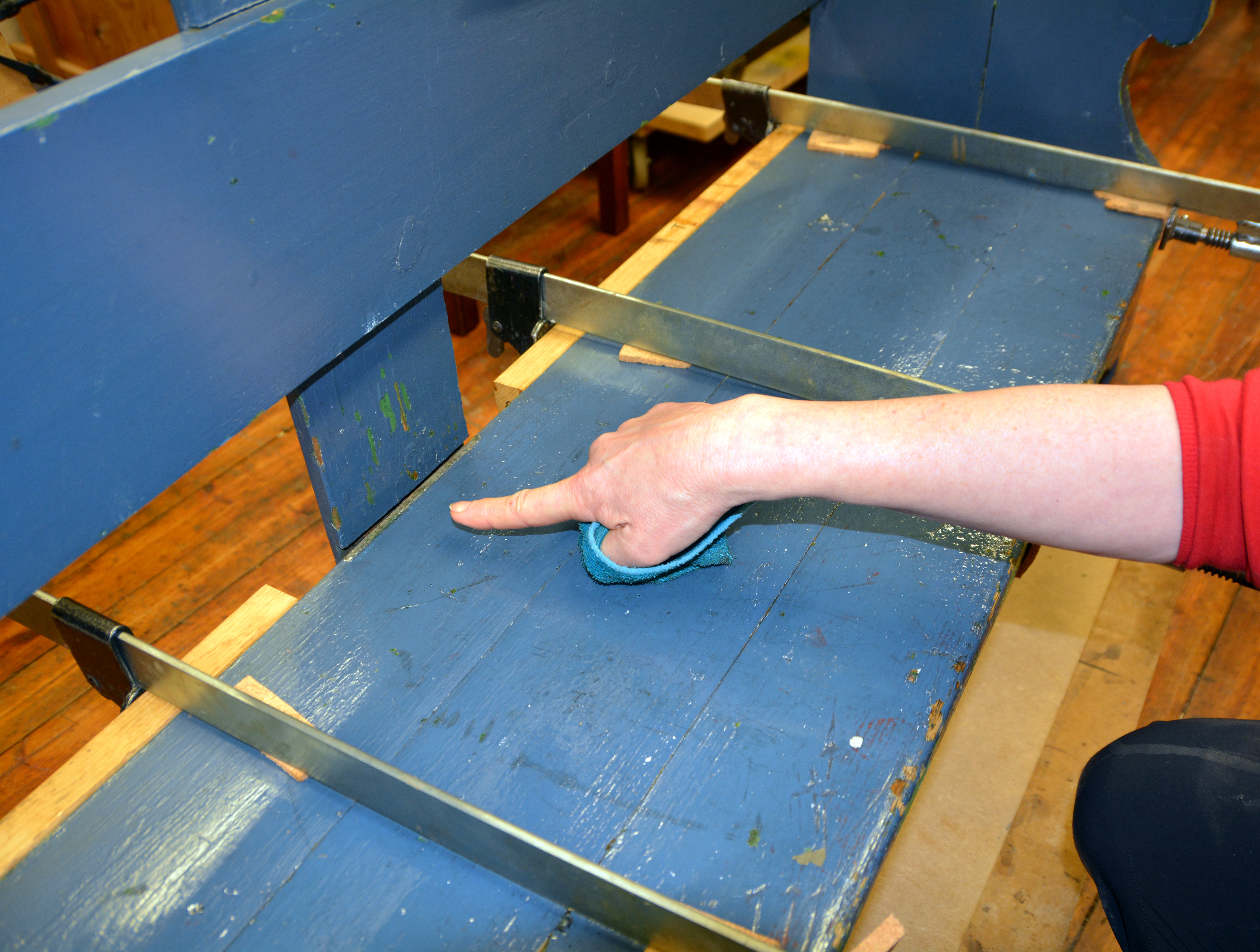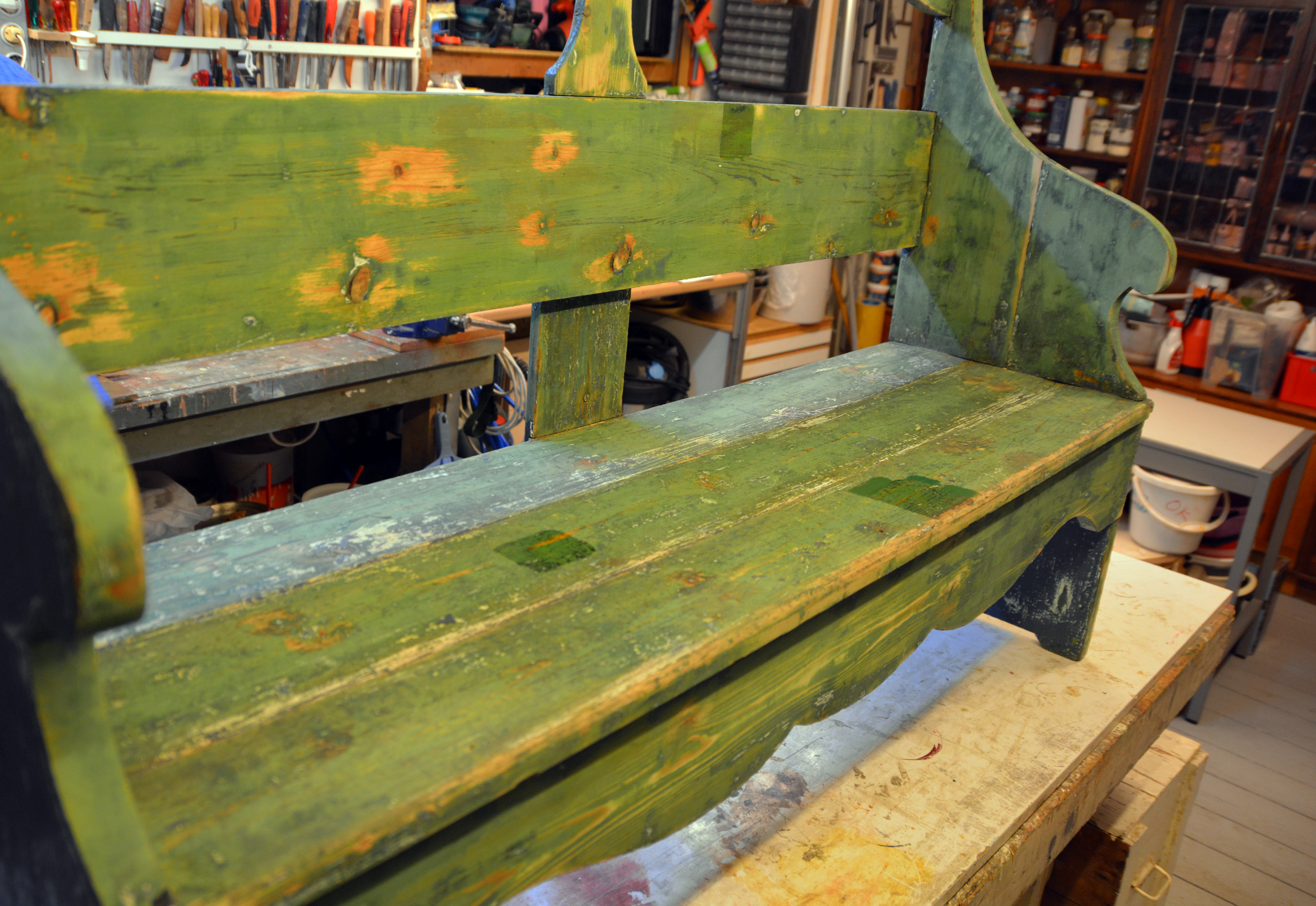 Benken har forlatt Møbelverkstedet på Grünerløkka og tatt veien til Vel Bevart lenger vest i byen, til Jons verksted hjemme i kjelleren. På arbeidsbenken troner et restaurert møbel vi kjenner igjen. Jon er tilnærmet ferdig med å fjerne malingen med varmebehandling. Det gjenværende grønnskjæret er inntrekk i treverket, noe som forteller at benken ble grunnet da den var helt ny. Nå venter en runde kvistlakk, grunning og to strøk, kanskje tre, med kokt linolje. Men først skal fargen rives.