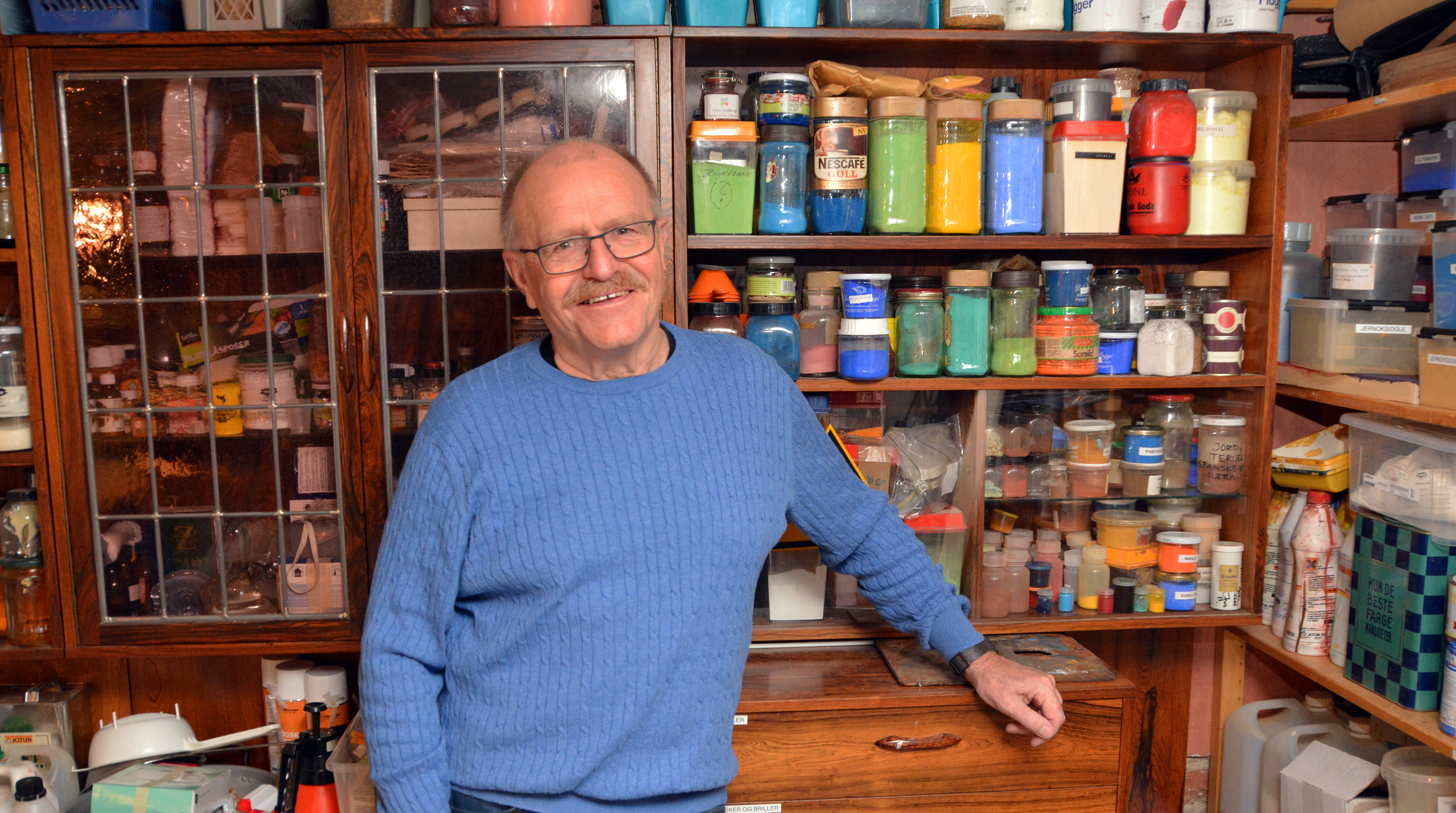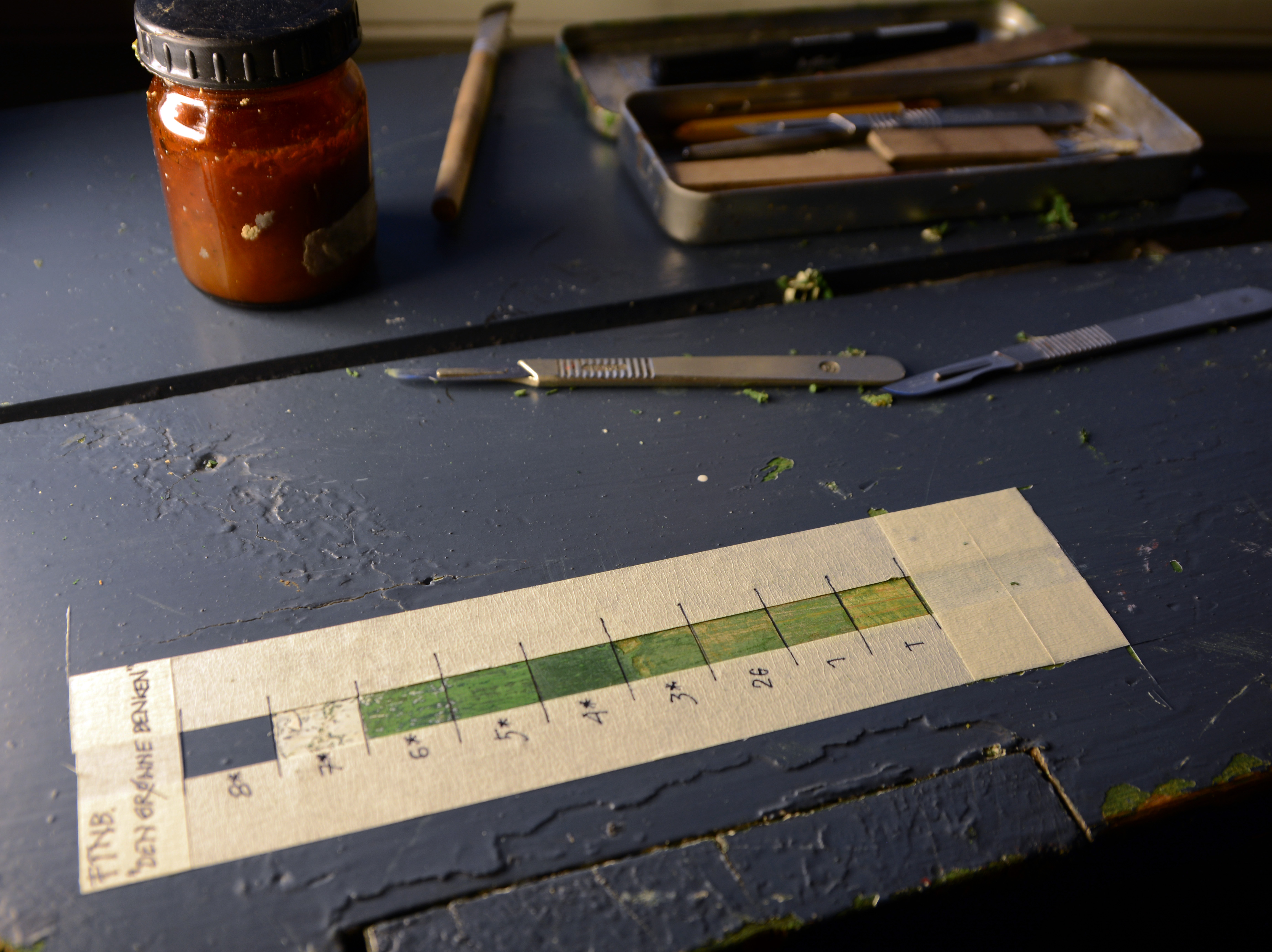 I Jons kjeller er det hyller fulle av bokser og glass med pigmenter han har fått og samlet opp gjennom årene, pigmenter som ikke er å få tak i lenger, mange er også blitt forbudt, uten at det bekymrer. «Ikke i slike små kvanta», forklarer han. Nå har han kommet fram til en blanding av kromgrønn mellom, ekte fransk guloker og titanhvit, med 2 % koboltsikkativ, et tørremiddel som egner seg for innendørs bruk. Men selv da vil det kunne ta opptil en måned til malingen er helt tørr.