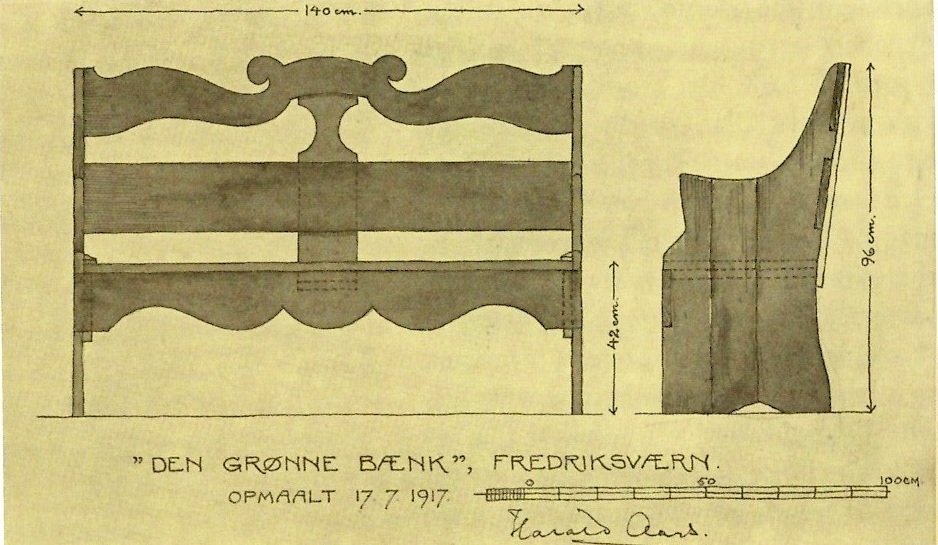 I Nasjonalbibliotekets arkiv finnes en oppmålingstegning av Harald Aars datert 7. juli 1917, som viser «Den grønne bænk». Sittehøyden er beskjedne 42 cm og bredden 140 cm. Den er relativt kunstferdig utformet, med en skrånende rygg. Dette er originalen, den lille grønne benken de feststemte personlighetene samlet seg på og rundt den mainatten i 1915.