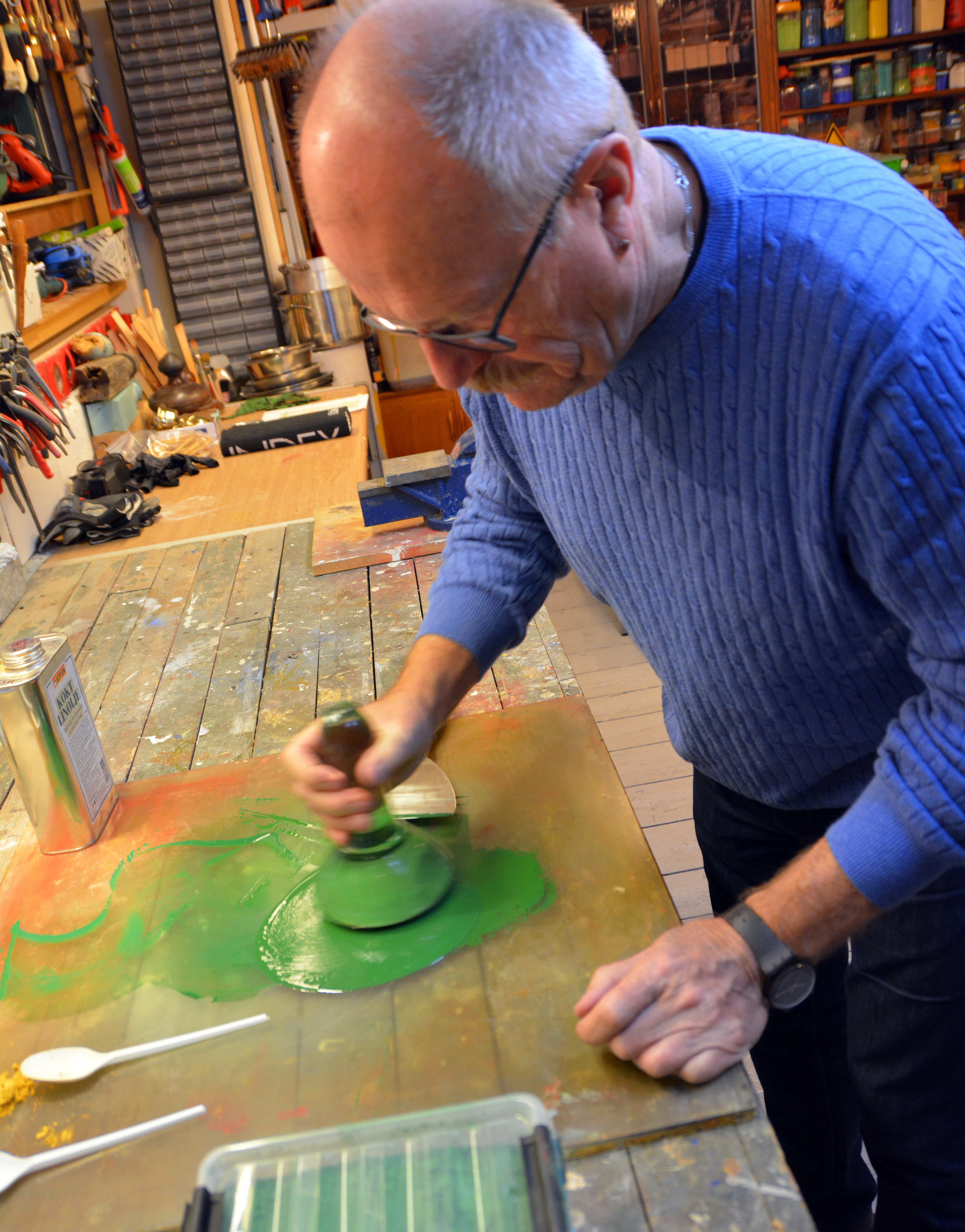 – Til det bruker jeg en løper for å rive pigmentene, det vil si å knuse pigmentene slik at de blir fint fordelt i linoljen. Ulike pigmenter har ulike korn, og jo mer du knuser kornene, desto mer fargesterk blir malingen.