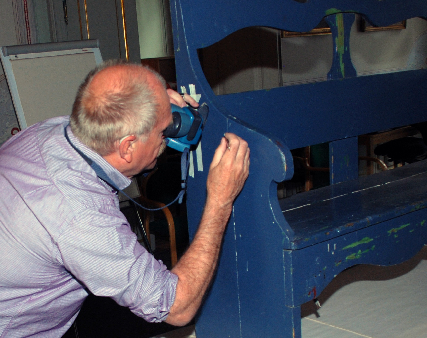 Feltmikroskop og digitalt mikroskop, skalpell, lampe, løsemiddel – og 50 års erfaring. Vår blåmalte grønne benk er i de aller beste hender når dens fargehistorie skal avsløres trinn for trinn i en fargetrapp. Før arbeidet tok til i Møbelverkstedet, utførte malerikonservator Jon Brænne i Vel Bevart den første fargeanalysen, med påfølgende rapport og anbefalte tiltak. Målet med undersøkelsen er å finne tilbake til originalfargen fra da benken var ny.