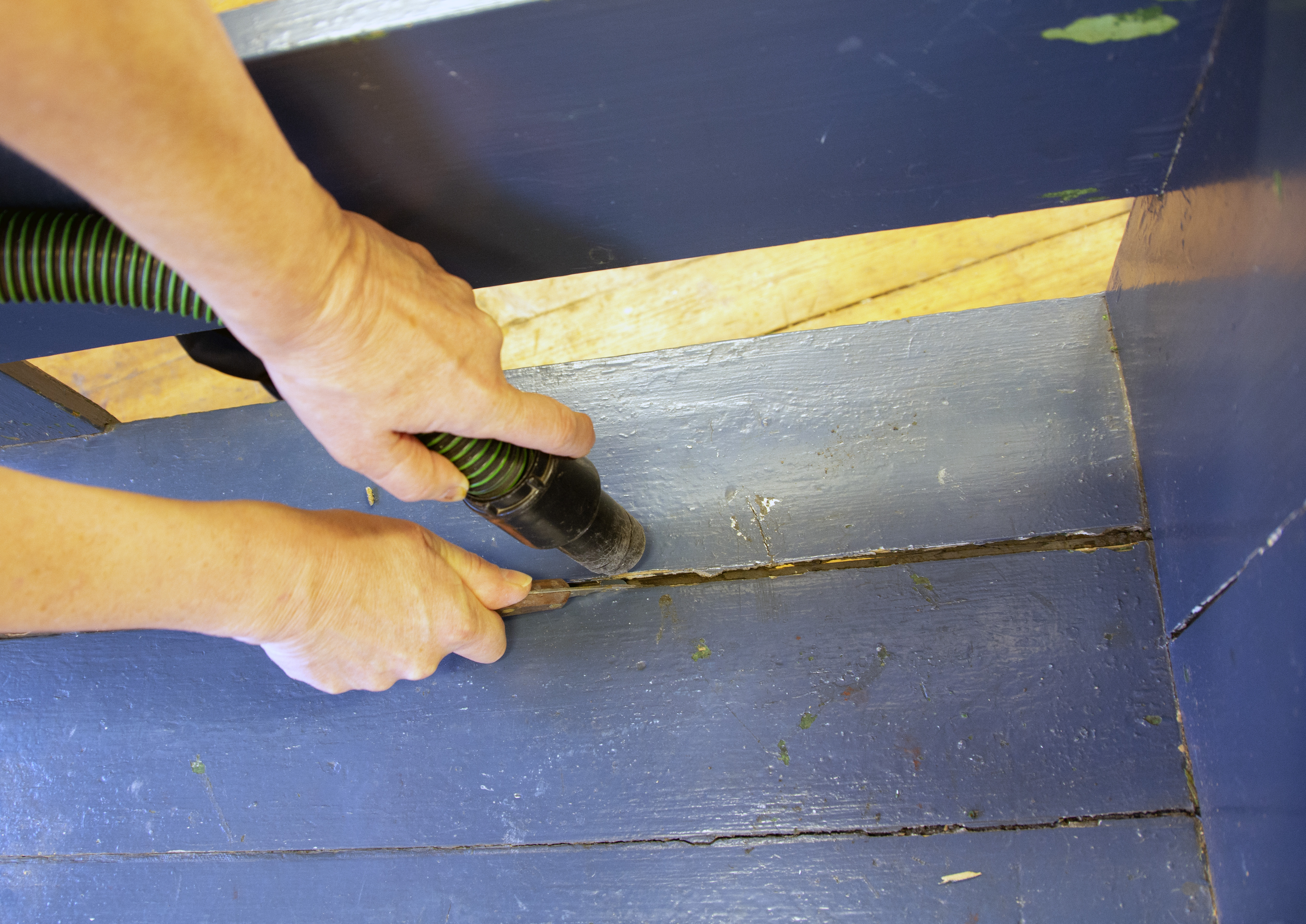 – Til all liming, mellom bordplatene og der jeg feller inn nytt trevirke, bruker jeg hornlim, forklarer Hanne. – Det er animalsk, påføres varmt og blir veldig sterkt, men samtidig er det mulig å fjerne igjen. Det gjør limingen til et reversibelt restaureringstiltak.