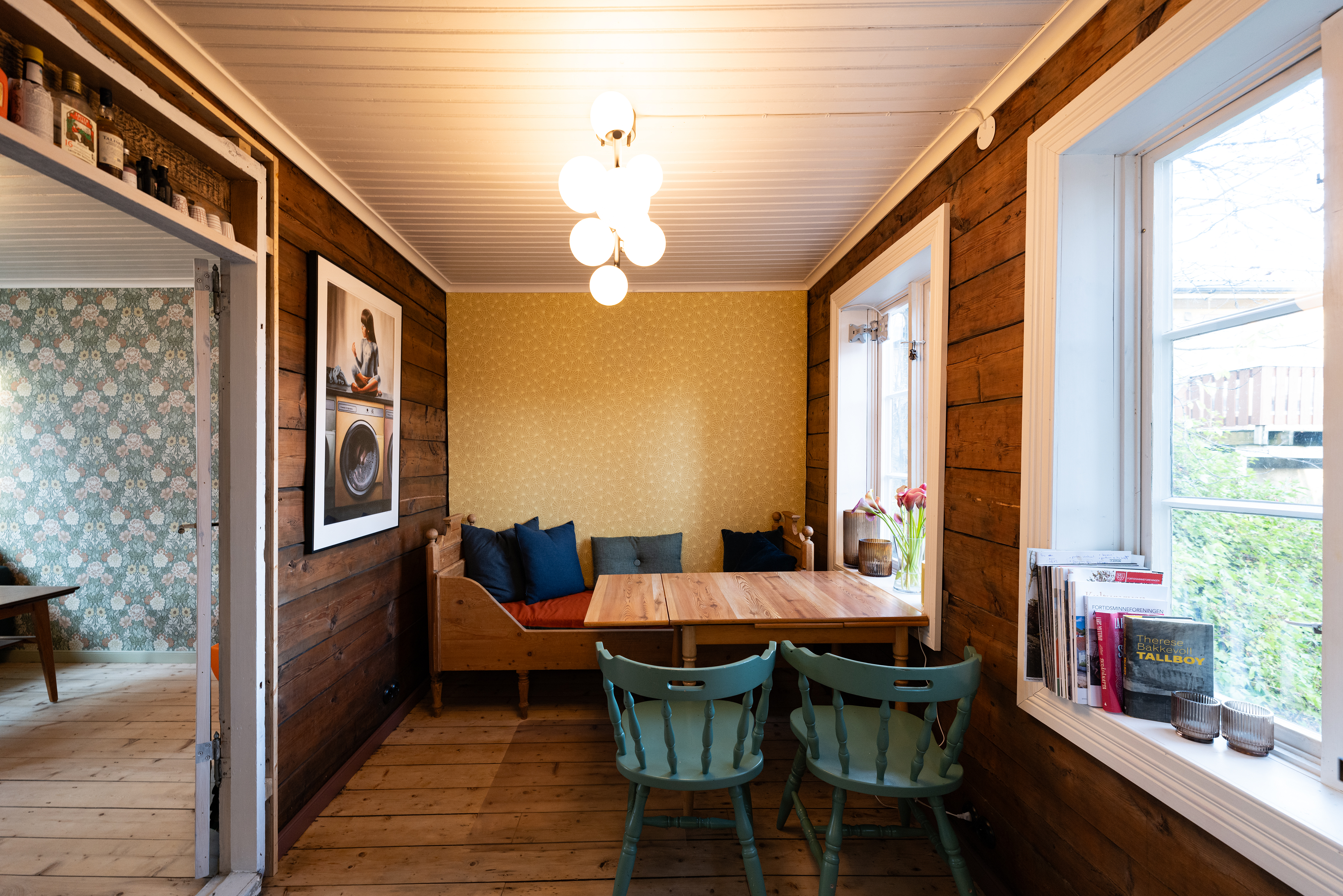 -På dette lille arealet har vi to stuer, et soverom, et gjesteværelse, en sovealkove, kjøkken, bad spisestue og stor kjeller. Det er rart å se hvordan dette fungerer, også med tanke på at trenden er at vi må klare oss med mindre plass i fremtiden. Vi har hatt det gøy med farger. Noe må ennå skrus på, justeres, men vi har kommet langt. Her har det vært en vindusrestauratør med kompetanse på gamle farger, en lokal fargehandler og oss selv. Vi har satt sammen disse tre erfaringene og kommet frem til fargevalg. Jeg fikk nøklene i desember 2020, startet i juli 2021, og flyttet inn i august 2022. Da var det mulig å bo der. Det er jo ikke det samme som at det var pent, eller veldig komfortabel. Nå, etter enda et år, begynner det endelig å gå seg skikkelig til, forteller Siri Børs-Lind.