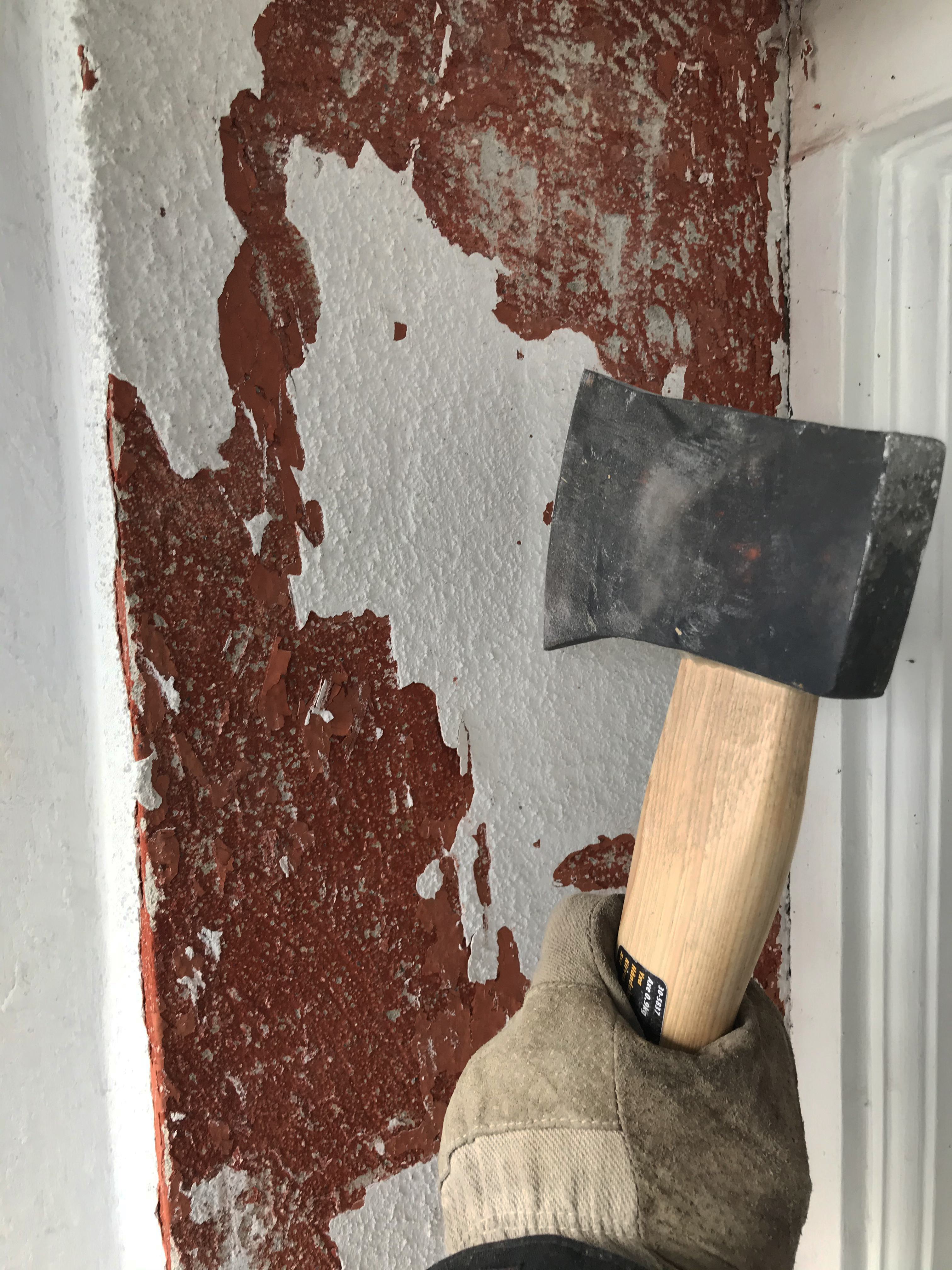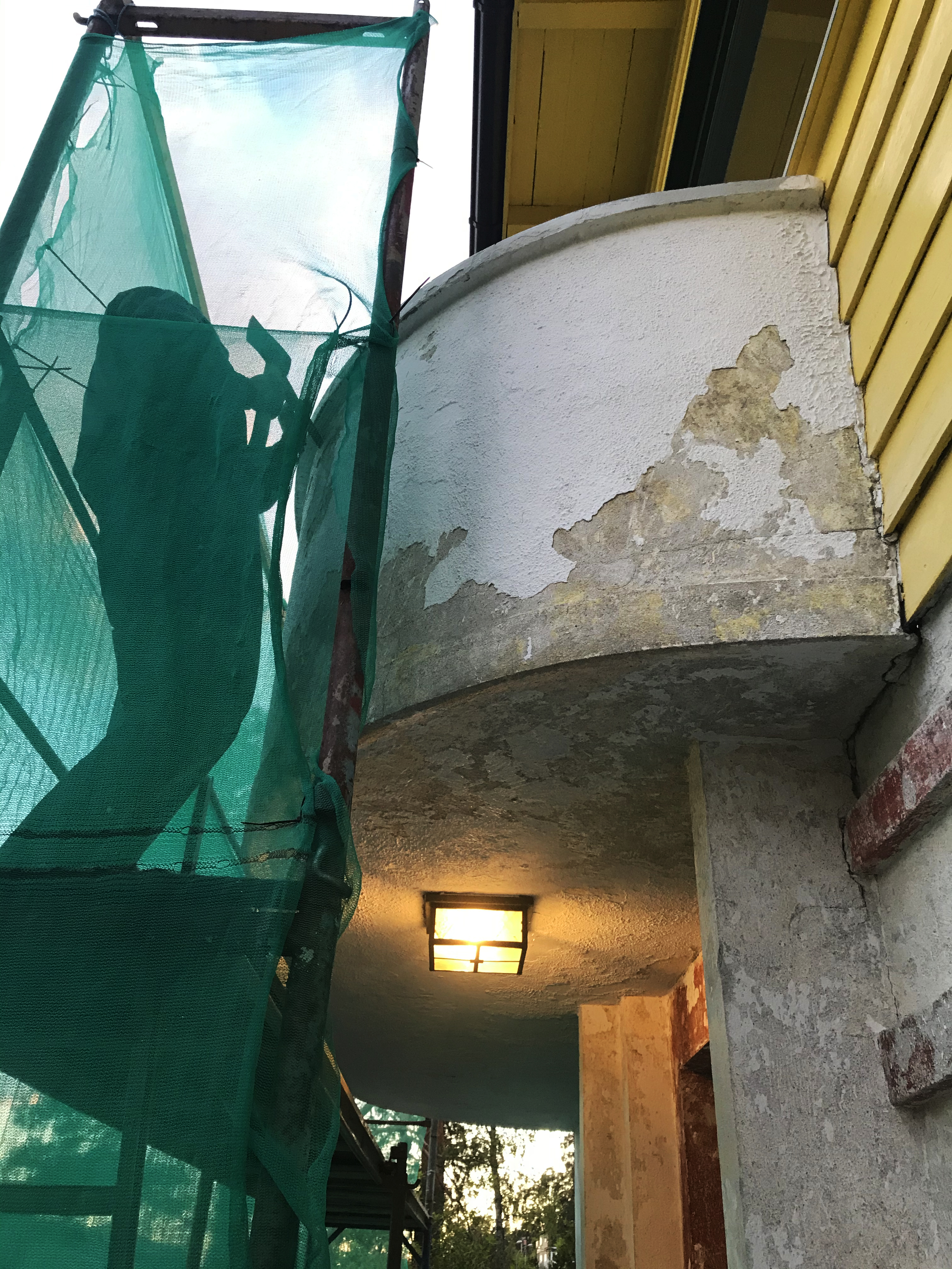 Eierne fikk en håndverker som er ekspert på historisk murverk til å vise dem hvordan sokkeletasjens pussede fasader kunne repareres skånsomt og etter tradisjonelle metoder som er i tråd med husets byggemåte. De ulike malingssjiktene ble forsiktig hakket bort for hånd med hjelp av øks(!). På den måten ble den opprinnelige overflaten av kalkpuss frilagt og løse partier av murpussen ble hugget vekk.