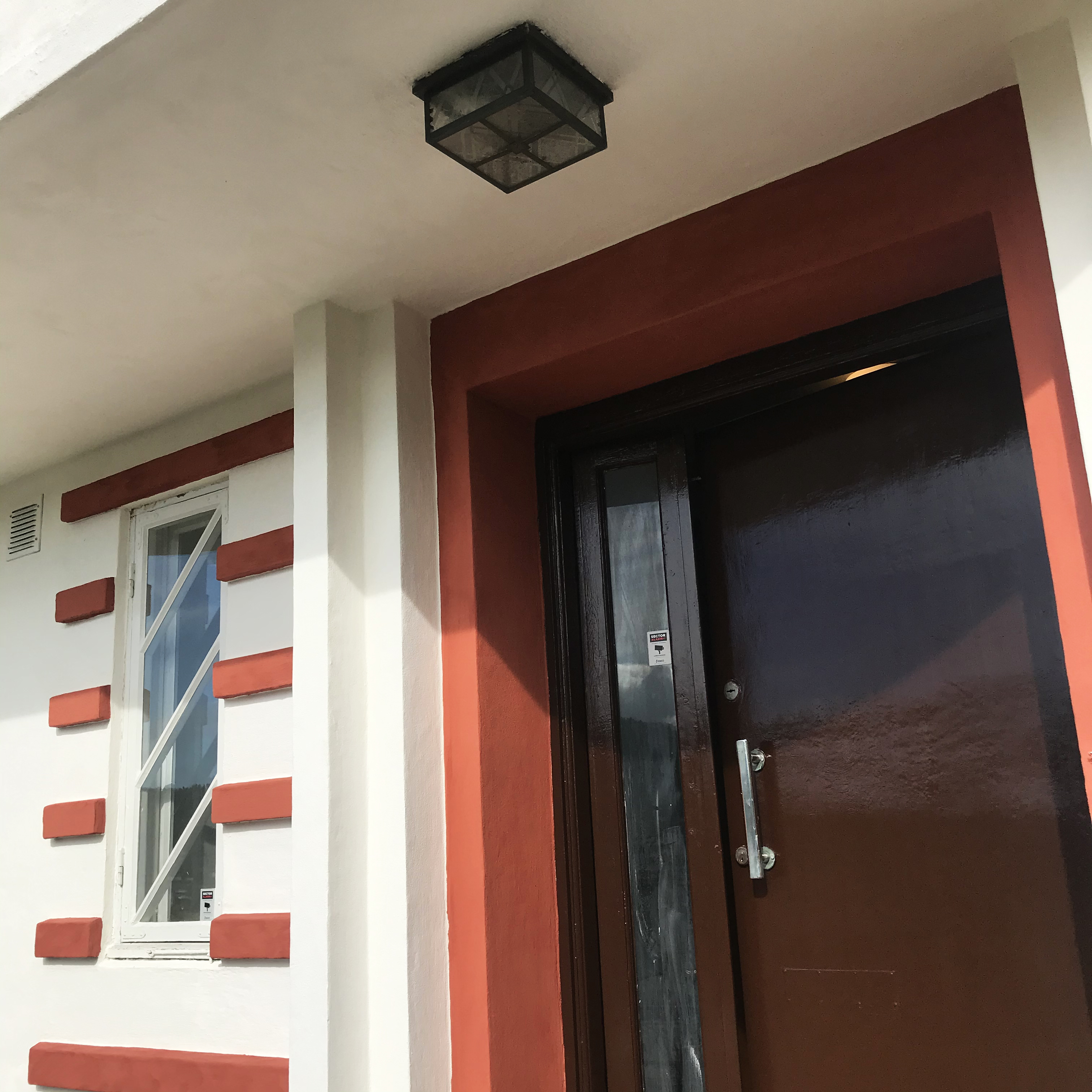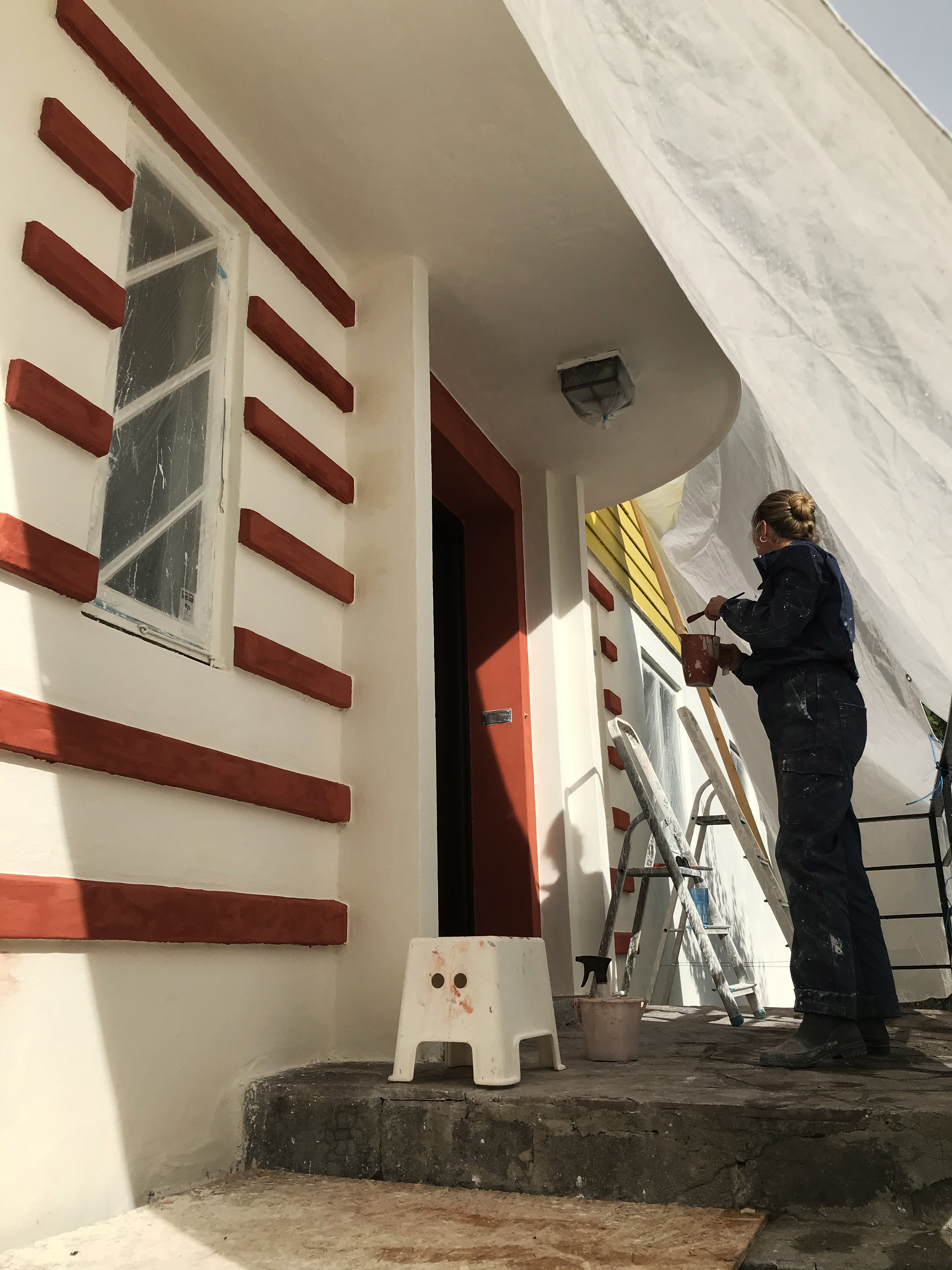 Arbeidet med fasaden tok tre år, og var nøye planlagt. Det første året ble panelet skrapt ned og malt. Dette krevde stillaser og en større IR-lampe montert på skinner, og arbeidet ble utført av innleide håndverkere. Alle opprinnelige vinduer ble samtidig satt i stand av eierne selv, med bruk av tradisjonelle linoljeprodukter.