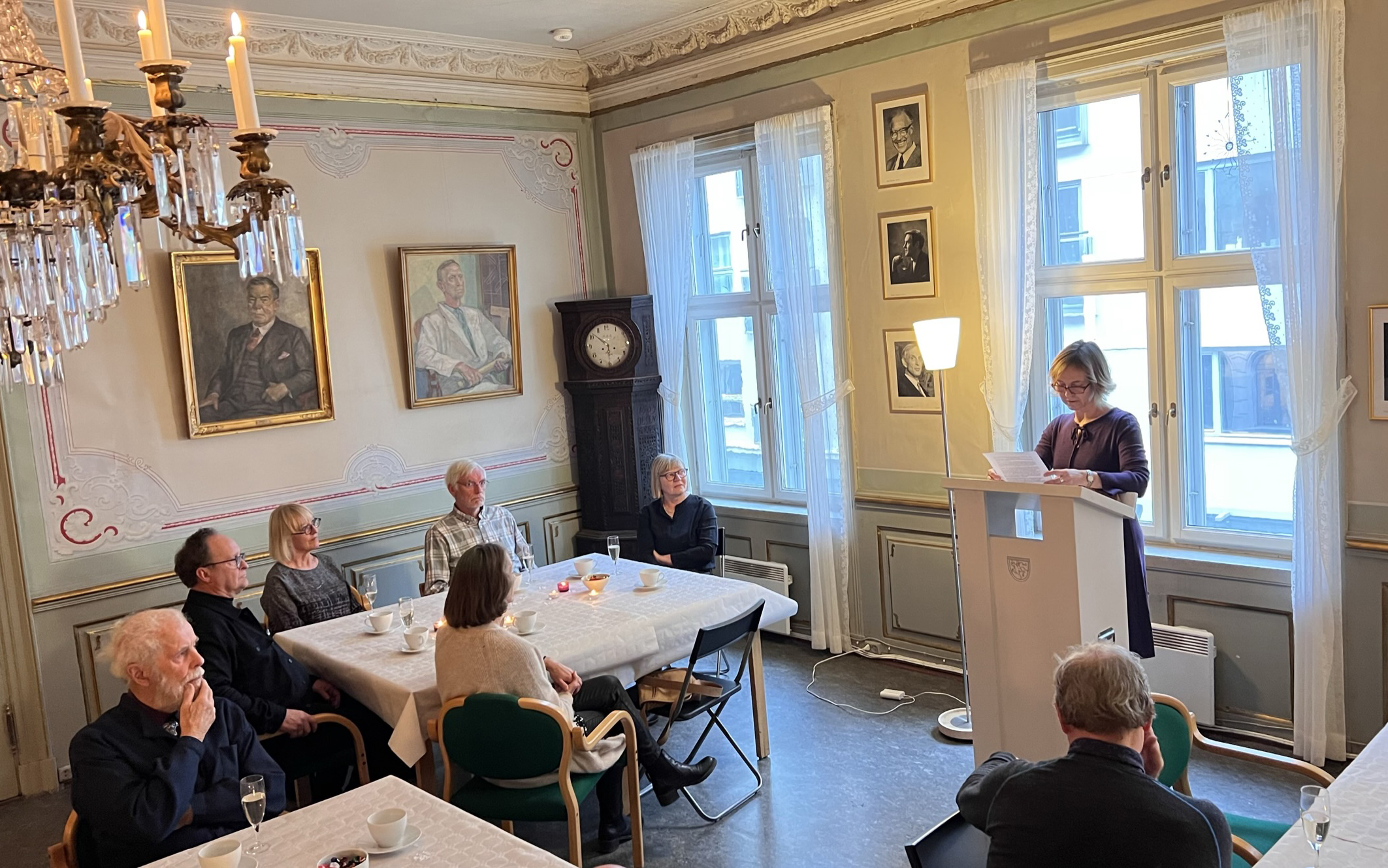 – Kjære Hans Jacob, du vet ikke hvorfor du er her, og du skal få leve i spenning litt til, sier Siri Hoem før hun begynner å lese en tekst som oppsummerer Hans Jacob Hansteens mangfoldige virke for kulturminnevernet gjennom et langt liv.