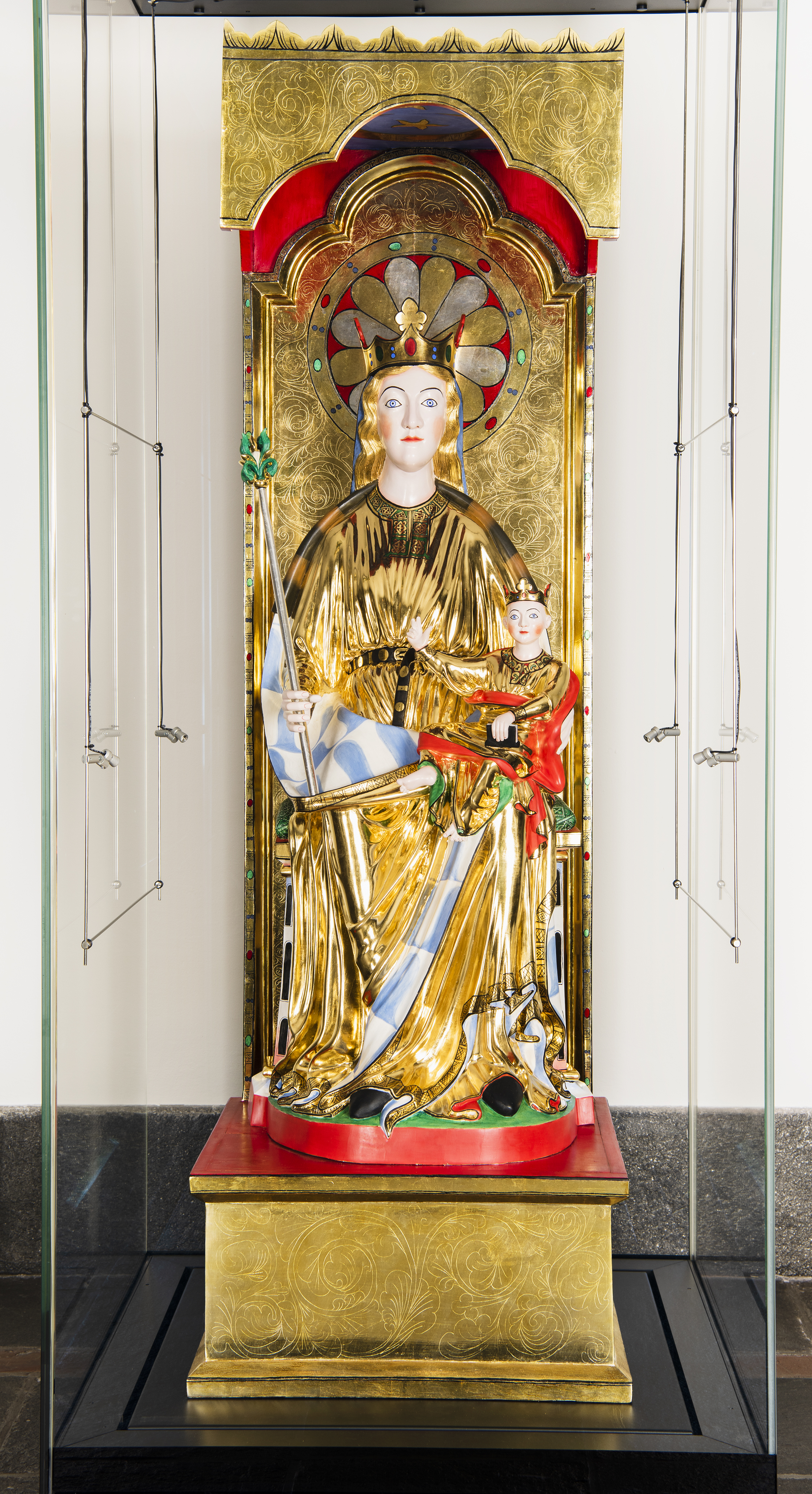 Det er baldakinen Maria sit under som fortel at Hovemadonnaen er del av eit helgenskåp. Ryggstykket har bevarte jarnhengsler etter flankerande, ledda fløydører som kunne lukkast rundt Maria med barnet. Fløydørene er no tapte, men skriftlege opplysningar frå 1823 og 1824 fortel at innsidene hadde framstillingar av dei 12 apostlane i relieff.