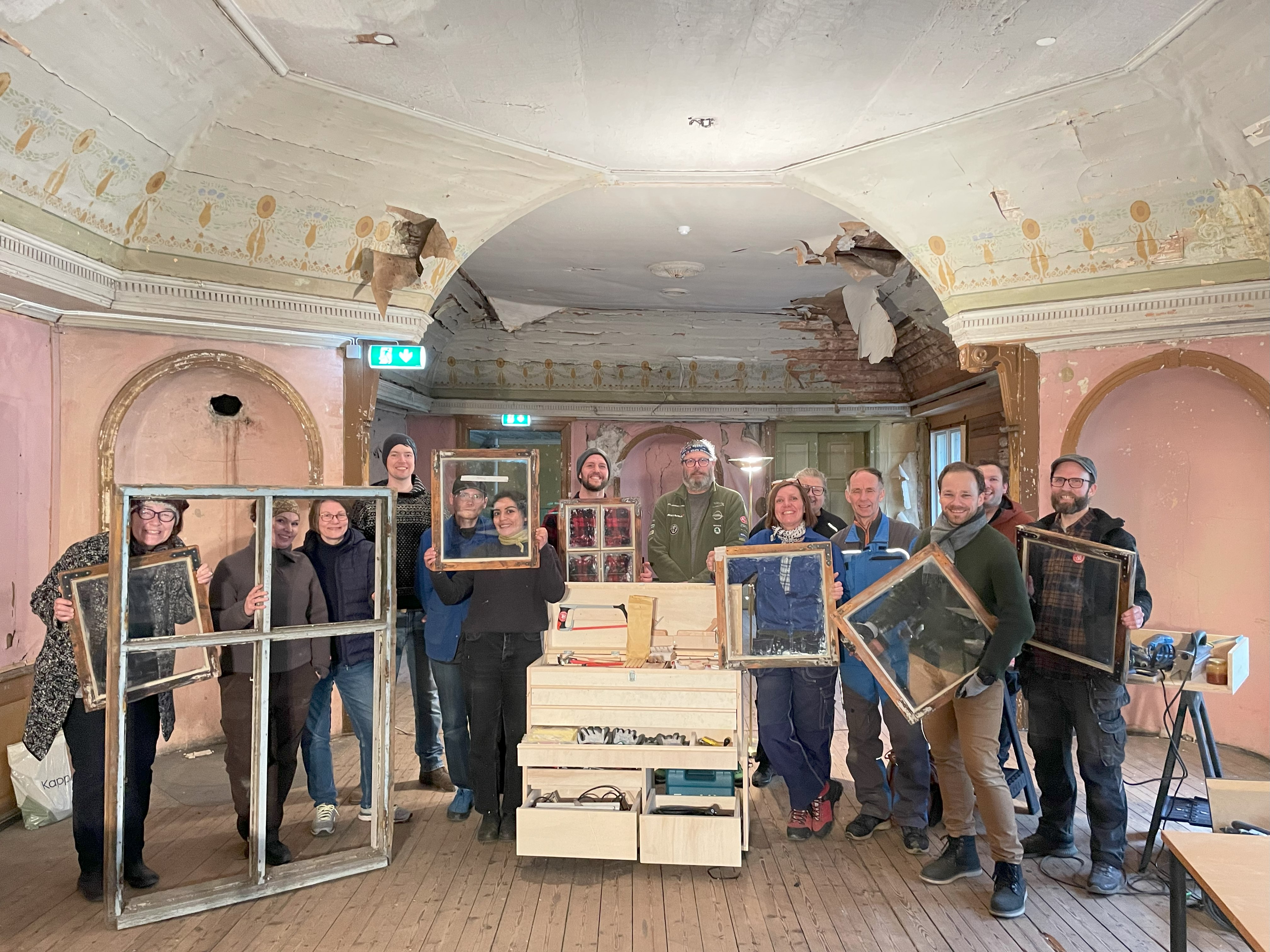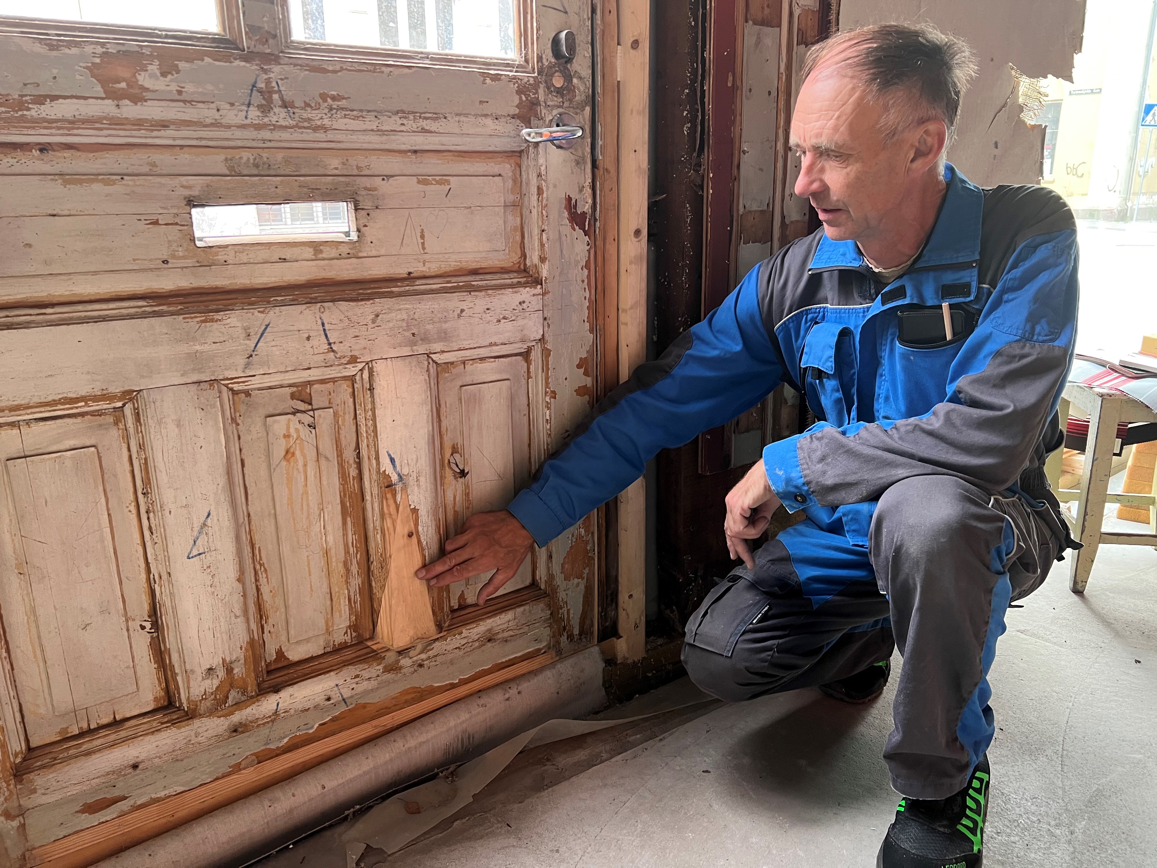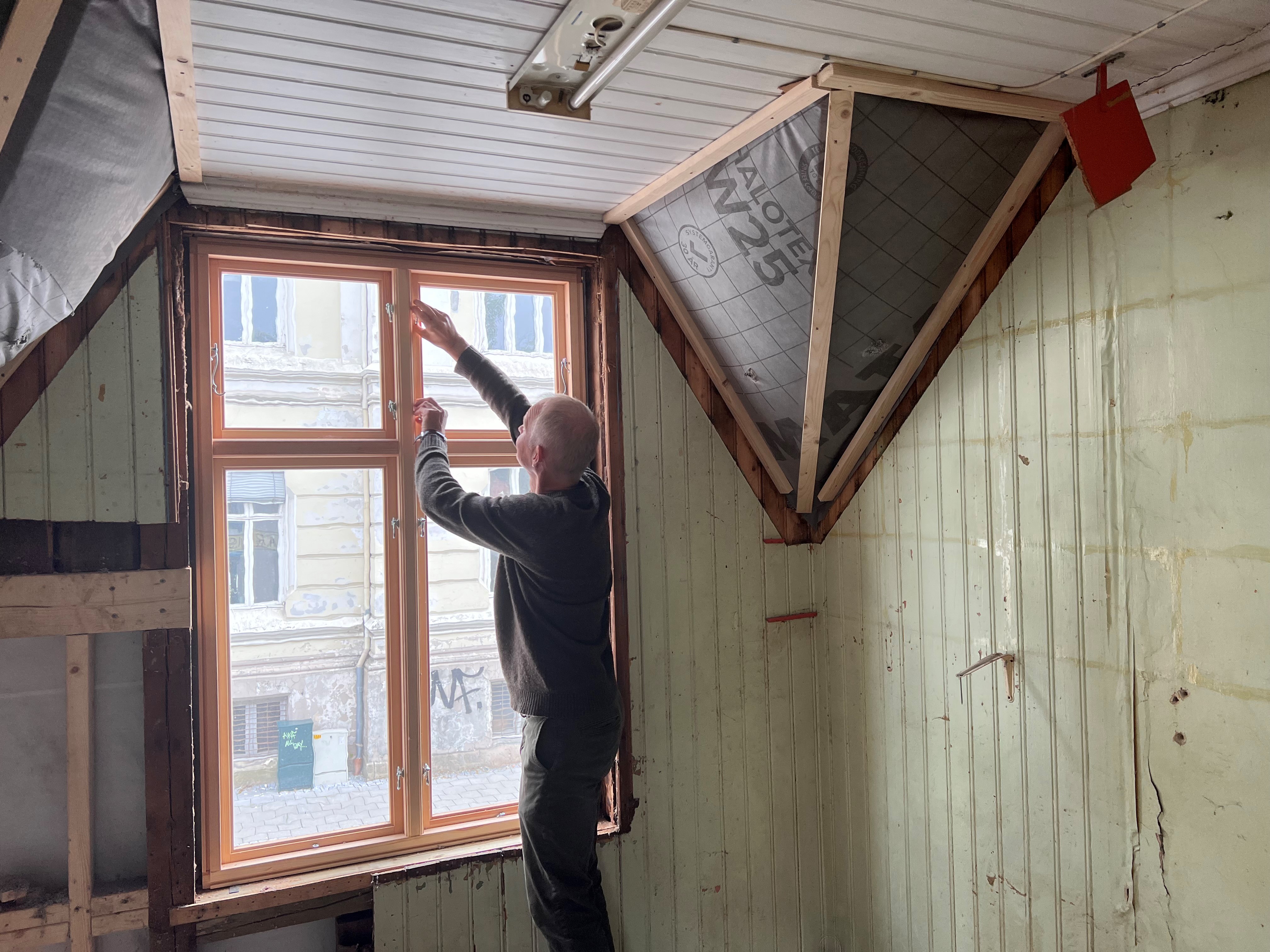 – Som møbelsnekker har jeg jobbet mye med restaurering, men dører og vinduer er nytt for meg. Det var en omstendelig jobb, jeg måtte ta fra hverandre hele døra, og mye var vanskelig å rekonstruere fordi det var blitt gjort mange endringer. Vann hadde lekket inn gjennom brevsprekken gjennom lang tid, noe som hadde ført til store råteskader, forklarer Nomell som også har renset det store fasadeskiltet som nå er tilbake på plass.