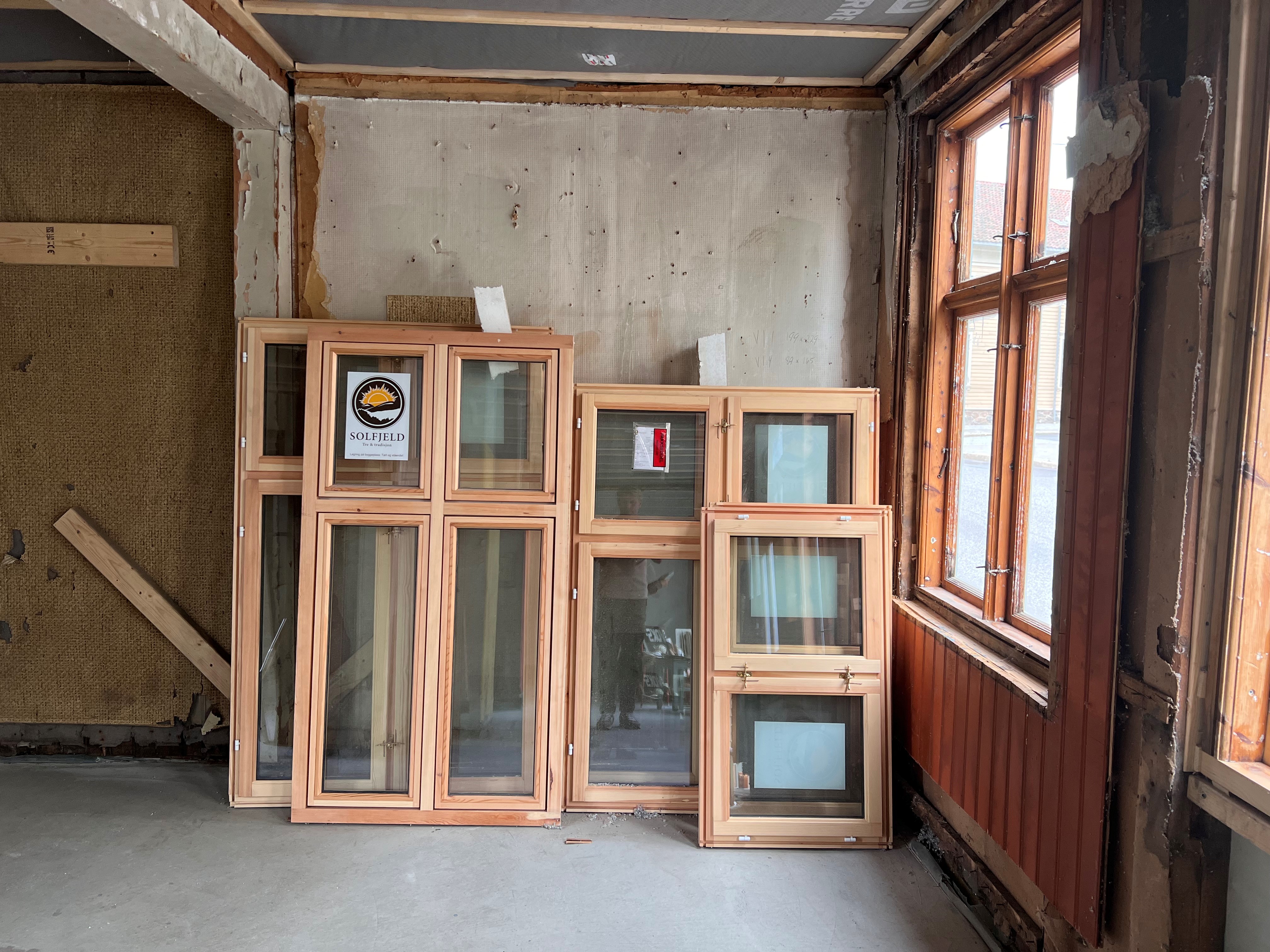 Huset hadde kun to bevarte originalvinduer igjen, disse var i veldig dårlig forfatning og nesten halvparten av materialene måtte skiftes ut. Resten av fasaden har fått nye vinduer som er mest mulig lik de originale vinduene. De to ytterdørene mot gaten og bakgården kunne heldigvis reddes, nå gjenstår det å male dem.