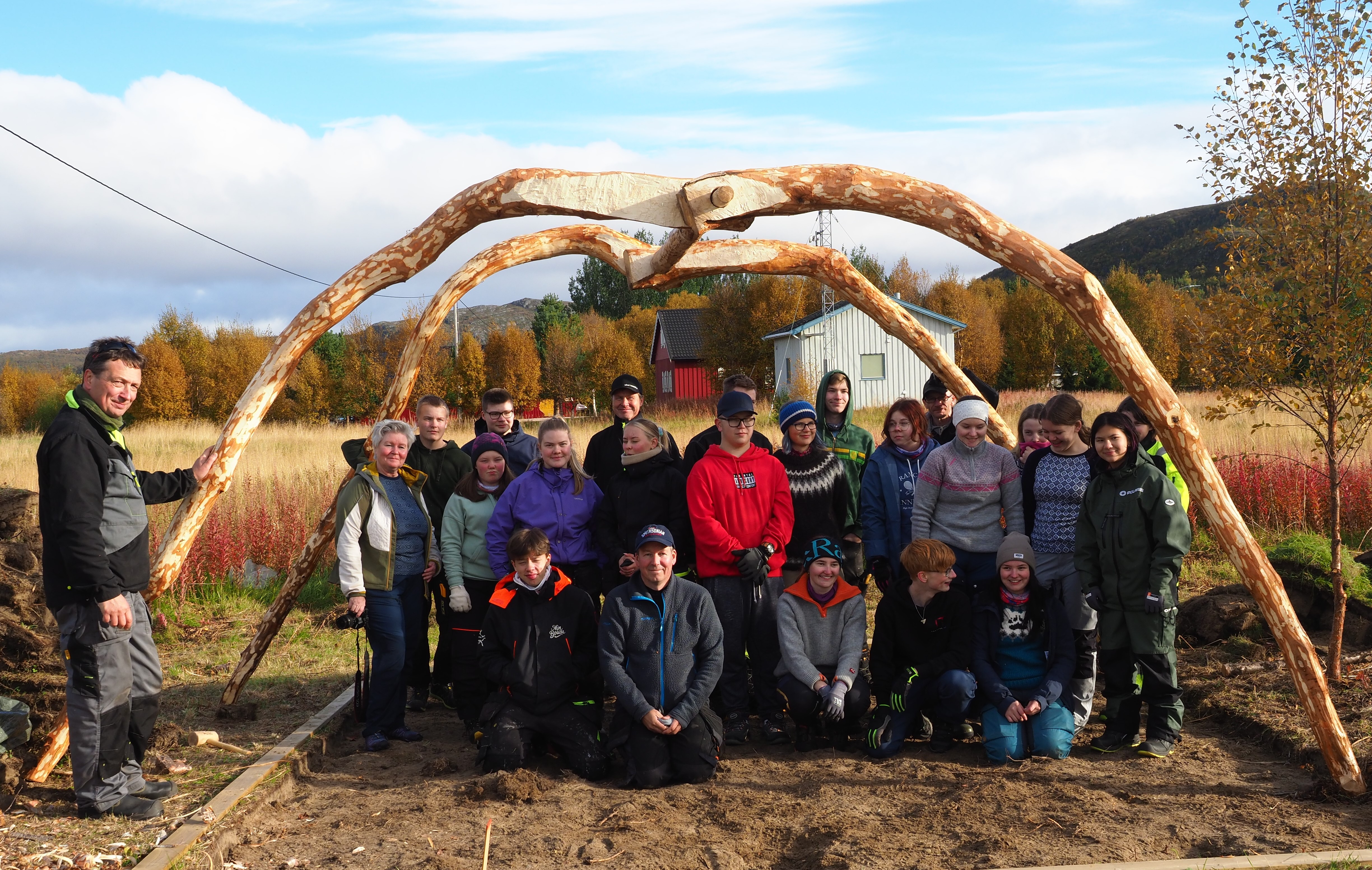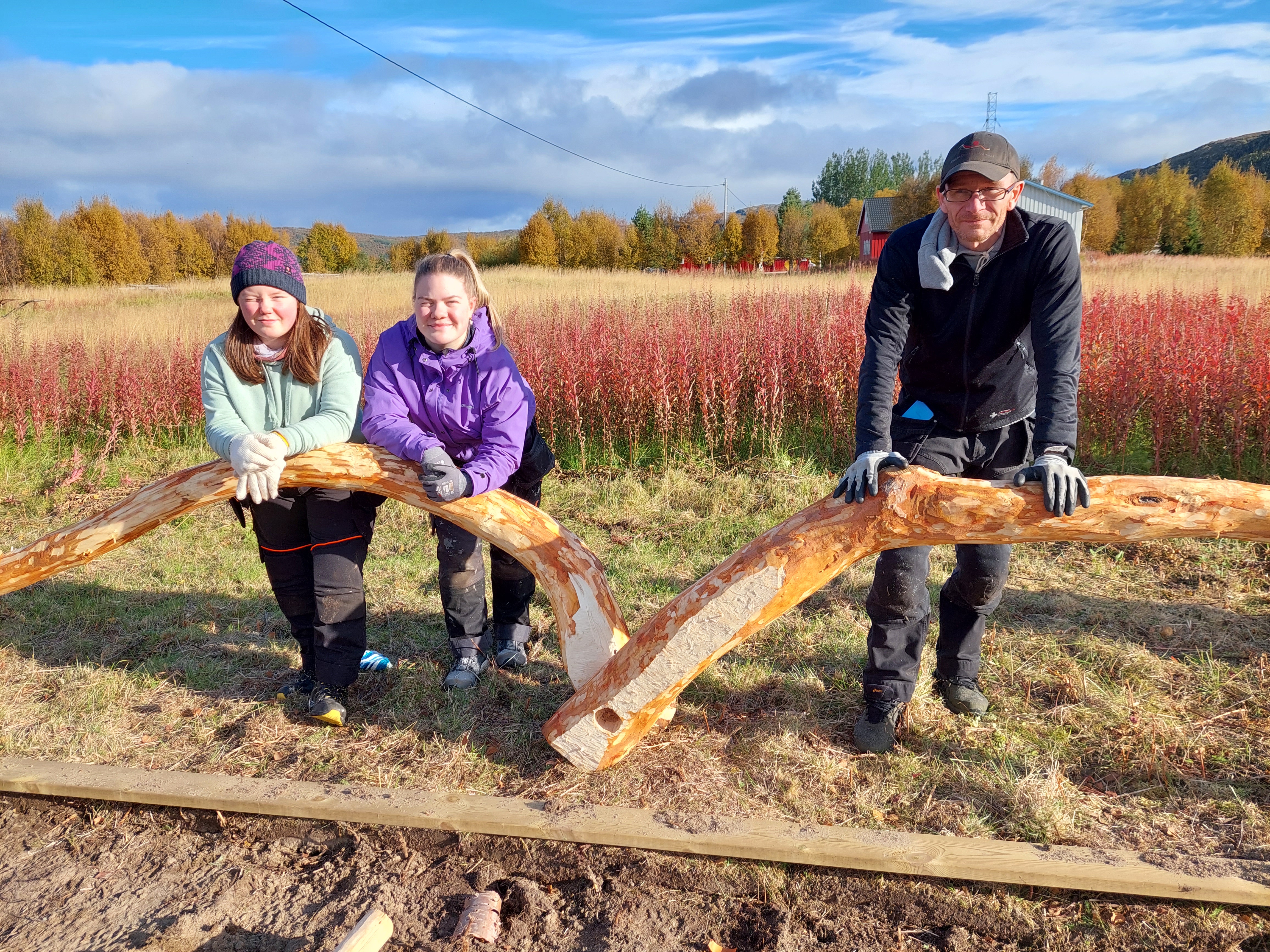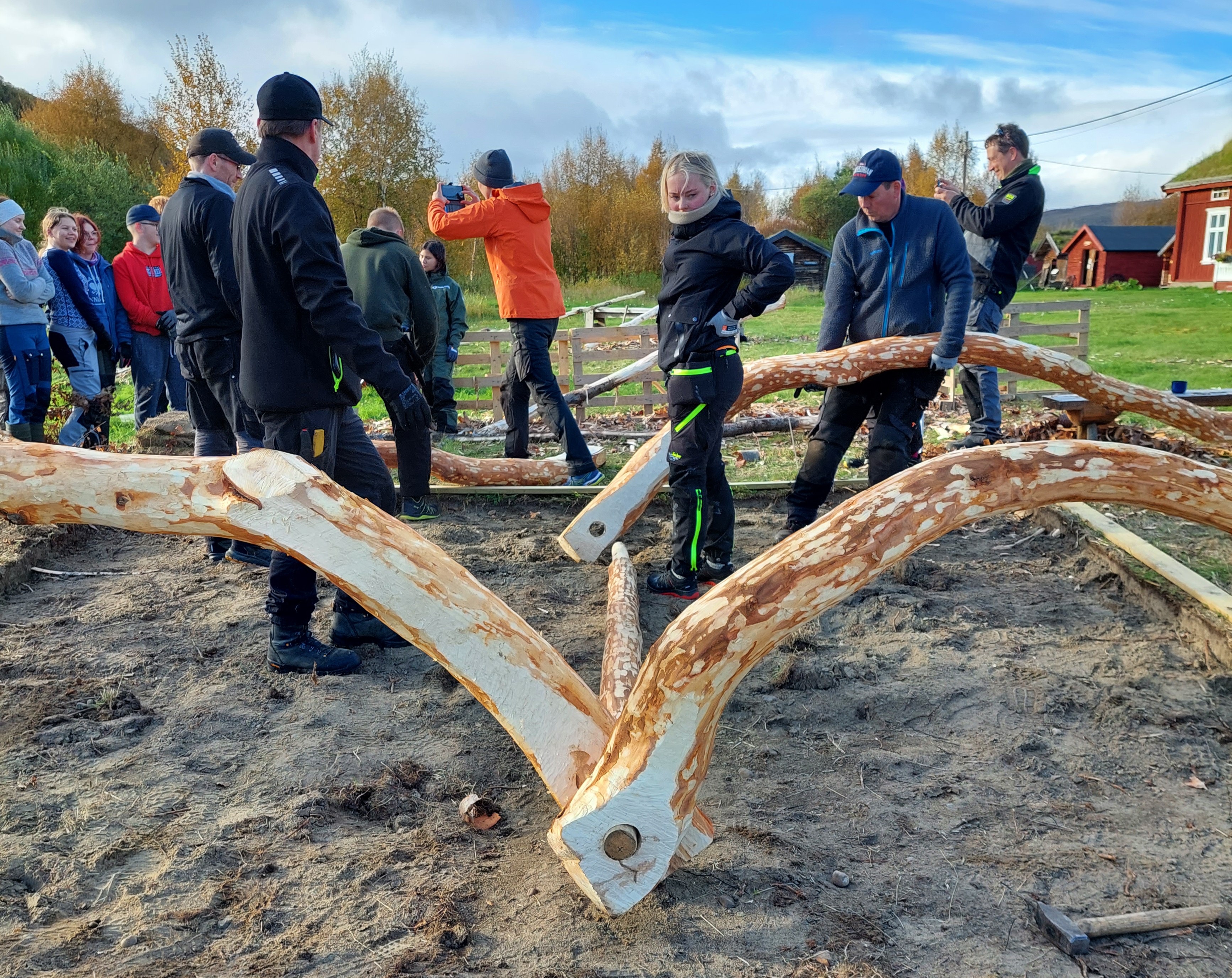«En magisk dag på museet da buesperrene ble reist i vårt gammeprosjekt. Elever fra Karasjok og Tana bidro og var med på å forberede, barke stammer, stikke torv, løfte og bære stokker og stammer, før to hele buer kom på plass. For en gjeng!»