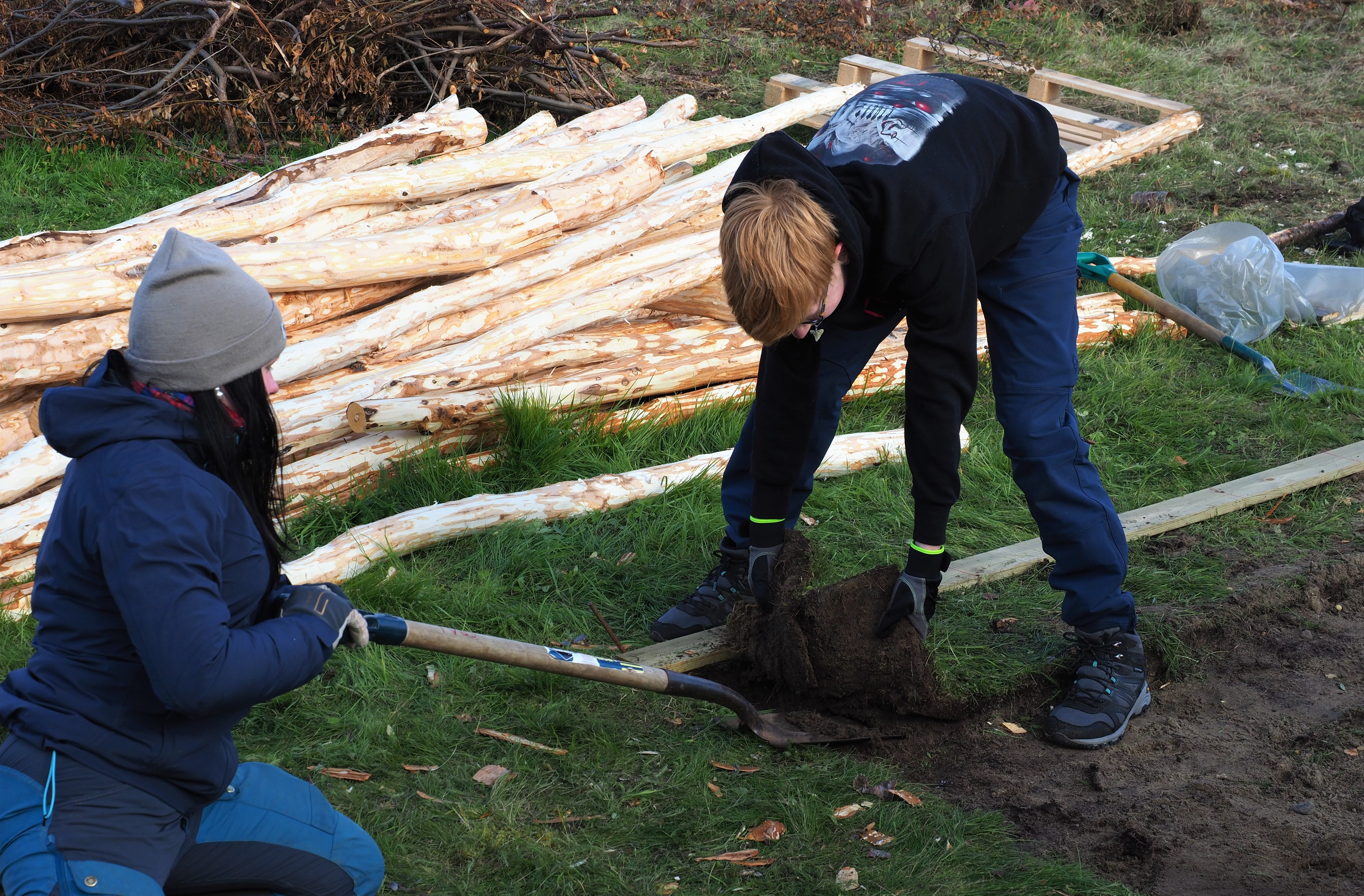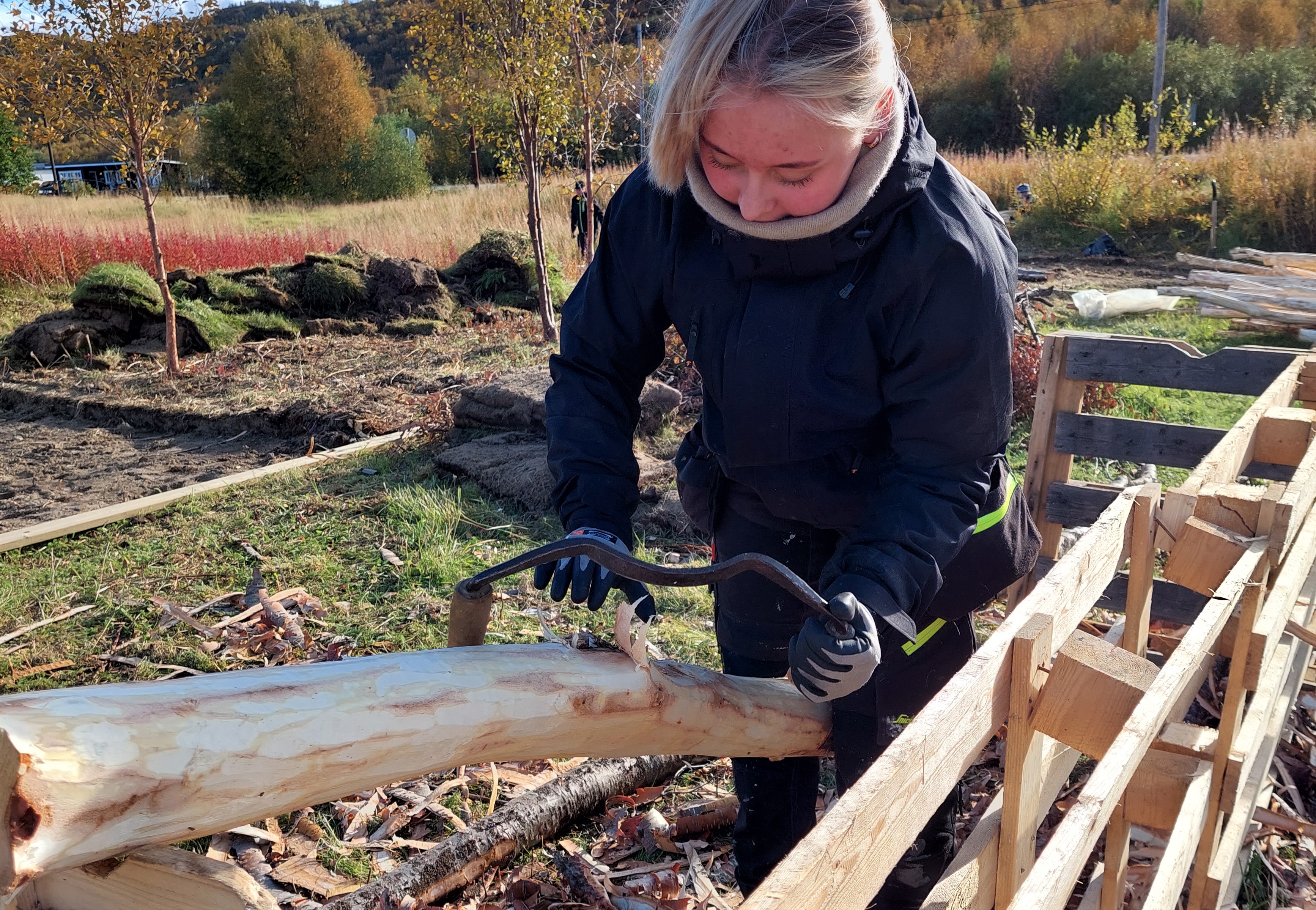 Elevene Sanna og Sunna er byggfagelever og svært fornøyde med å lære noe helt annet denne dagen. Ivrige og interesserte følger de med når instruktør Gunnar Grønvold viser dem hvordan bjørkestammene skal barkes. Andre stikker torv som sammen med never skal dekke gammen.