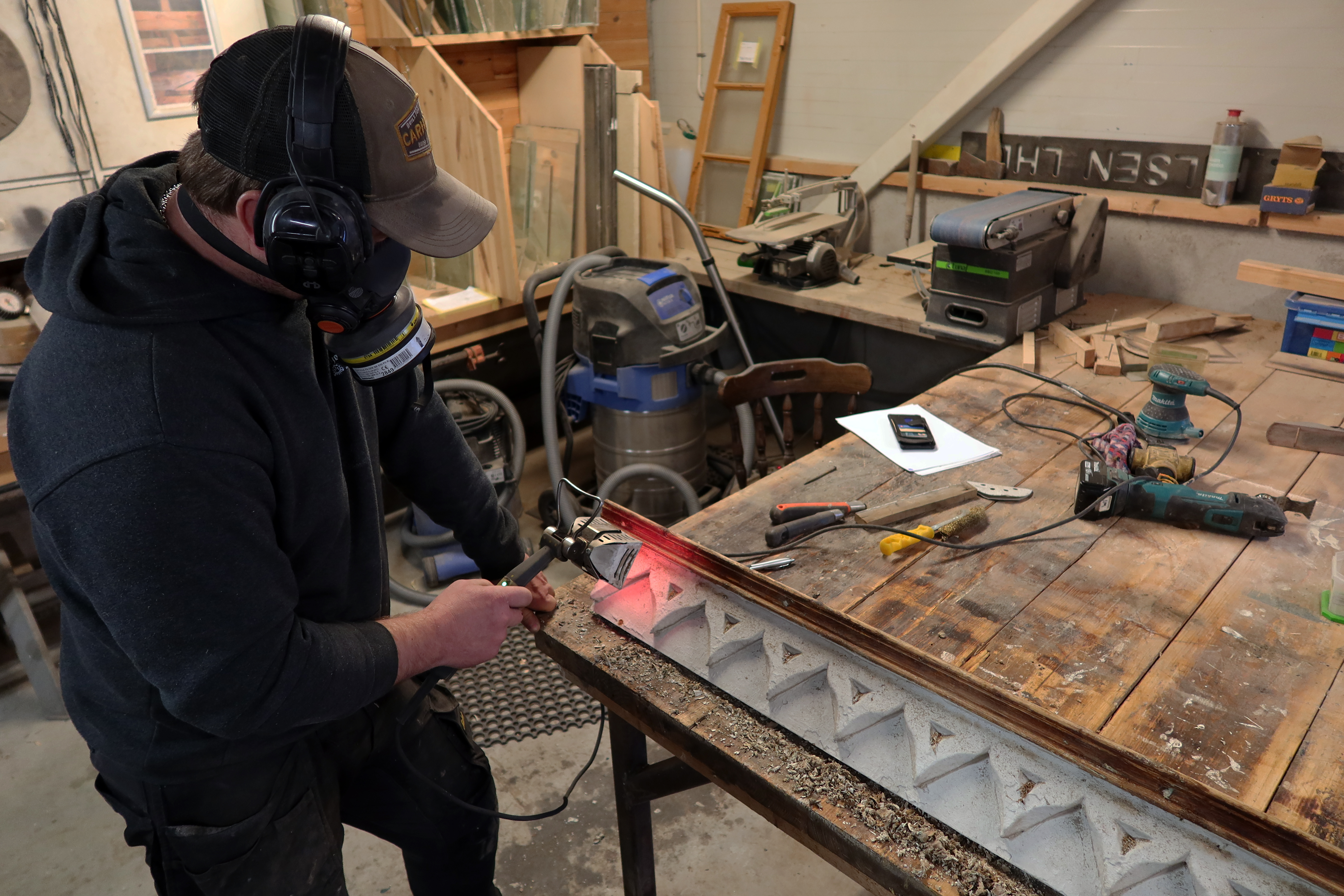 Materialbanken er ikke bare gjenbruk. Den er også et verksted. Her lages paneler og listverk med ønsket historisk profil, her gjenskapes deler av dører og vinduer som er gått tapt. Her kan du få akkurat det du ønsker, til ditt prosjekt.