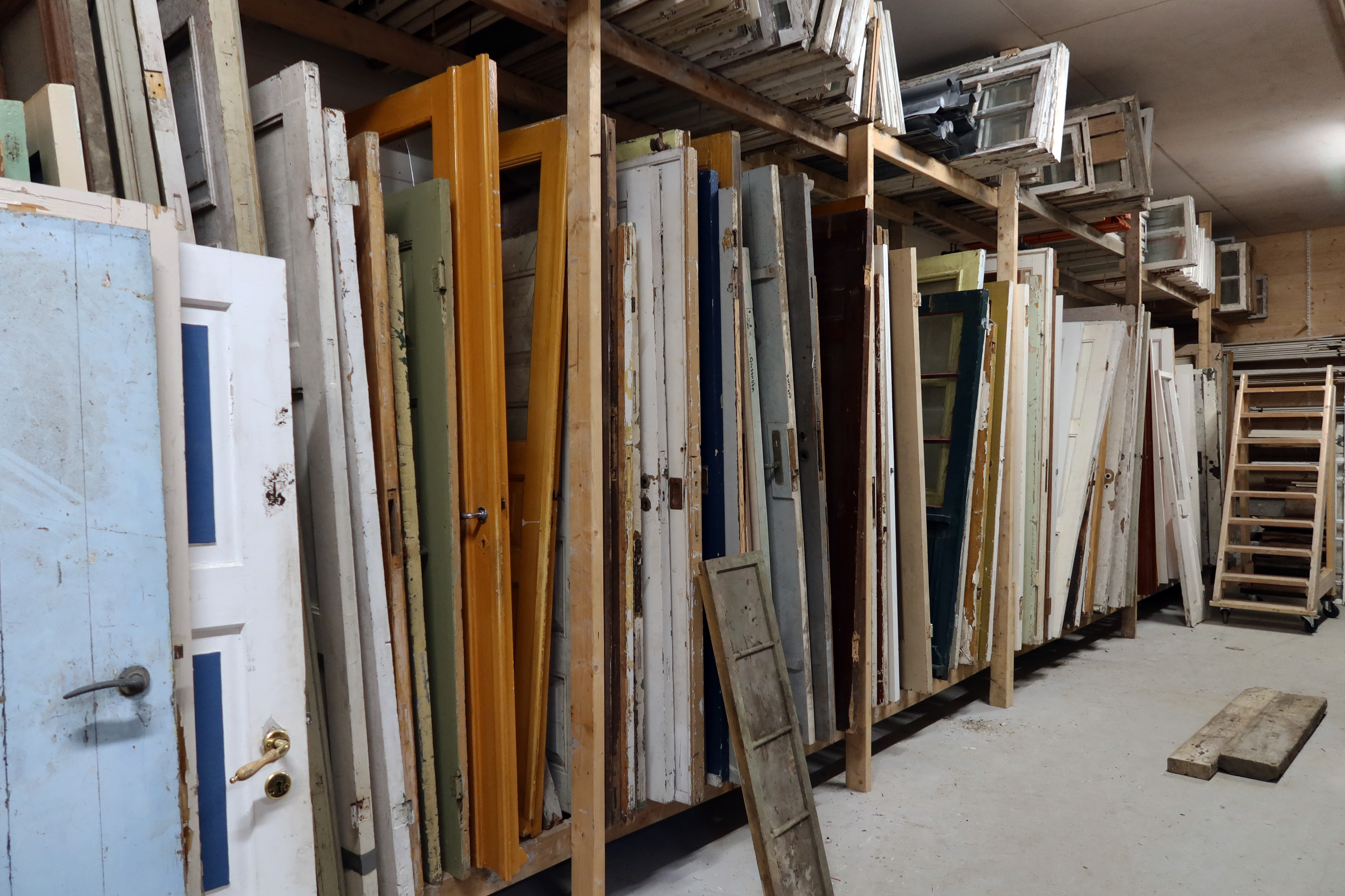 En haug gamle planker, dører og andre gjenbruksmaterialer kan lagres hvor som helst, i en låve, en moderne lagerbygning. At de akkurat her lagres i et knippe bygninger som selv er bygget av gjenbruksmaterialer skaper en ekstra dybde til fortellingen. For det er en fortelling, det som er blitt til Materialbanken i Farsund.