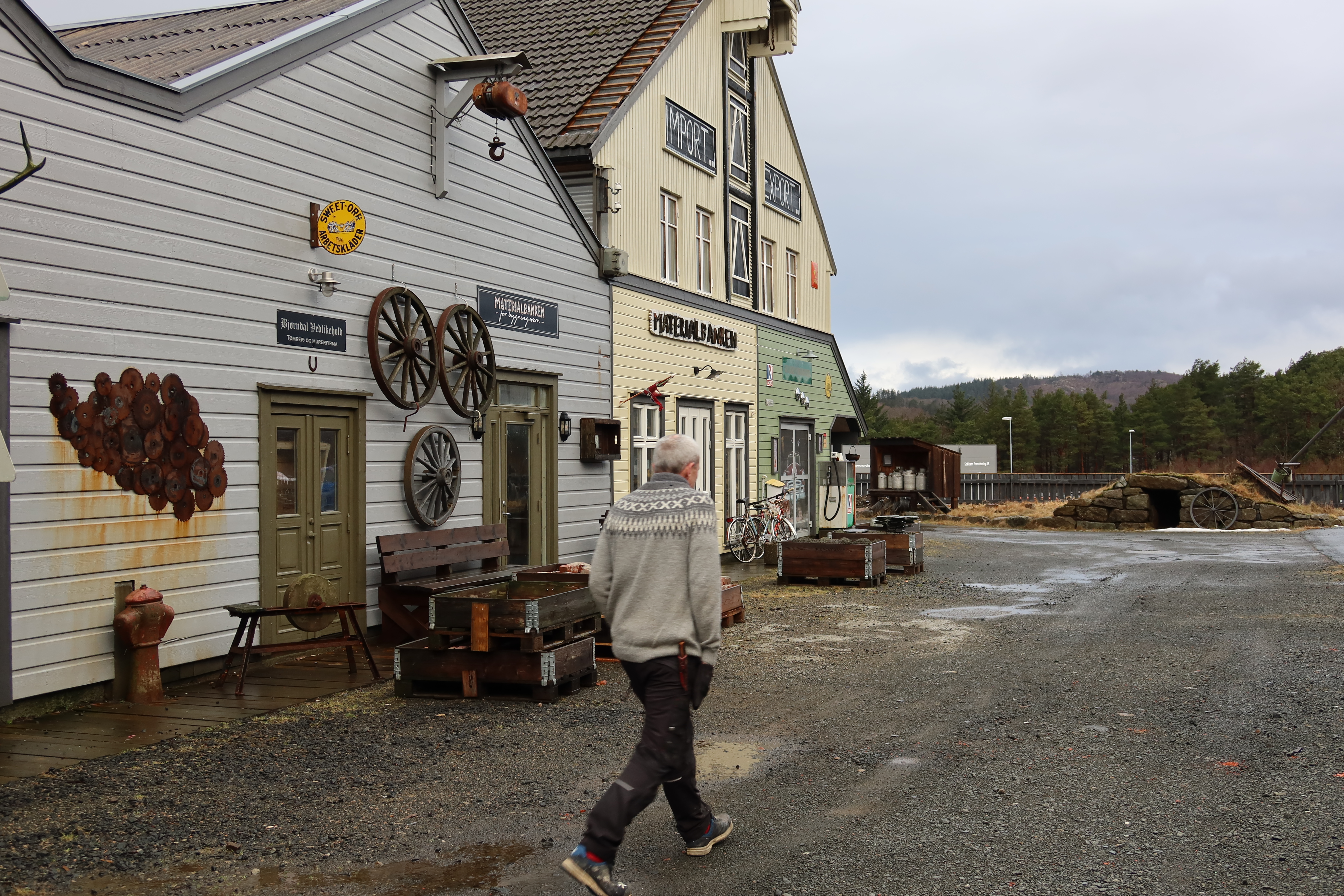 Og det er virkelig som en liten gate, her midt i et industriområde. Folk kommer kanskje innom en dag på jakt etter en dør, noen vinduskarmer, kanskje et beslag eller noen takstein. Og så er de tilbake neste lørdag, men da er jaggu ungene, svigermor og fatter’n med! En dag med familien, med opplevelser for store og små; carporten med en Chevrolet 1946, en autentisk melkerampe, en hel vegg full av gjenstander det kan snakkes om i timevis, en båt henger i taket, et komplett bibliotek, en verktøysamling, ølsamling (!), 60-tallsstua. Mannen samler og samler og hviler aldri?