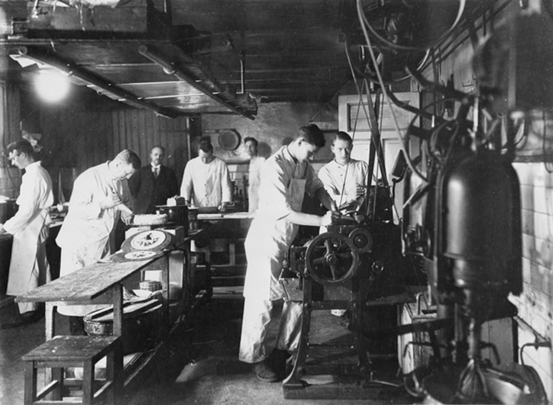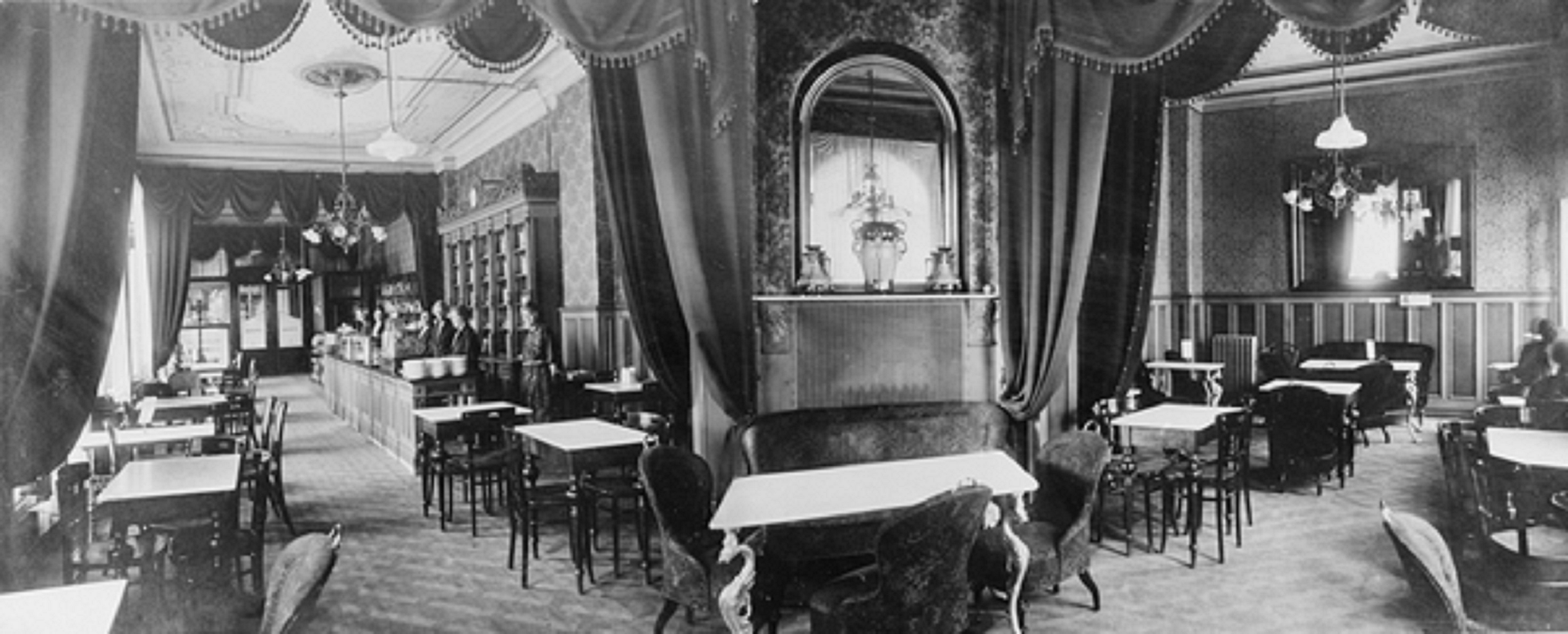 Avdelingen ut mot Wessels plass var forbeholdt kvinnene mens de nøt sine kremkaker, mens den indre avdelingen var stedet herrene kunne innta sitt karbonadesmørbrød med speilegg, lese avisen og nyte en god sigar. Vin hørte selvsagt til og ble skjenket fra en karaffel med druemotiv med ett sølvskilt hengende i en tynn lenke om flaksehalsen.