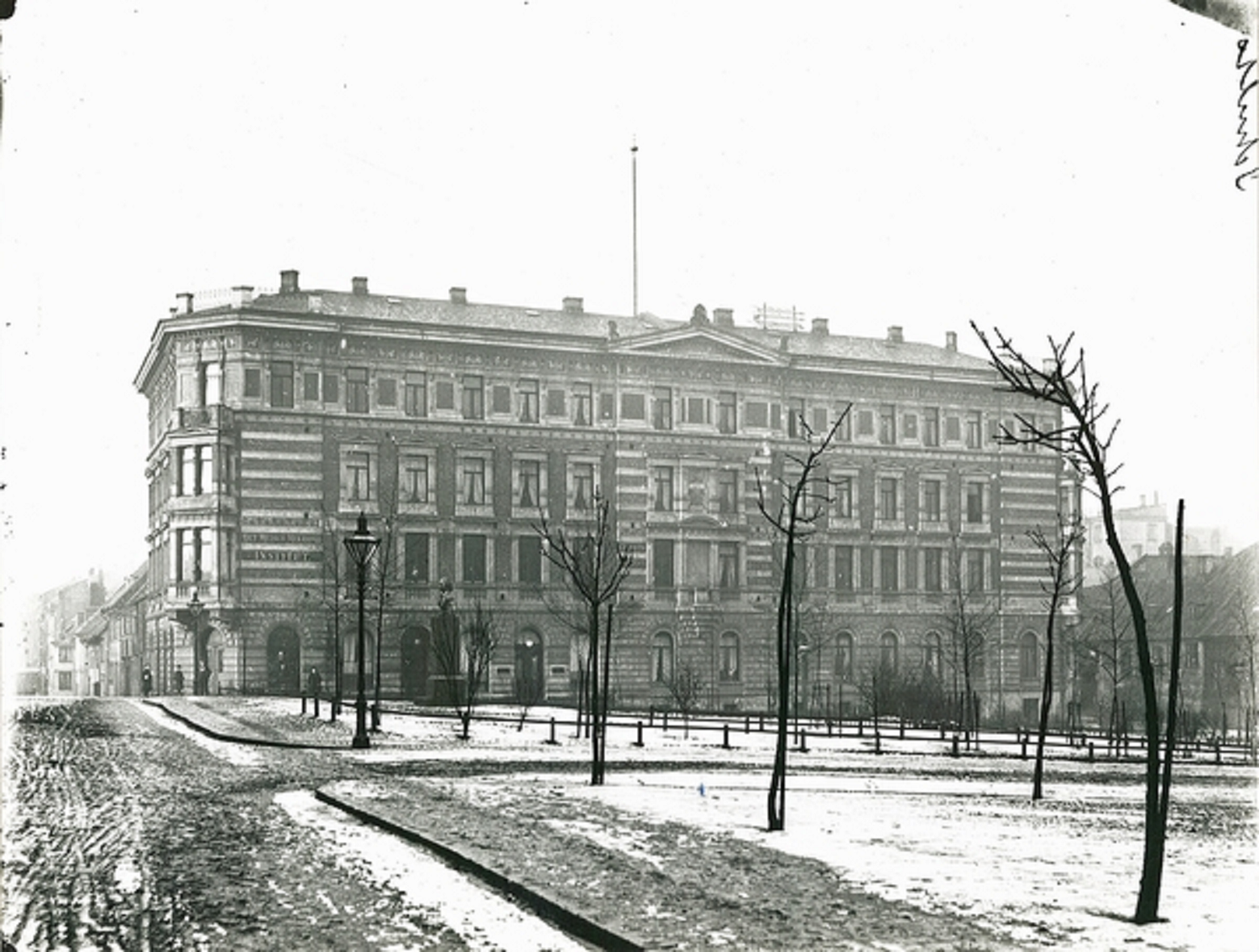 Midt mellom de nye bygningene, via-à-vis Stortinget, lå det helt frem til 1880 et aldrende hjørnehus, kjent som «Brevikgaarden». Dette var av den gammeldagse beboelseshusstilen med steilt tak og takarker. Bygningen og flere andre små bygårder i samme gateløp ble kjøpt opp av embetsmann Oscar Schiöll fra hans svigerfar, Kongelig Taffeldekker Oluf Larsen Tengberg, i 1880. På den store tomten fikk Schiöll oppført en fireetasjers praktbygning i 1881 som var 51 meter bred med flatt tak etter tegninger av arkitekt Henrik Nissen og oppført av byggmester A. Schøyen. Denne skulle siden bli kjent som Schiöll-gården.