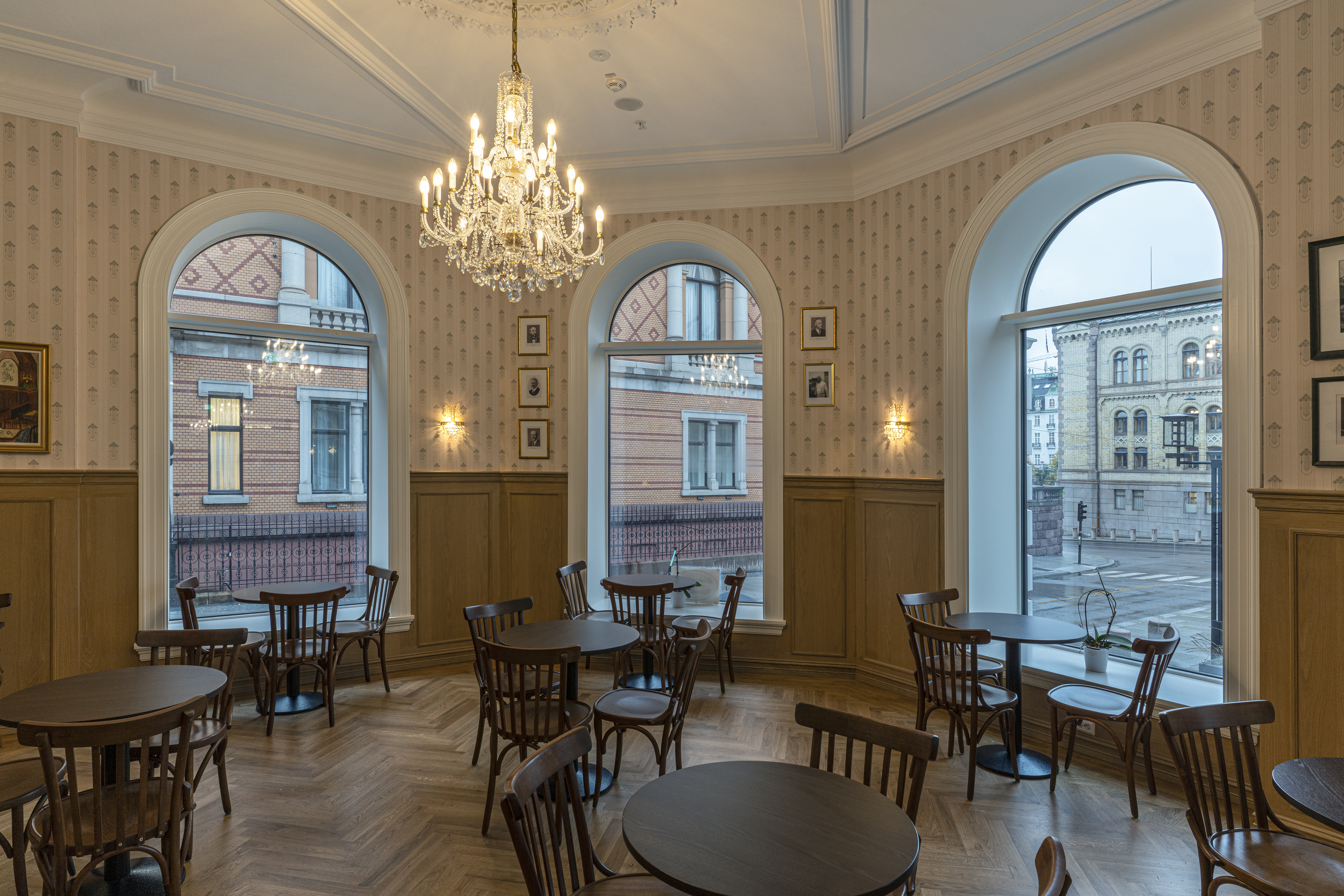 Det ferdigstilte lokalet har fått nydelig eikeparkett i fiskebensmønster inspirert av det nå nedlagte Wiener Cafèet i Stockholm. Veggene prydes av lyse eikepanel akkompagnert av en beigefarget tapet i jugendstil, og man finner samme tapet i en grønntone i rommet innenfor, der herrene tidligere inntok karbonadesmørbrød.
