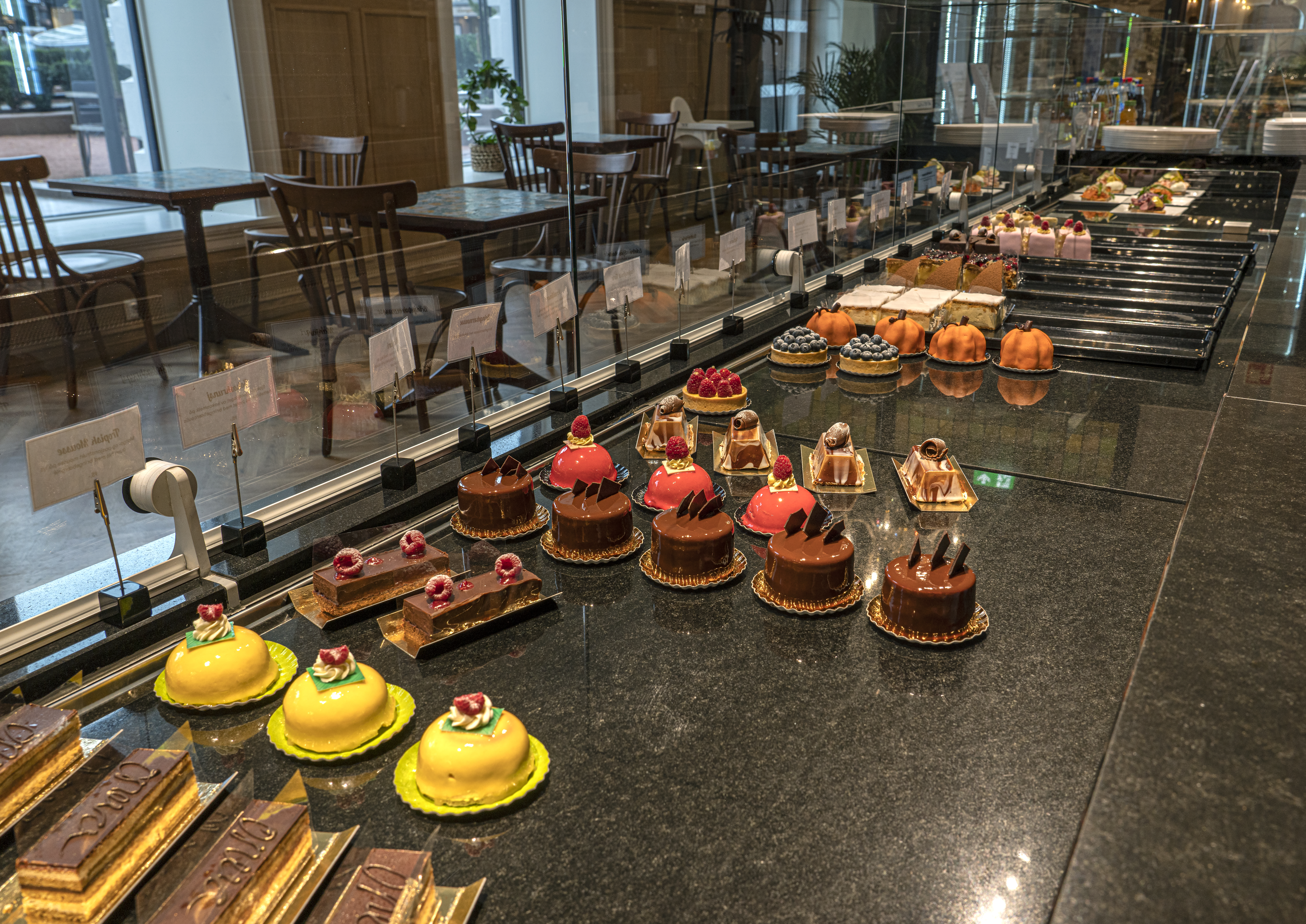Maten ble servert på stilfulle plettbrett med hanker og runde kakefat med stett. Tunge gullrammer kan ha skjult gyldenlærtapeten som dekket veggene. Dette, sammen med gullforgylte vindusgerikter, sortmalte dørkarmer og store malte rosetter i taket, må ha gitt inntrykk av grenseløs overflod og dramatikk, som seg hør og bør i datidens konditorier.