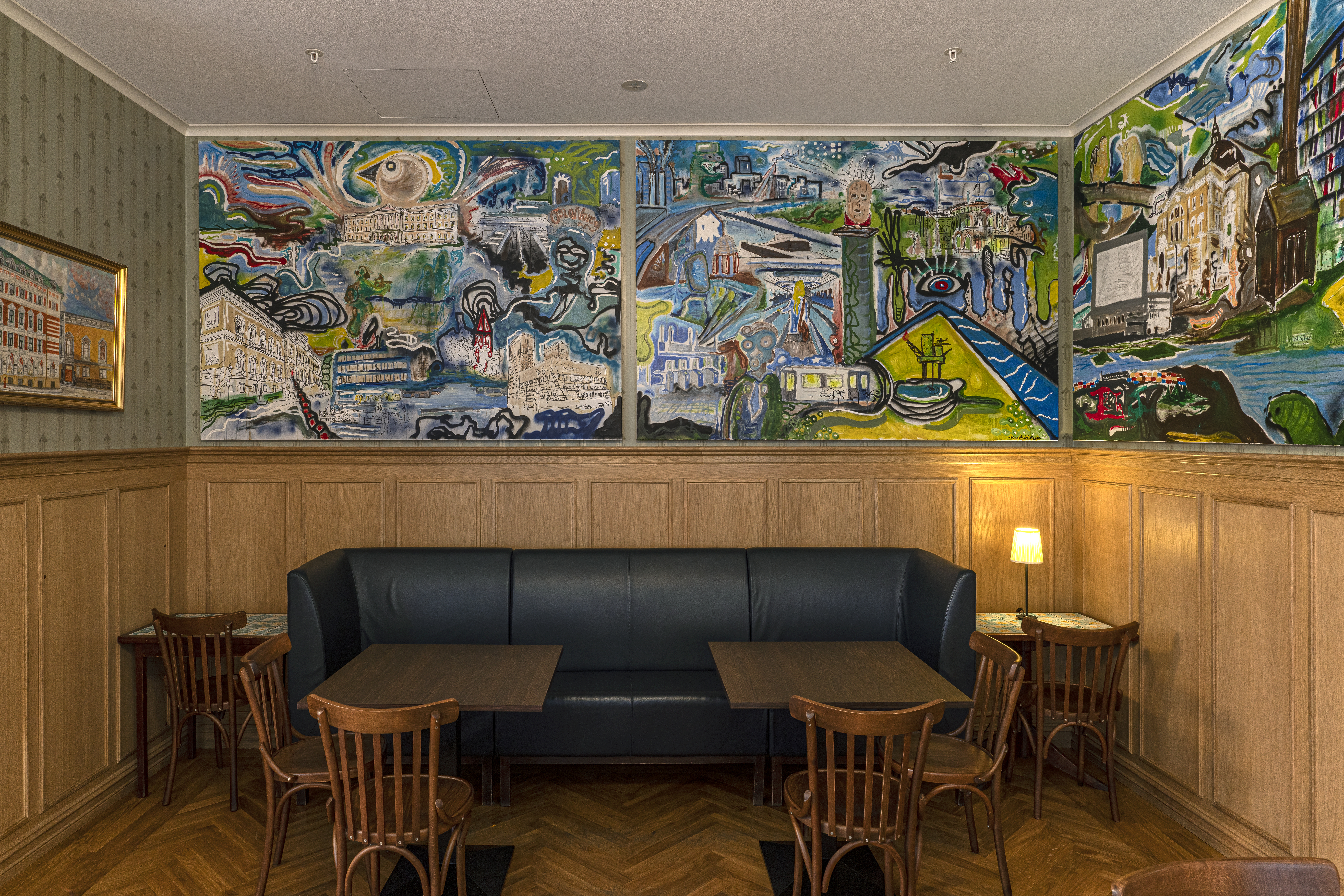 Den russiske interiørarkitekten Elena Potresova har spesialdesignet den grønne hyllen bak disken. En av eierne, Jørn Ødegård har i tillegg invitert flere samtidskunstnere til å dekorere veggene, som en slags kontrast til en klassisk estetikk. Live Haug Hilton, Hanna Duna og Kim André Hagens malerier domineres av kraftige penselstrøk som forestiller romvesener, dommedag og «terrorpotter». Her finnes elementer som forgylte og brukte nesesprayflasker blandet med klassiske og ikoniske bygninger i hovedstaden. «Storebror ser deg» er hovedbudskapet i maleriene og det hele blir en kakofoni av voldsomme fargekomposisjoner og symbolikk.