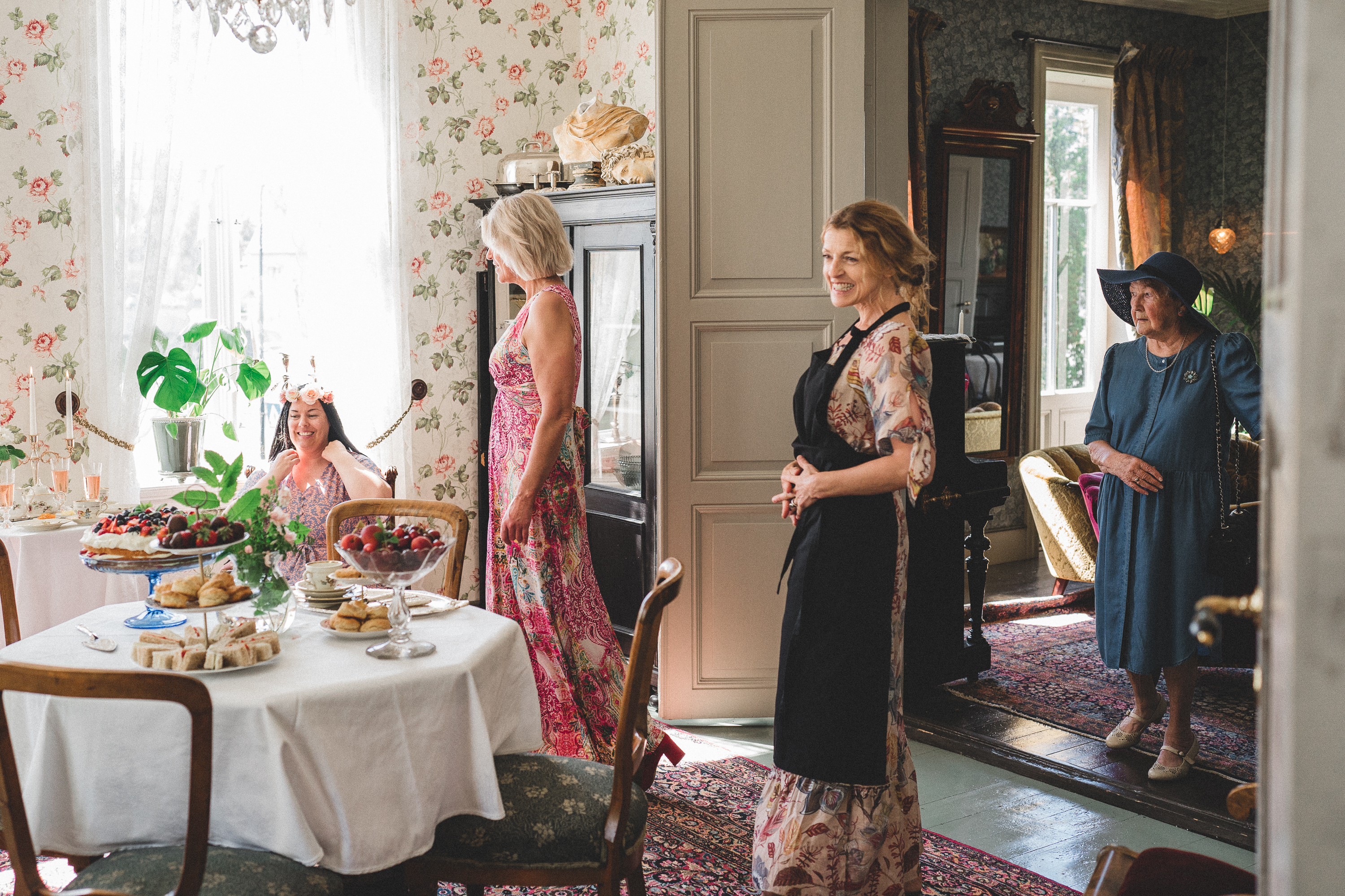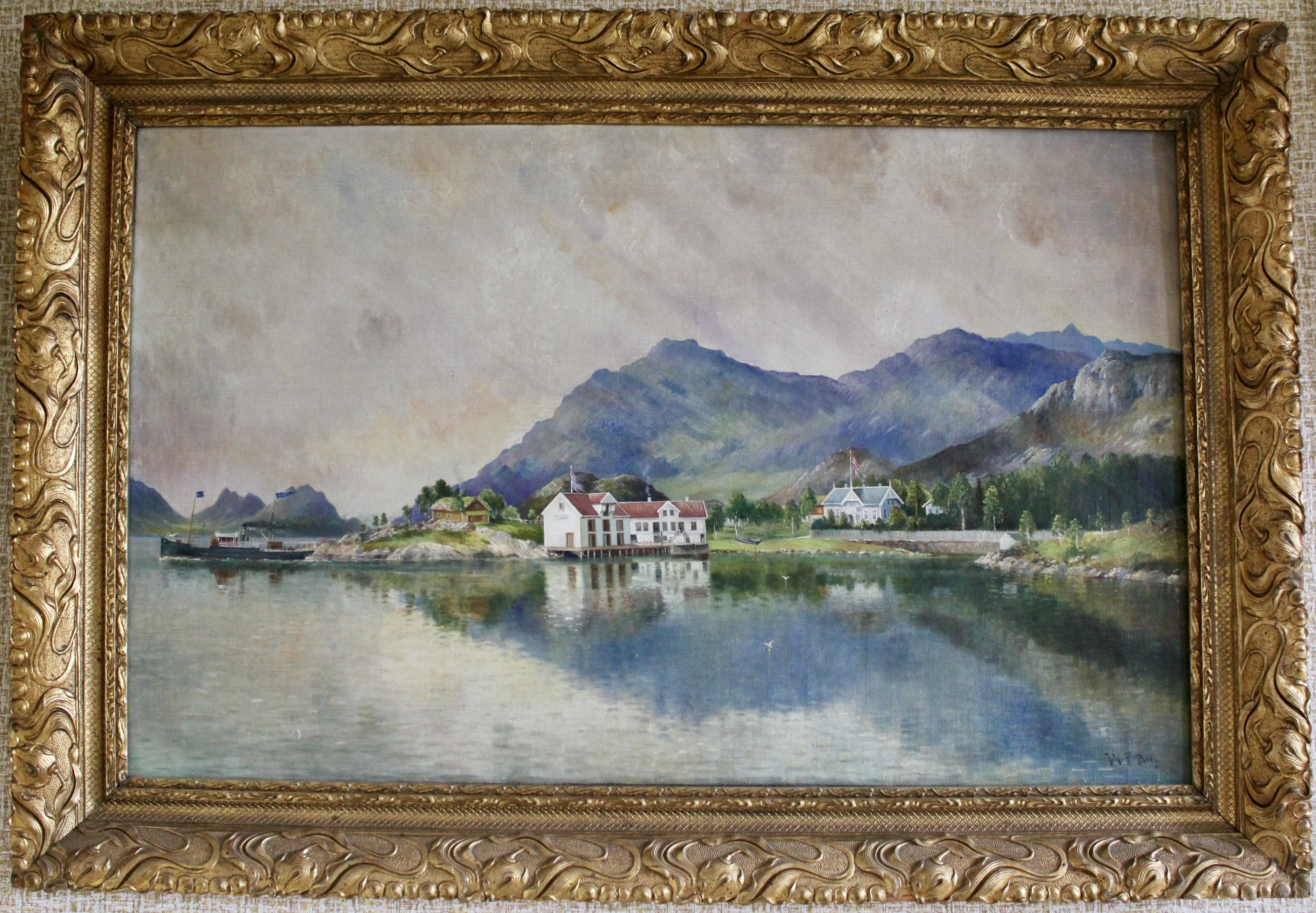 Eit stort og vakkert maleri av husa og eigedomen har vi fått kjøpt attende. Dette har vore til inspirasjon for oss i gjenskaping av husets fasade og fargar. Vi har søkt i bildearkiver, spurt og gravd for å få mest mogleg informasjon om både interiør og eksteriør. Snakka med alt av bygningsvernere og spesialistar på både maling og tapeter, reist i både inn- og utland for å finne tapeter eller for å gjenskape dei.