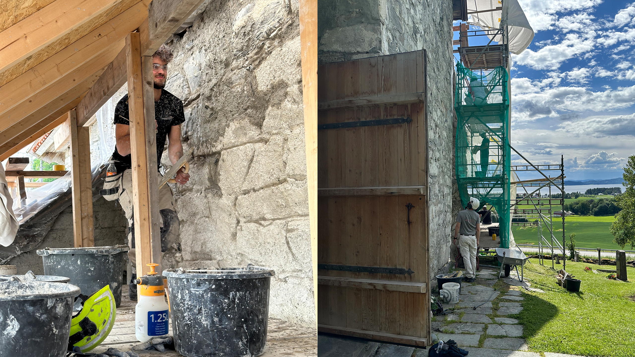 Siden har lokalsamfunnet på Inderøya aldri vært helt klar til å lukke døra på kirken. På denne varme trønderske sommerdagen i juni 2024 dekker en stillas sørveggen og unge og eldre murere står side om side med spader i hånd.