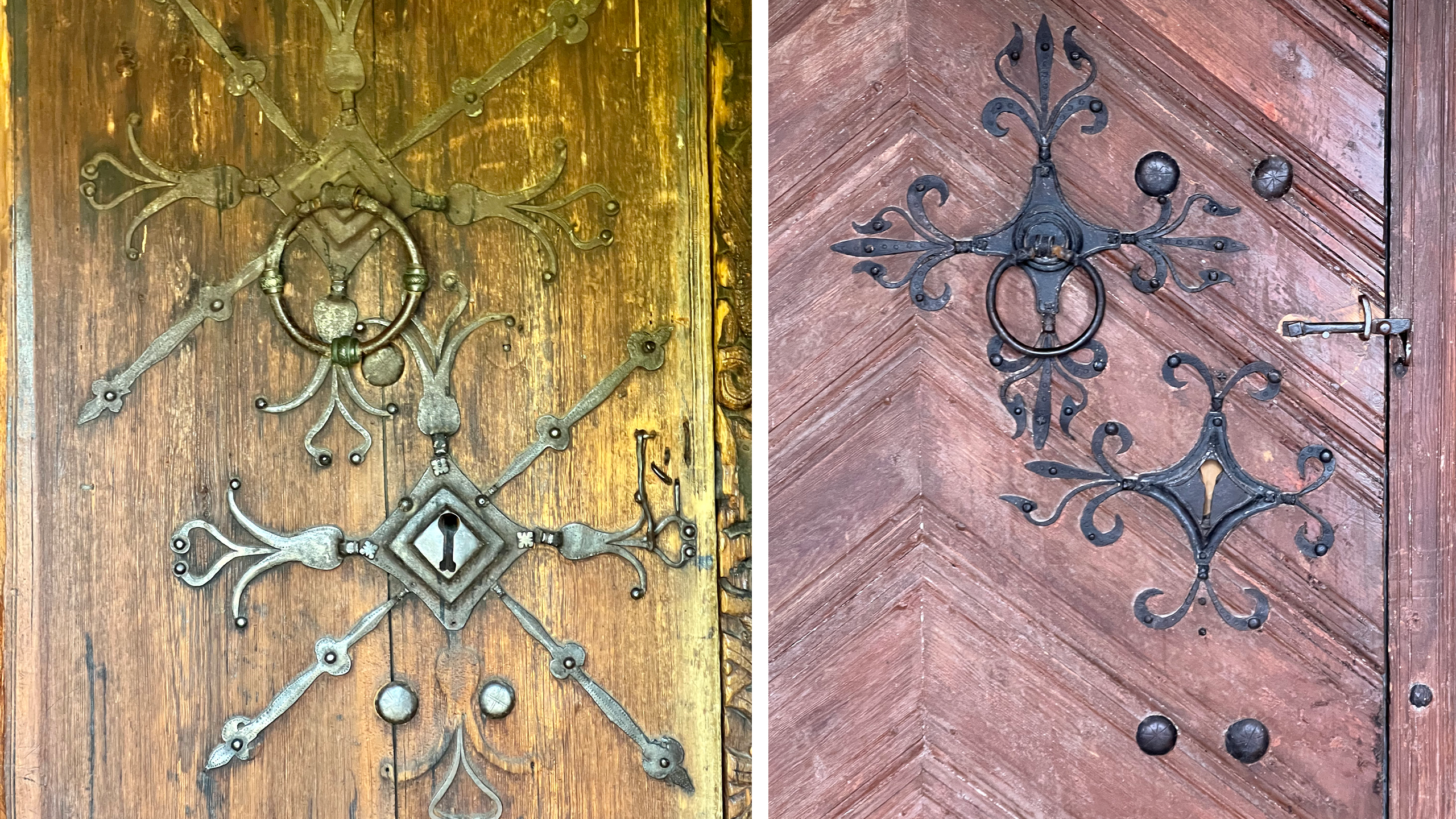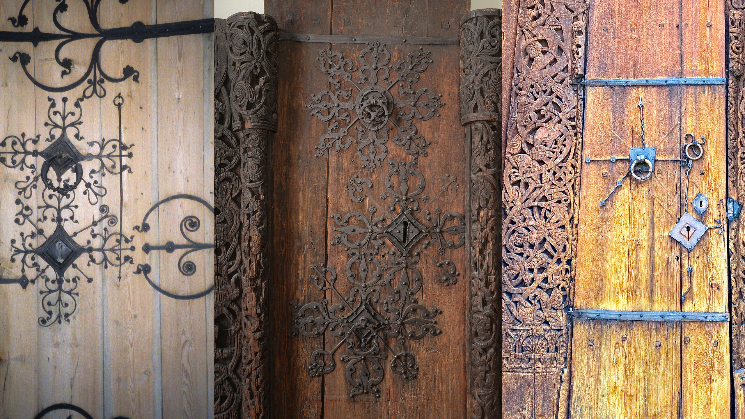 Disse sammenlikningene gjelder beslag og gangjern. Det jeg ikke har nevnt, er dørringene ettersom de varierer mye innen hvert område, men har en viss utvikling fra de eldste til de yngste. De eldste som vi finner for eksempel i Urnes stavkirke, er enkle ringer, som oftest med et drakehode som stopper på hver side av holderen. På senere kirker, for eksempel Nykirke steinkirke, har ringen plastiske draker som kryper oppover hver side mot ringfestet. Hodene danner stoppere også her, mens halene tvinner seg sammen nederst på ringen.