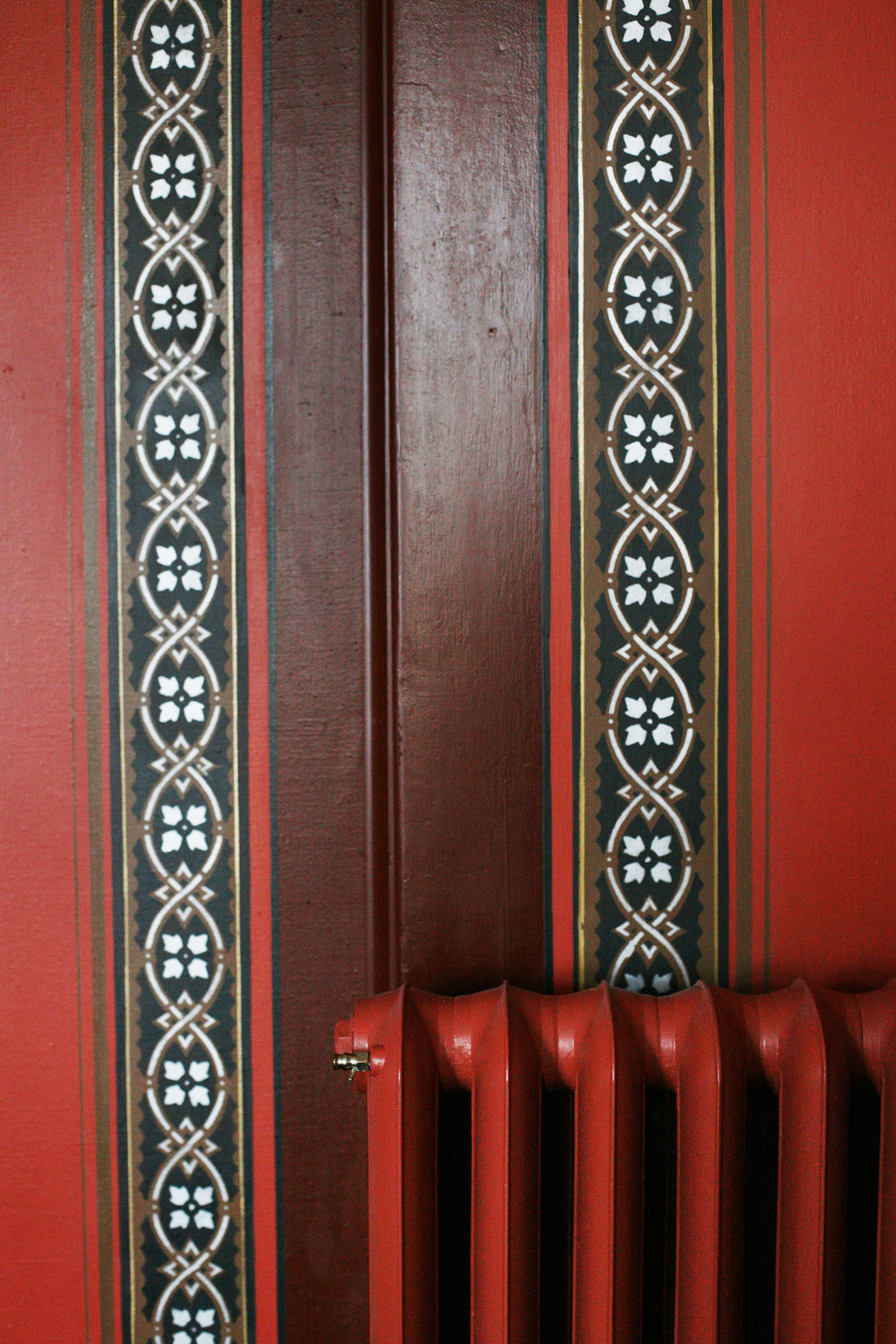 Som en del av sjablong- og strekdekoren er det trukket 540 meter med strek på frihånd med pensel og linjal på vegger og brannmur, og cirka 50 meter på gulvet.