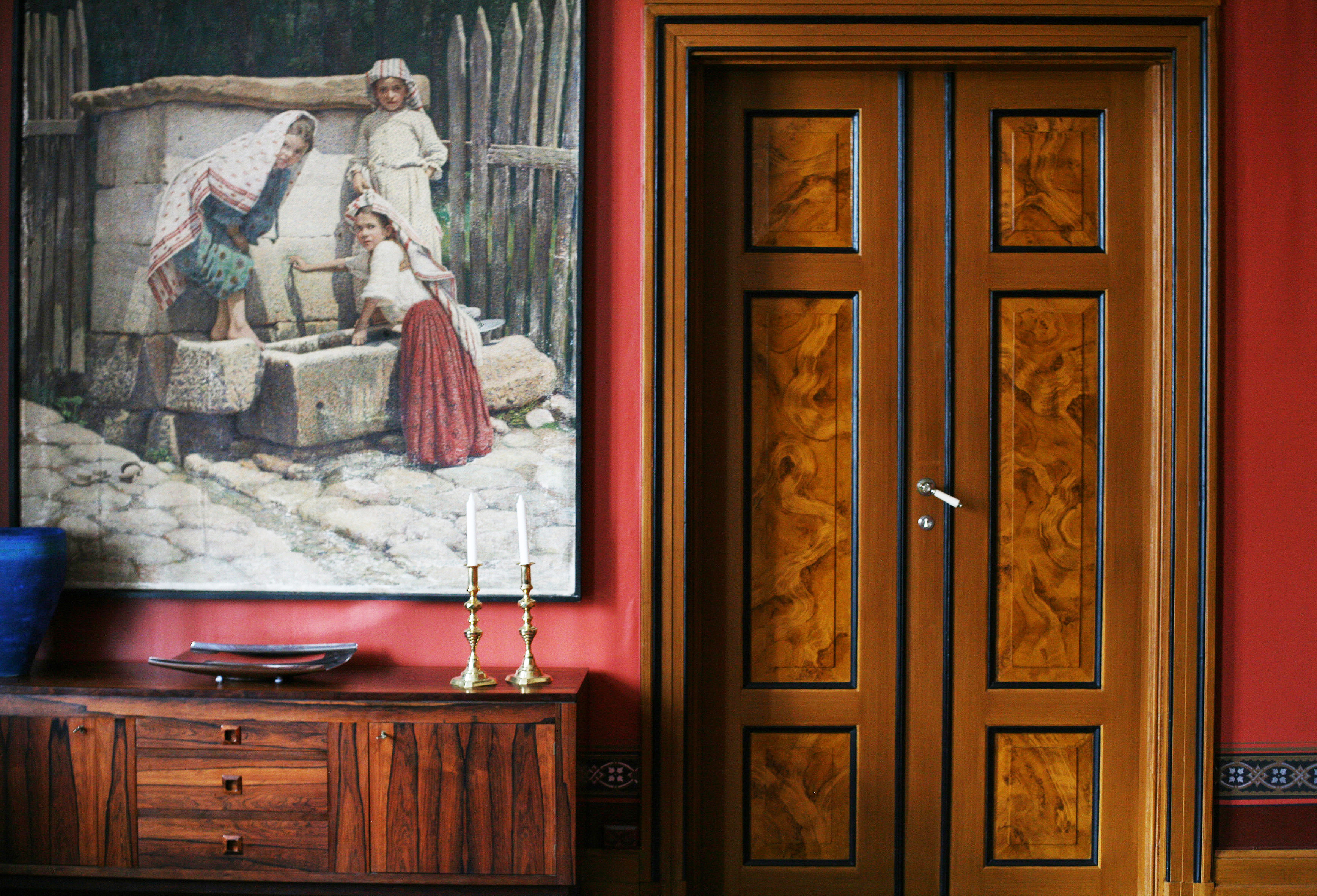 - Alle dørene i første etasje har vært dekorert med mahogniådring på ene siden og nøttetresådring på andre siden. Oppe var dørene ådret med eik. Regnskapsføreren brukte altså penger på dekorasjonsmaling, påpeker Brænne begeistret. Fargene ble etter all sannsynlighet blandet i de ulike rommene i sin tid.