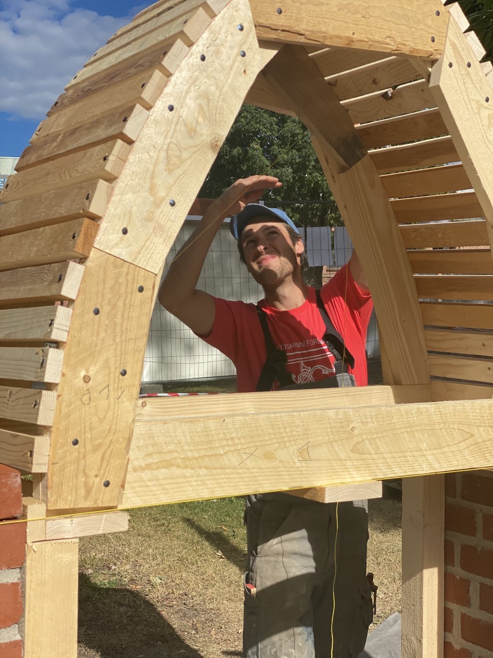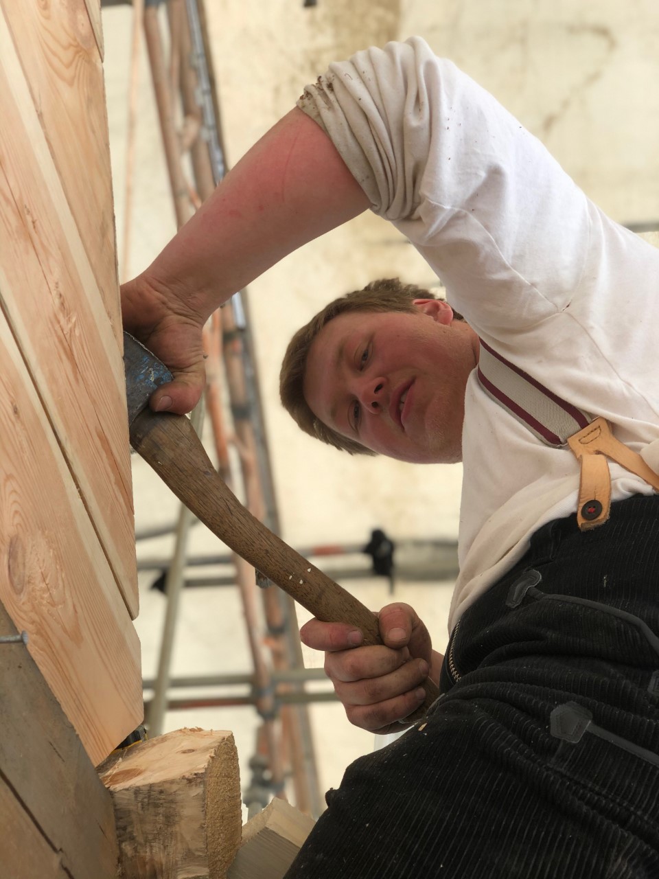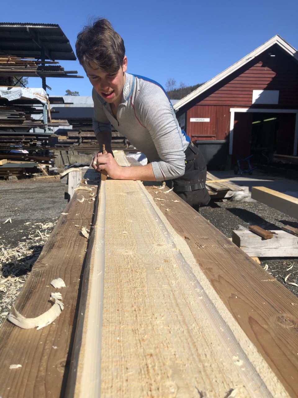 Anton har fått sansen for gamle hus, verktøy og hvordan ting ble laget og bygget før i tida, med fokus på materialkvalitet og riktige materialer til riktig bruk. Elhøvler og spikerpistoler er han ikke begeistret for. Han er til vanlig tømrerlærling hos Pass Bygg AS. Anton har tidligere deltatt på Fortidsminneforeningens kurs på Maihaugen der han var med på å bygge en stolpverkskonstruksjon. Vi merket oss en glimrende høvelføring og en imponerende tålmodighet.