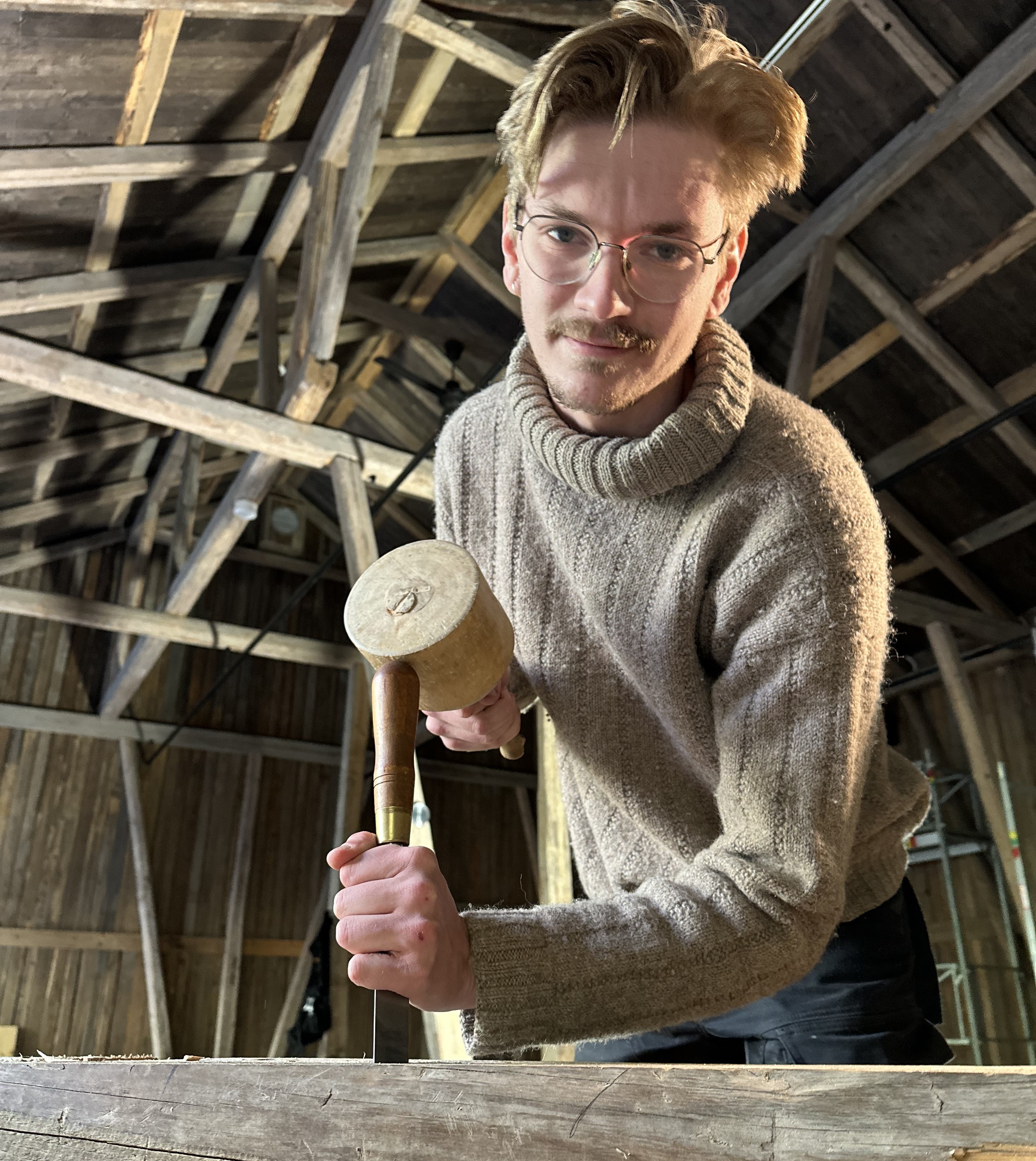 Den unge tømreren har tidligere jobberfaring med tradisjonshåndverk, og har deltatt på kurs og dugnader i regi av Fortidsminneforeningen. Han har stor interesse for håndverk, kultur- og bygningshistorie og har som mål å videreutvikle seg innenfor faget. Han har tatt svennebrev som tømrer hos BasisBygg i Trondheim.