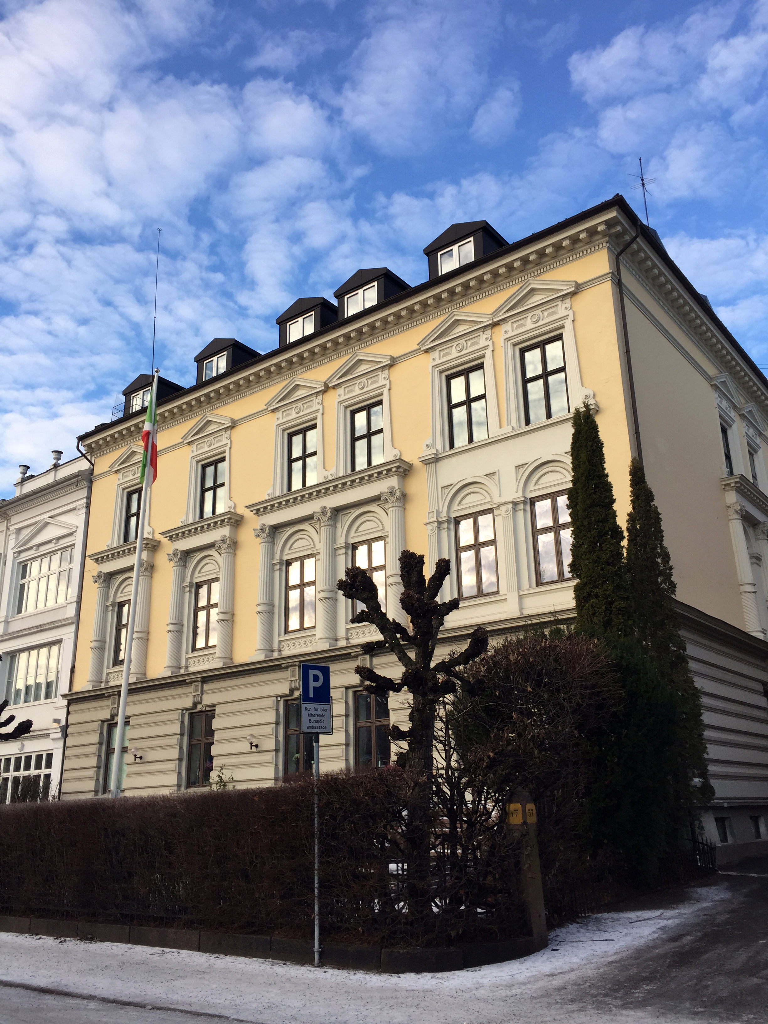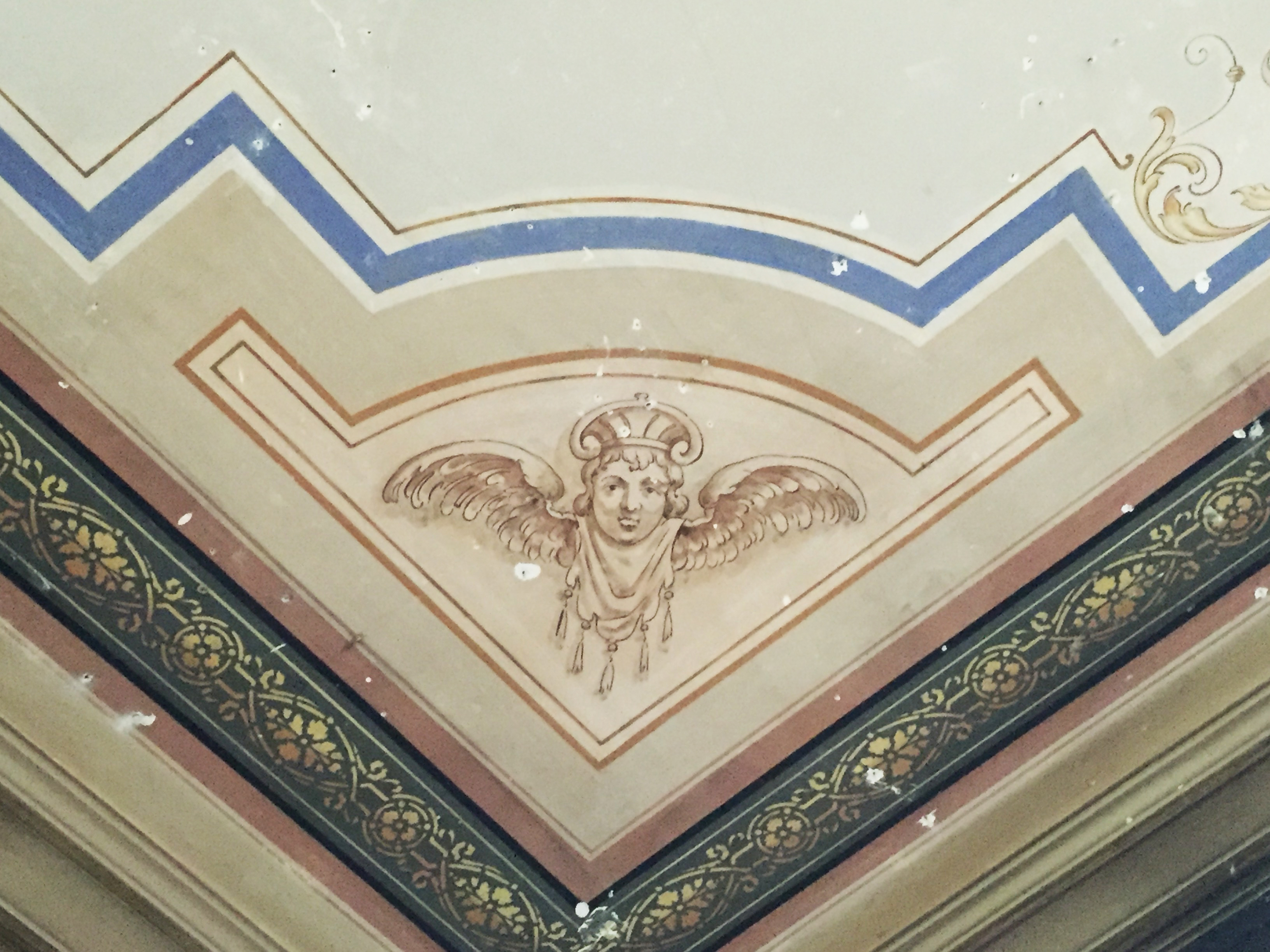 Englene i Oscars gate 57 i Oslo «flyver» ikke ned i skjul «med paradis grønt», men holder seg oppe i taket, og det er ikke så mye grønt der de bor heller. Det er mest gull, brunt, variasjoner av beige og steinfarget pluss noen gråblå felt med nesten skulte Bacchus-hoder i og noe lysere blå linjer langs den dyp-gulne stukkaturen.