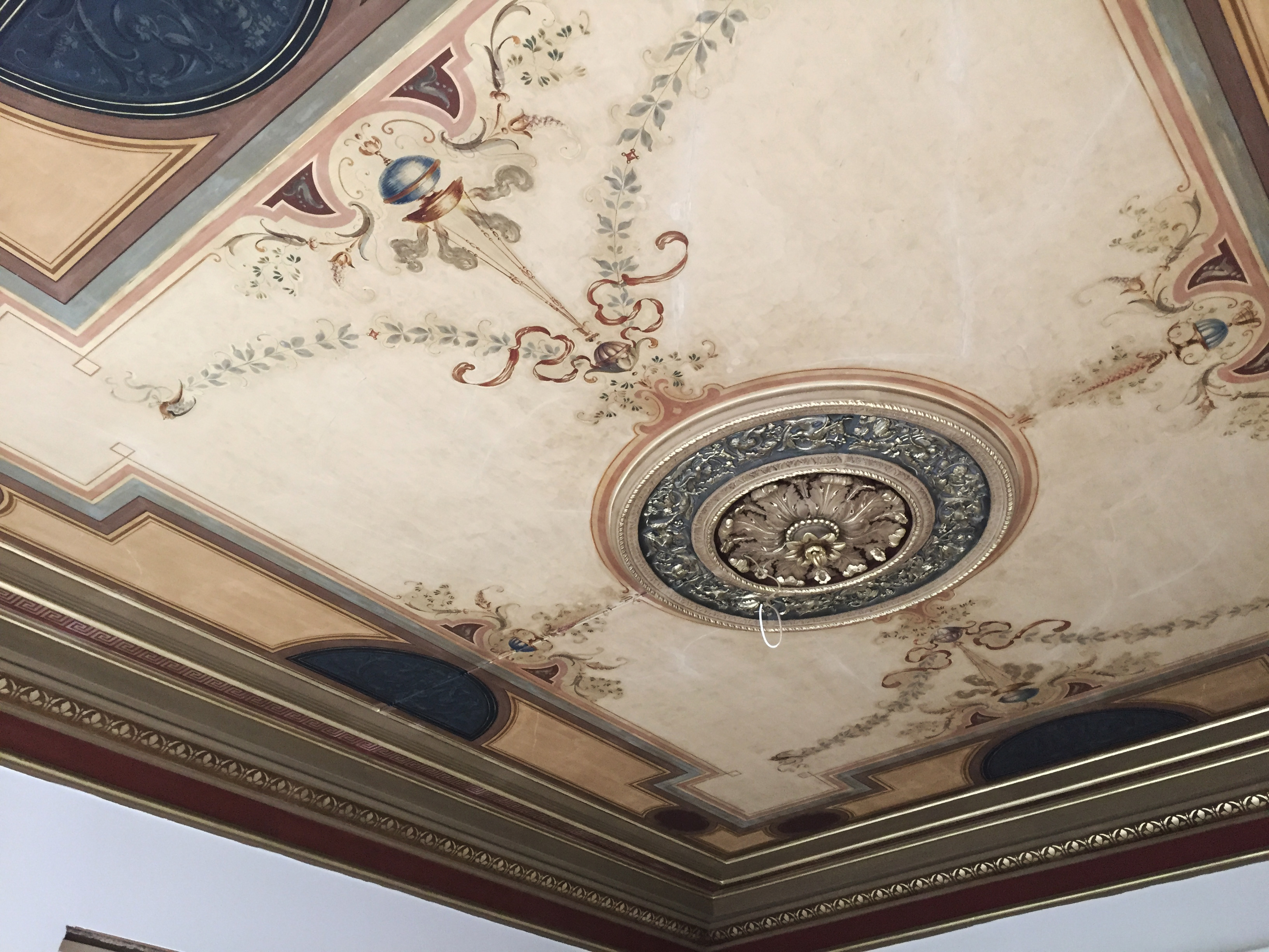 Grunnen til at takmaleriet i hovedstuen ikke var overmalt eller ødelagt i årene løp, forteller Tom Lorentzen, er trolig at første etasje i bygningen lenge ble brukt som herreklubb. Og når medlemmene koste seg med en pjolter eller spilte biljard, passet det jo fint med litt engler og blomsterranker og fugler i taket.