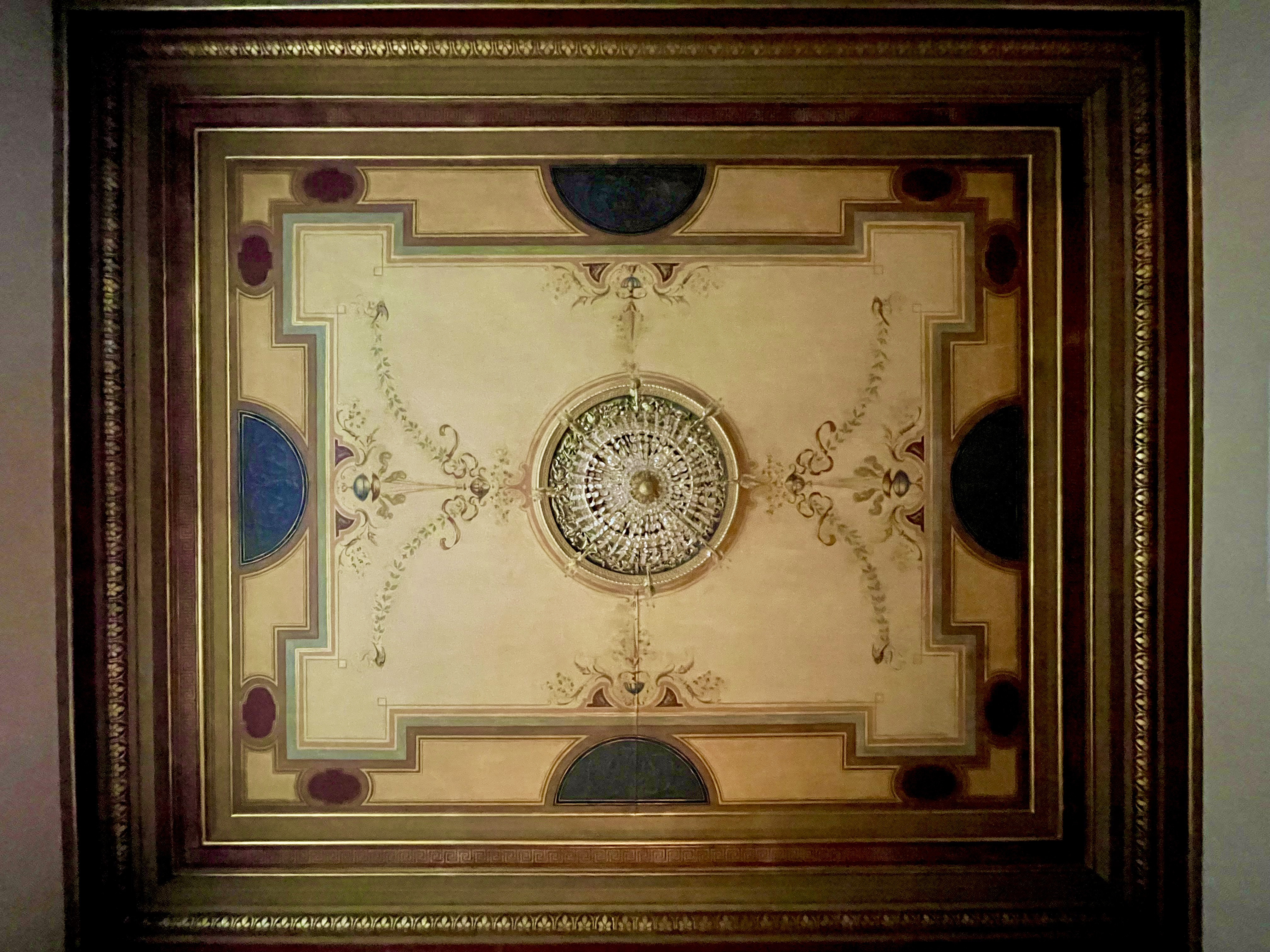 Taket er ifølge Malmberg ikke direkte inspirert av antikken, og er ganske nedtonet i forhold til den pompeianske stilen som ble populær på 1700-tallet. Det har sannsynligvis tatt sitt utgangspunkt i 1500-tallets renessansetak, men strammet opp i en mer viktoriansk stil.