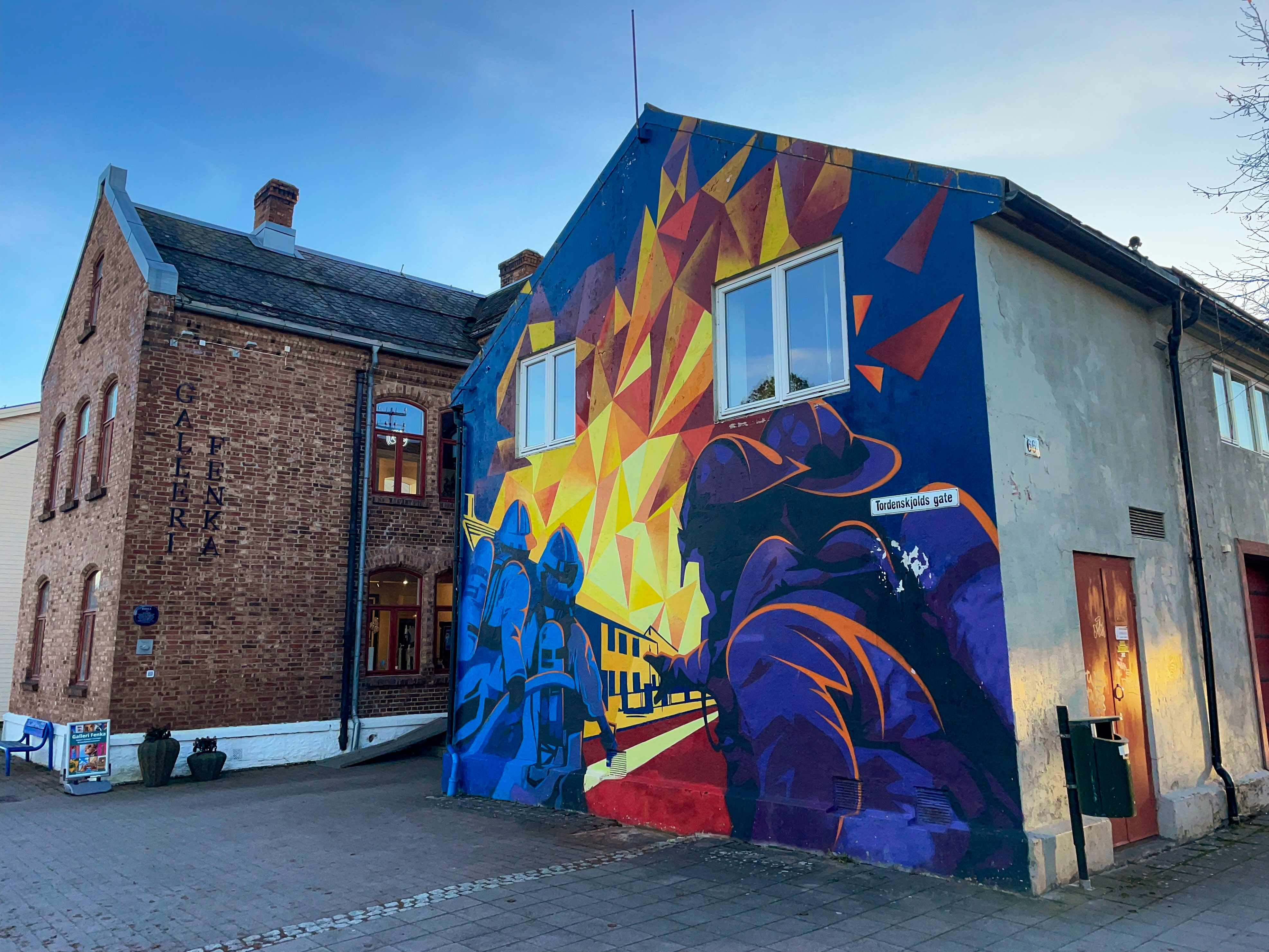 På vei hjem fra nord kjører du gjennom Kirkegata fra motsatt side. Du kommer til å passere en murblokk ved siden av kunstgalleriet Fenka med en stor graffiti-illustrasjon av brannmenn som slukker flammer. Når du kjører gjennom sentrum plukker du meg opp ved busslommen utenfor Kirkegata 7. Om et par minutt er vi straks på E6 og Alstadhaug kirke vil snart vinke oss god tur.