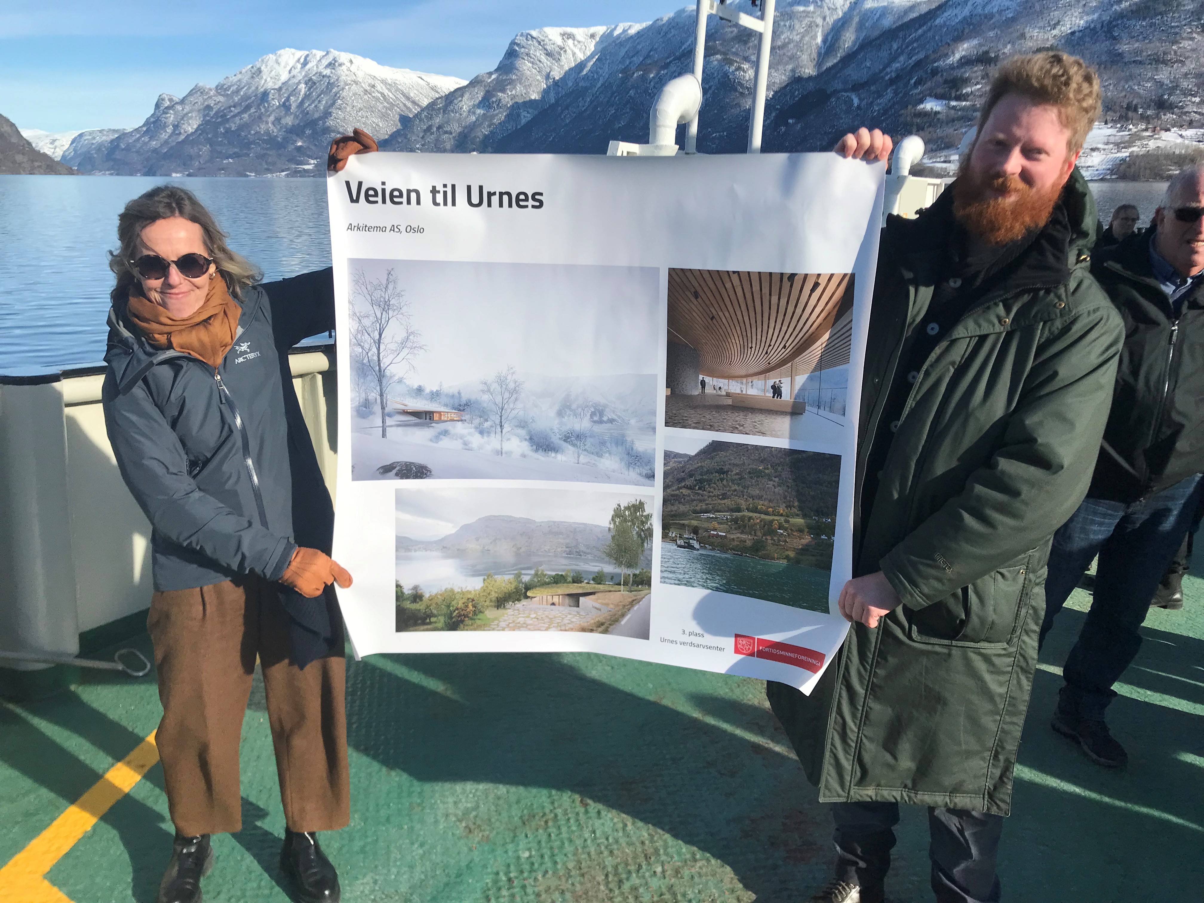 Vinnarutkastet og 2. og 3. premien vart offentleggjort ombord på MF Urnes, ferja mellom Solvorn og Ornes, den vesle bygda med den verdskjente attraksjonen Urnes stavkyrkje frå ca 1130. Ferja vart liggande midtfjords under seremonien, med utsikt til tomta der det nye besøkssenteret skal byggast og stavkyrkja på høgda bak.