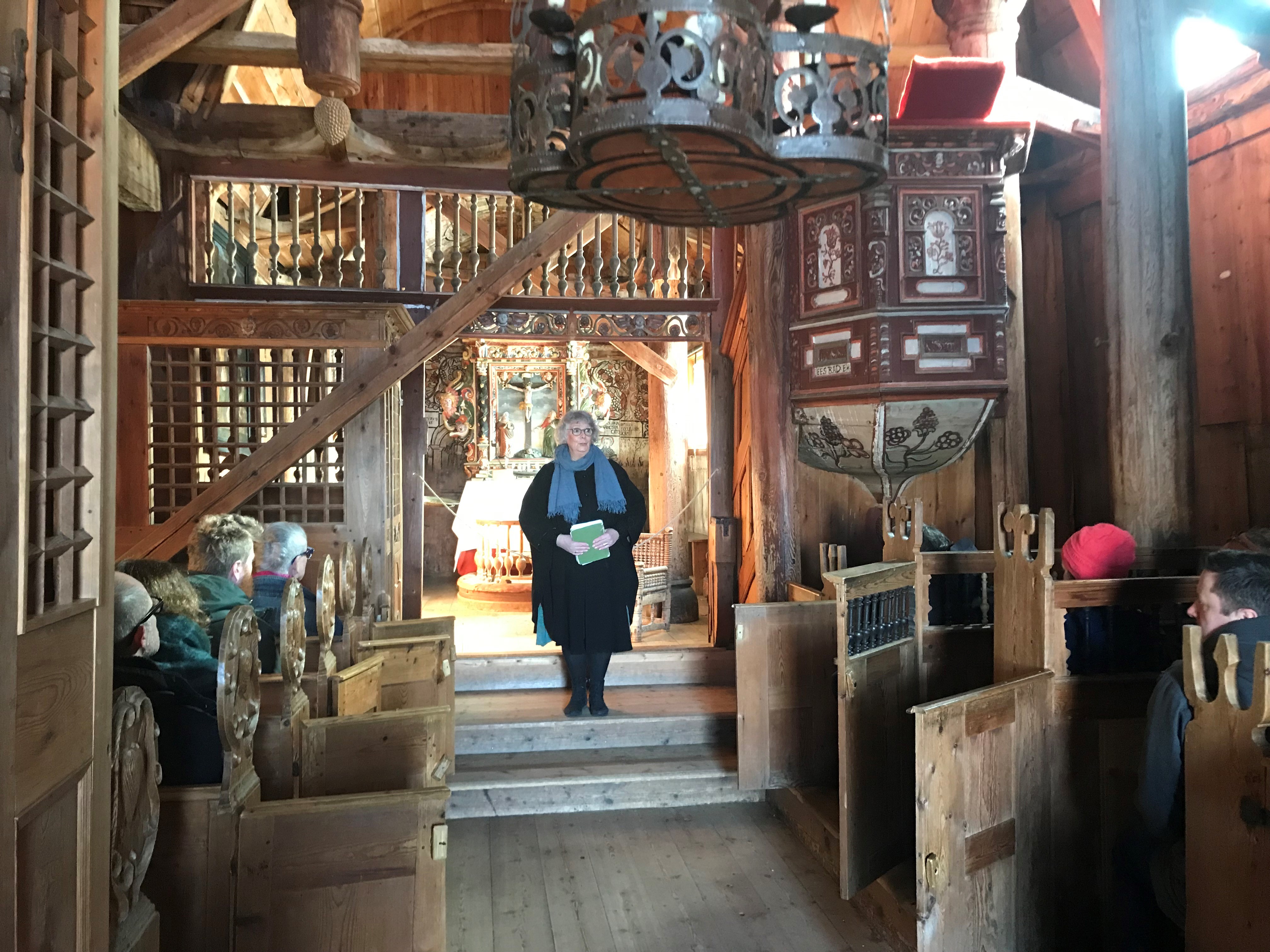Inne i stavkyrkja fortalde kunsthistorikar og styreleiar i Fortidsminneforeininga Margrethe C. Stang kort om historia til dette smykket av ei kyrkje, følgd av vakre tonar av folkesongaren Judith Vestrheim.