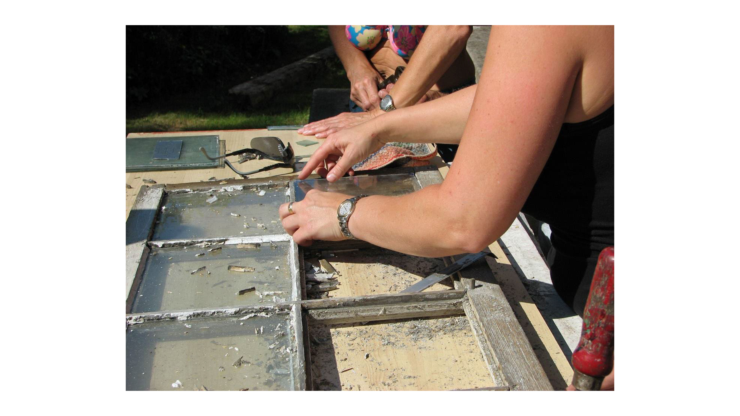 Begynn med å ta ut glassene ved å løse opp kittet med en kittlampe. Vær nøye med å merke hvert vindusglass; hvilken ramme de sitter i, og hvor i rammen de skal sitte, hva som er opp og ned, samt hvilken side som skal sitte innover/utover.