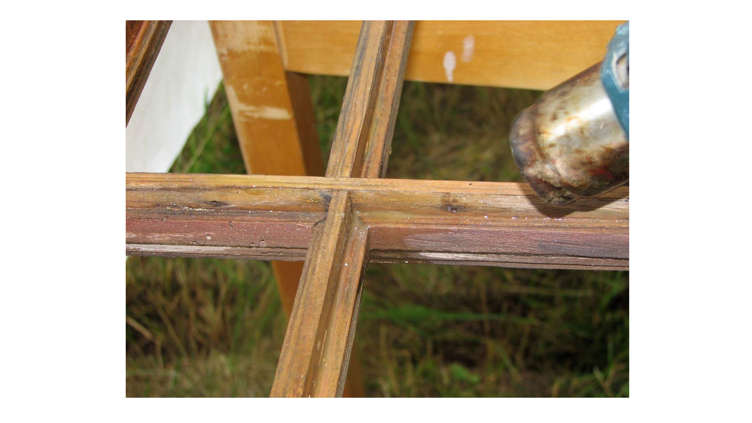 Når malingen er fjernet kan man bytte skadete deler på karm og ramme.