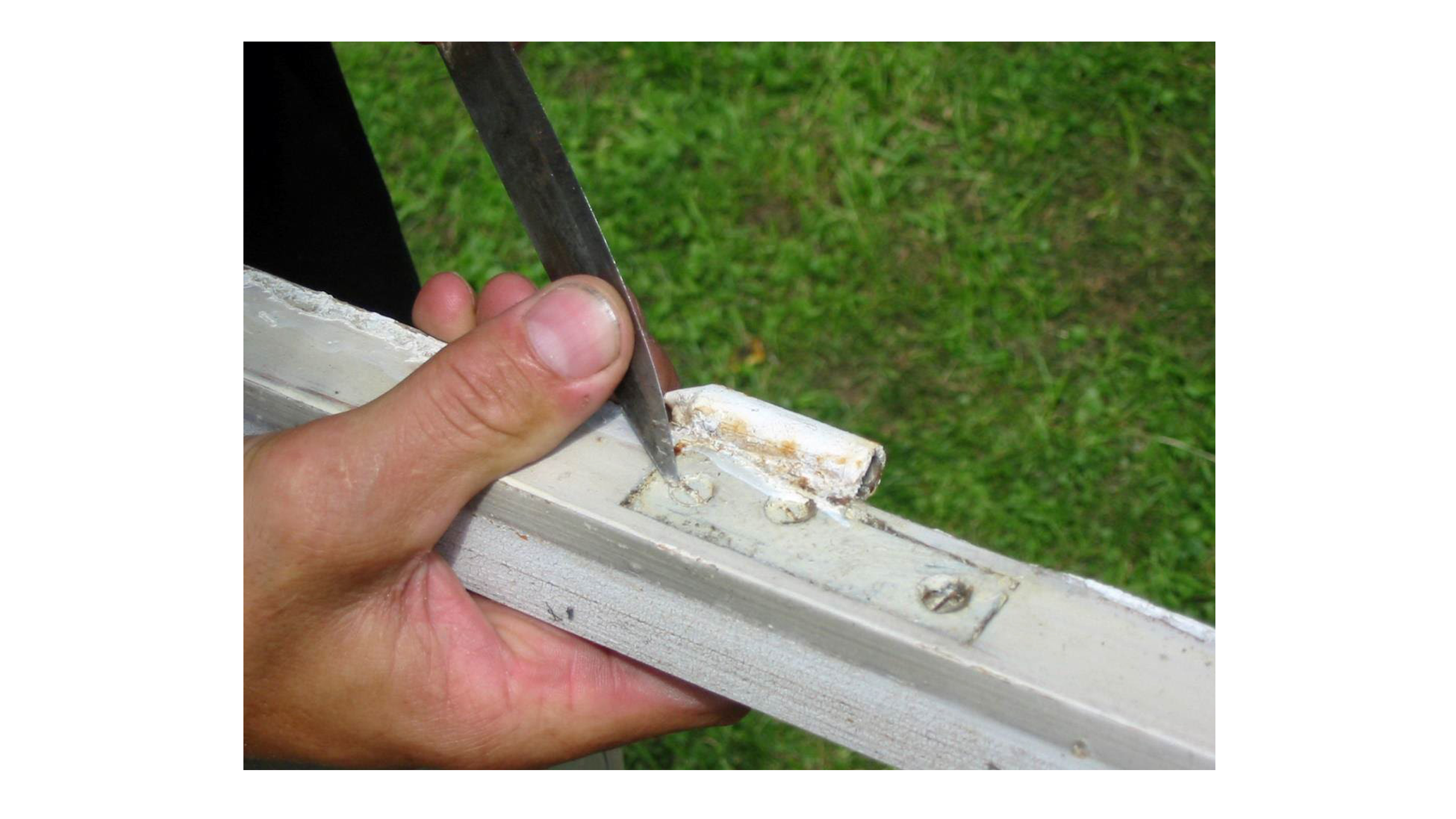 Maling fjernes fra karm og ramme med Speedheater. Varmluftspistol kan brukes på rammen, men aldri på karmen, fordi risikoen er stor for at varmen fører til at isolering eller annet i bygningskonstruksjonen kan ta fyr.