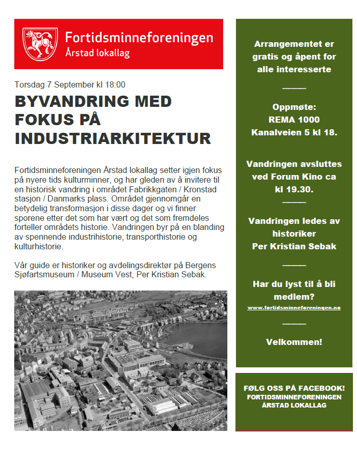 Byvandring med fokus på industriarkitektur Publisert 05.09.2023 Årstad lokallag inviterer til byvandring.