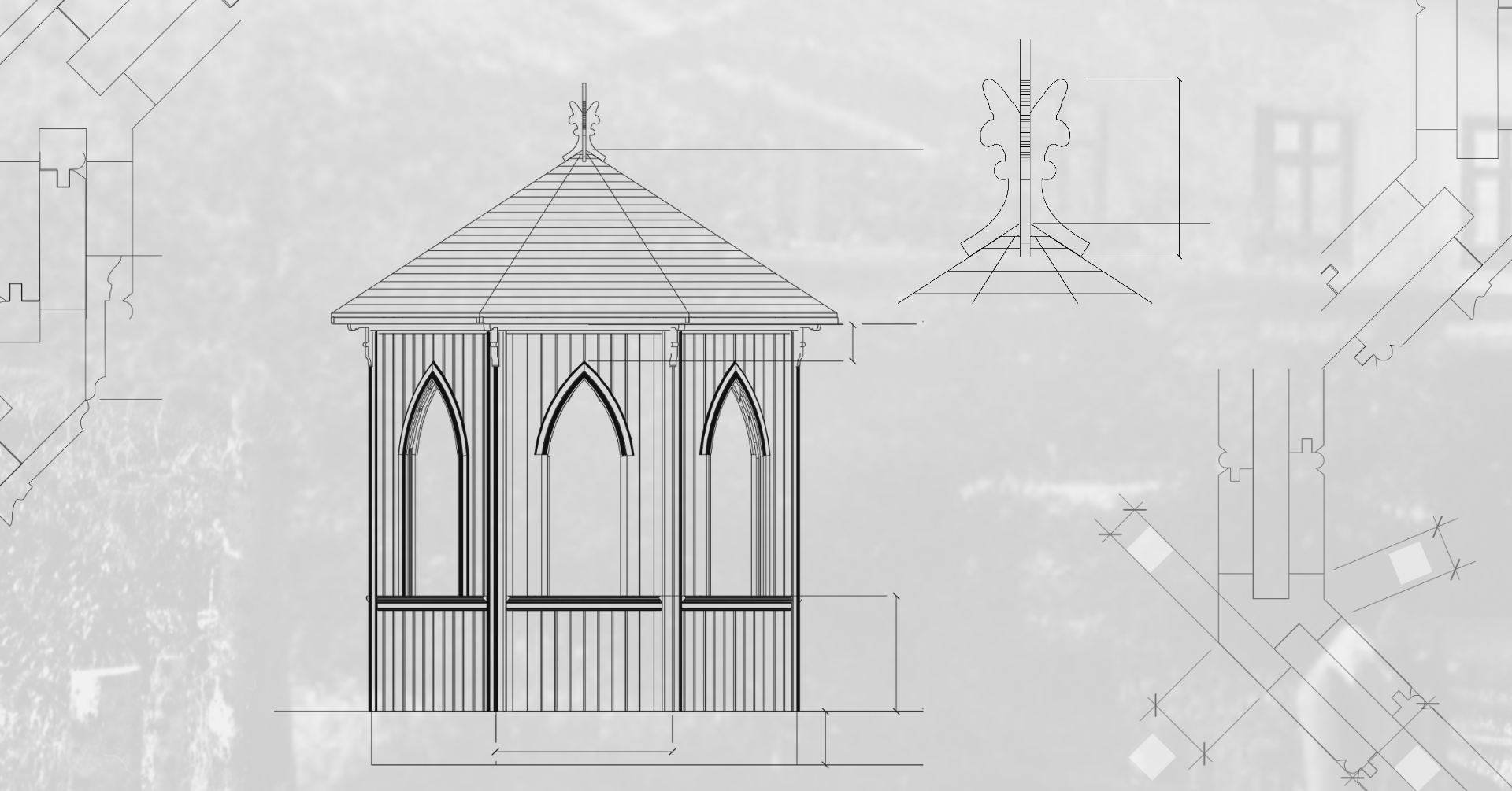 Med utgangspunkt i bevarte bygningsdeler, bildet og lokal byggeskikk skal lysthuset bygges opp igjen. Lysthuset står på holdsteinspunkter med utfyllende tørrmur eller murt med naturstein i forband med luftekanaler for stubbloftsrommet. Antatt dimensjon utvendig: 8-kantet hvor hver veggflate er 1,5 meter. Lysthuset var åttekantet med utvendig mål på cirka 6 x 6 meter, målt med utgangspunkt i benkens dimensjon.
