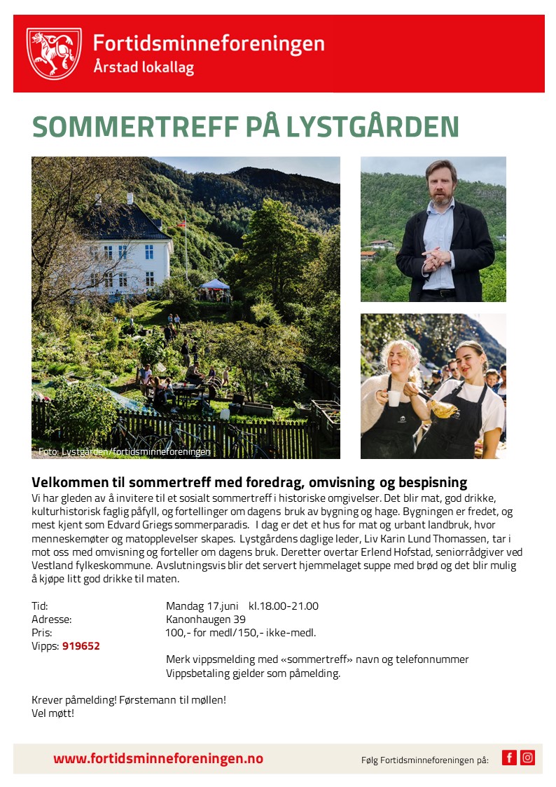 Årstad lokallag ønsker velkommen til sommertreff med foredrag, omvisning og bespisning.