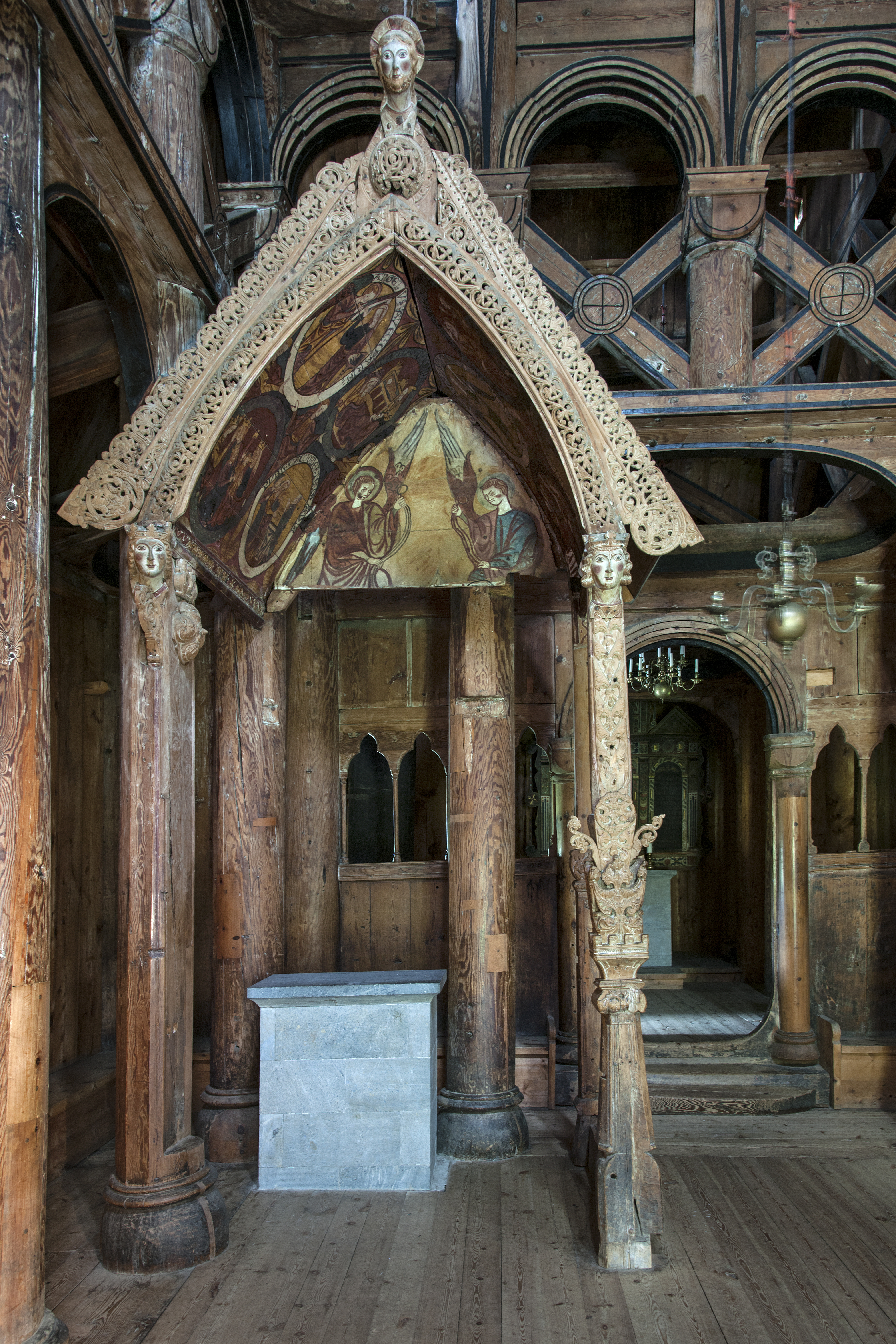 Inne i stavkirken er det en overbygning i tre over et alter. Det antas at den er 700-800 år gammel. Stolpene har de fineste utskjæringer og hvelvingen har vakre og godt bevarte malerier. Dette er en sjelden skatt fra middelalder! Her kan du se den på nært hold i en 3D-modeller: https://skfb.ly/6W9L8